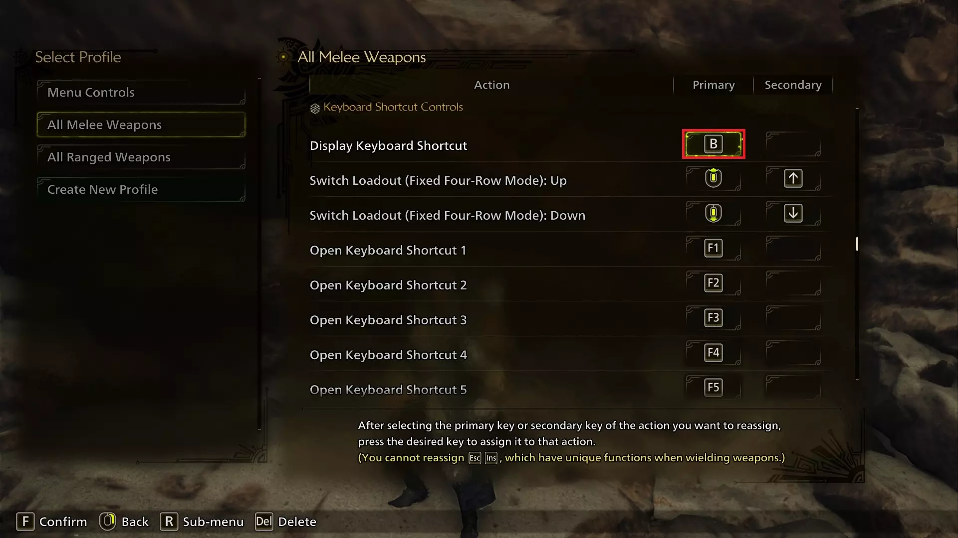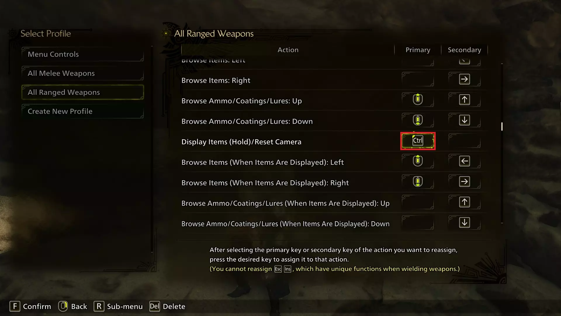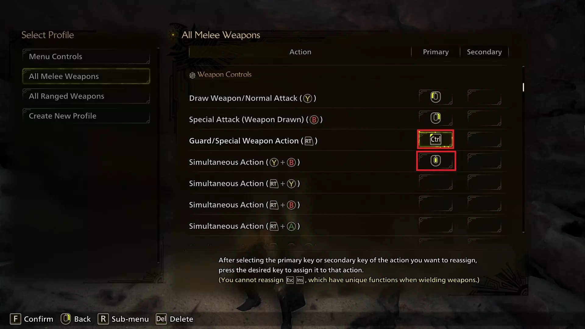 护卫/特殊武器动作已从R键更改为Ctrl键。我在之前的PC版《怪物猎人:世界》等怪物猎人系列游戏中形成的肌肉记忆让我习惯使用Ctrl键,所以如果《怪物猎人:荒野》的新玩家觉得用Ctrl键操作这个动作不自然,可以使用其他按键,比如Q键或TAB键,这些按键在控制设置中可以进行调换,或者如果R键用着最顺手的话也可以继续使用R键。 同步动作(第一个)已从《怪物猎人:荒野》自动分配的按键(可能因鼠标而异,对我来说是鼠标5键)更改为鼠标中键。你可以将此视为可选设置,因为它只是让你能用一个按键同时按下两个鼠标按键。我个人是一名狩猎笛玩家,新的攻击意味着能够快速且不出错地连续输入多次指令非常重要,所以这个按键绑定对此很有帮助。