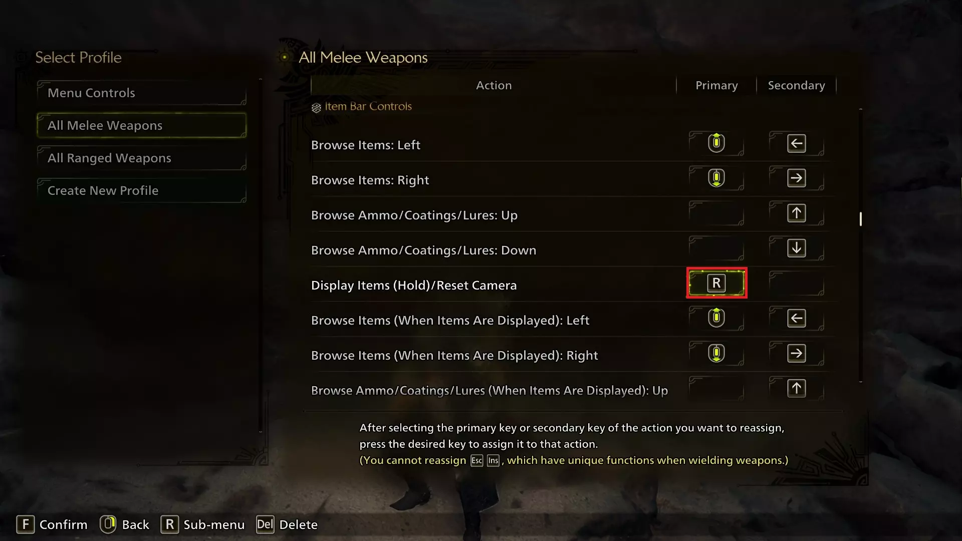 武器攻击应保留为R键。不知为何,此按键与防御/特殊武器动作共享输入会在远程按键设置中触发按键冲突,但在近战按键设置中则不会。 物品栏控制