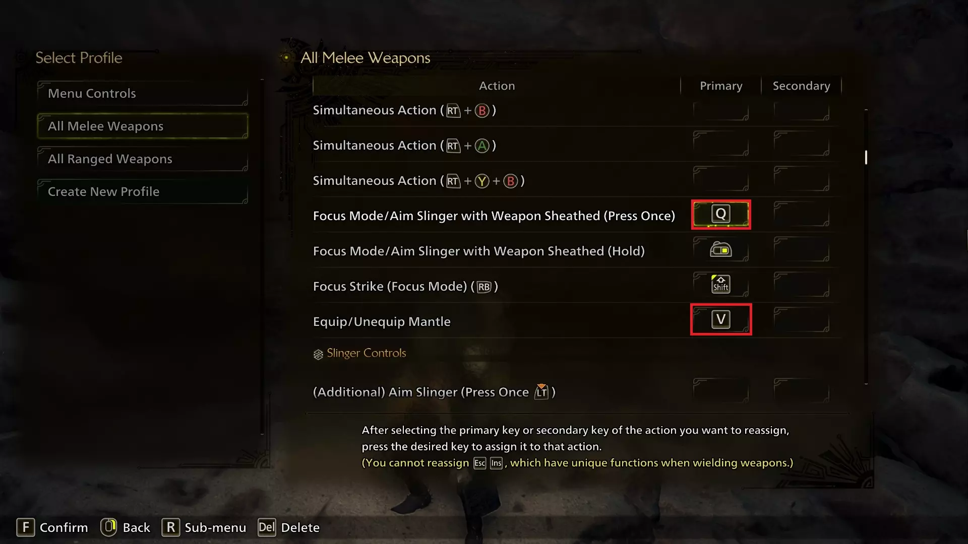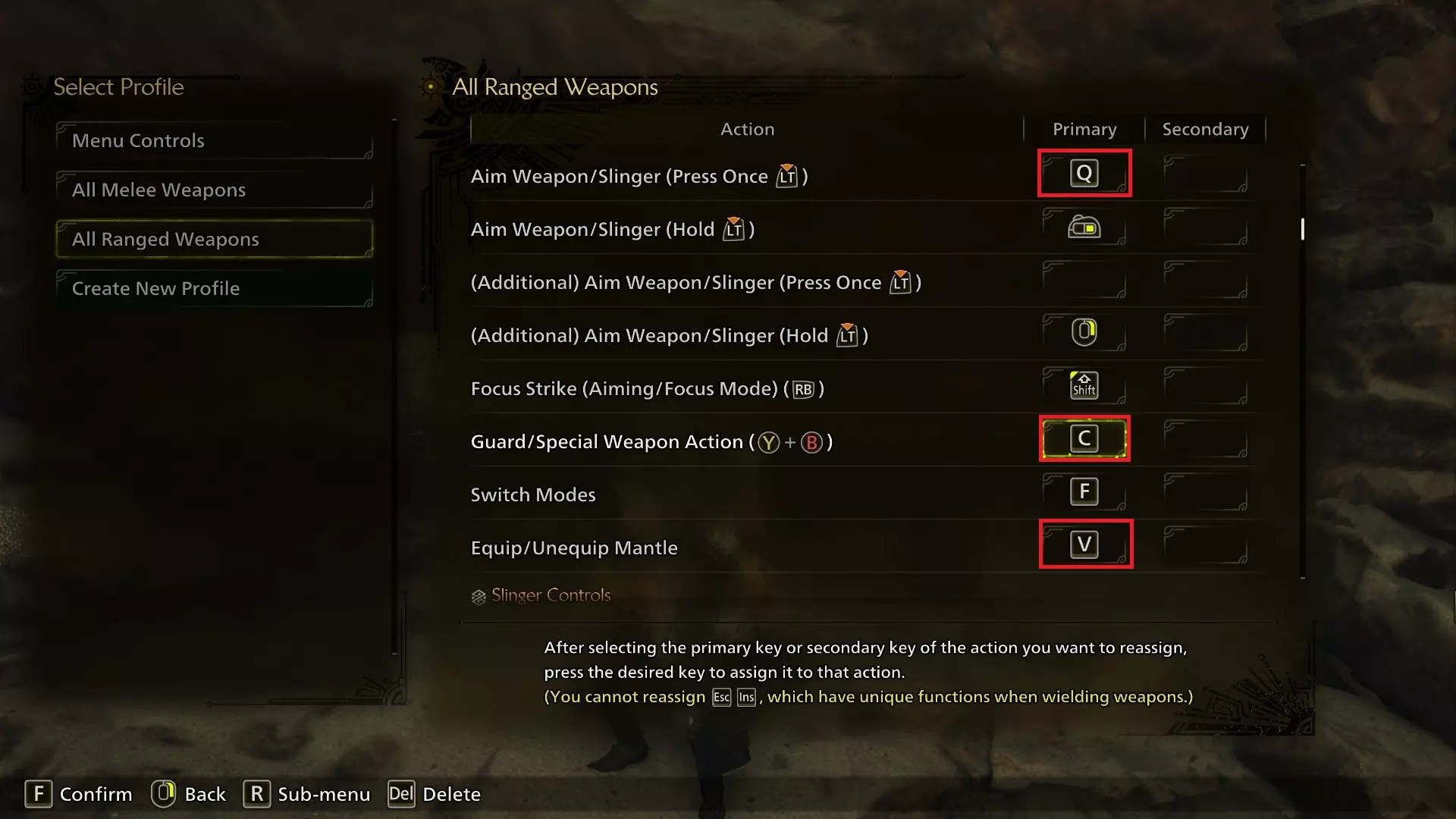 我将专注模式/收刀状态下的快速瞄准(按一次)绑定到了Q键而非Alt键。如果你不打算重新映射隐藏按键,也可以选择不这么做,我个人觉得Q键用起来很顺手(或许是因为我太习惯在《怪物猎人:崛起》里用它来释放 Silkbind 技了?)。将这个功能从Alt键改绑也能避免频繁使用Alt+Tab切换窗口时的误触问题。 你也可以将其设为“按住”按键,但我认为切换专注模式对大多数玩家来说会更舒适。手柄玩家需要在选项中找到相关设置,而非按键重映射界面。装备/卸下披风的按键从C改为V。我认为这样的按键距离更合适,而且(如果你也重新绑定“显示键盘快捷键”以释放V键的话)C键现在就空出来了!(注意:此按键绑定并非指使用吉利披风,该披风是《荒野》中的固有装备,此绑定用于激活你另一披风栏位中装备的任何披风) 投射器控制