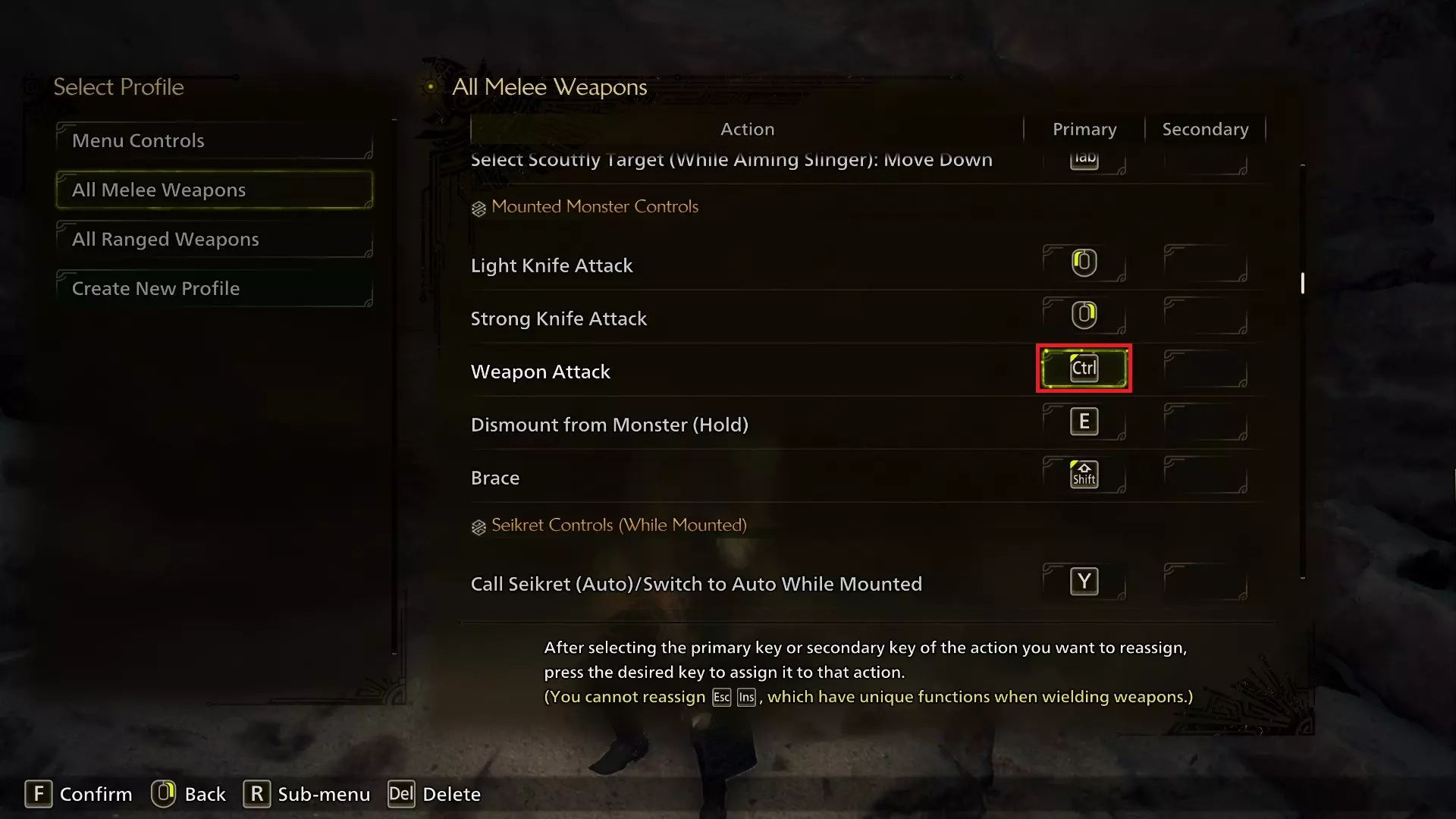武器攻击键已从R键更改为Ctrl键,或您为格挡/特殊武器动作所设置的其他按键。若您未更改过默认设置,则无需进行任何操作。此改动仅为避免按键冲突。 隐藏控制(骑乘状态下)