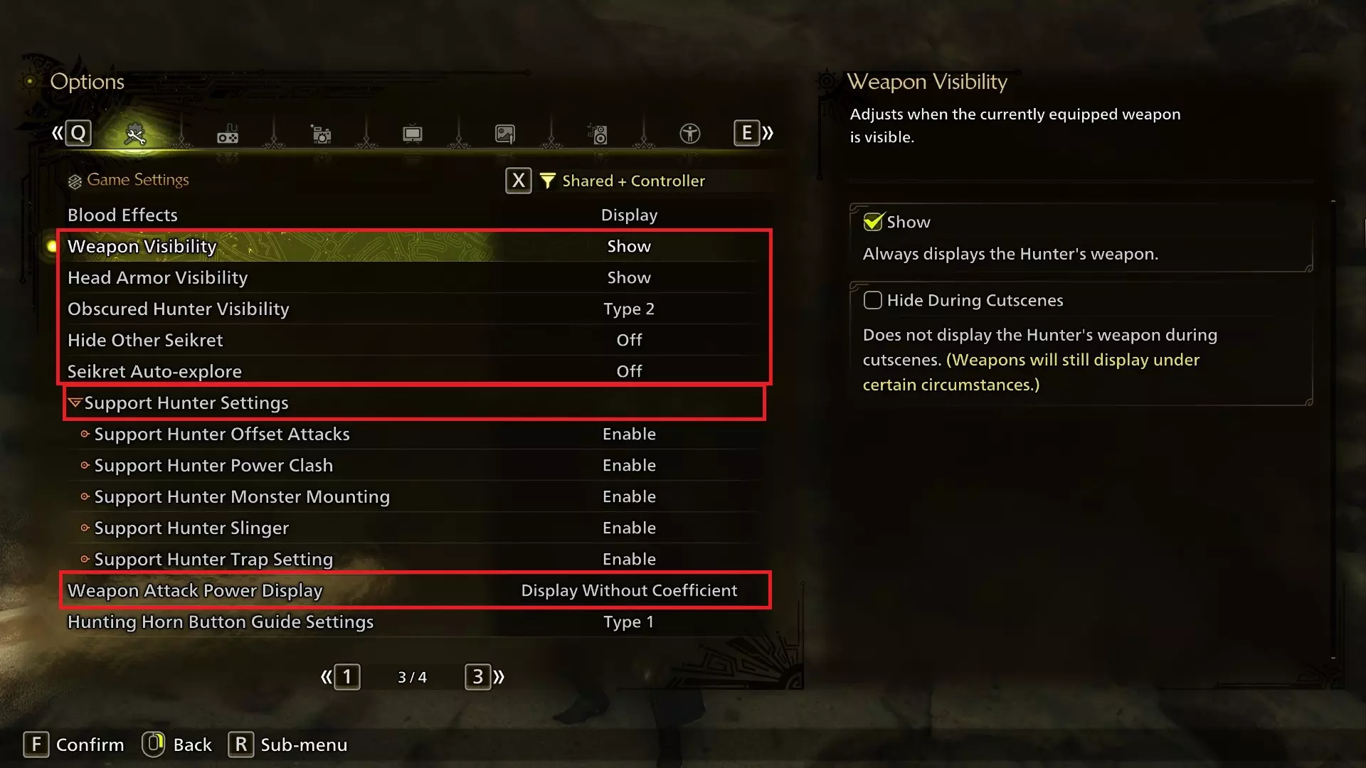 在第三页,你可以查看武器/头部防具显示设置,如果你不想显示大型武器或头盔,可以调整外观。 猎人遮挡显示默认部分开启,以确保当怪物挡在镜头前时你不会找不到自己。你可以调整轮廓颜色,避免纯白色,也可以关闭该功能(不过我建议保持开启)。 隐藏其他玩家的【Seikret】默认关闭,我建议保持关闭,以避免混乱或视觉干扰。 【Seikret】自动探索默认开启,我强烈建议关闭此功能。即使你打算经常使用自动移动,这仍然可能非常碍事,因为你的随从会四处游荡,硬把你的脸凑到草药上,而且我觉得你并不需要这种“帮助”。 支援猎人设置可以调整NPC猎人的行为方式。(这些家伙会在你离线时使用求救信号弹等场景中出现)如果你愿意,可以阻止他们做出可能碍事的行为,比如骑乘怪物。 武器攻击力显示可以关闭造成虚高伤害数值的“系数”,转而显示每种武器的真实属性。正统系列开发团队喜欢在武器伤害数值上“误导”玩家,以避免纯新手因为大剑和双剑的核心伤害数值相同就认为大剑没用。大多数人会希望关闭这个系数显示。操作控制