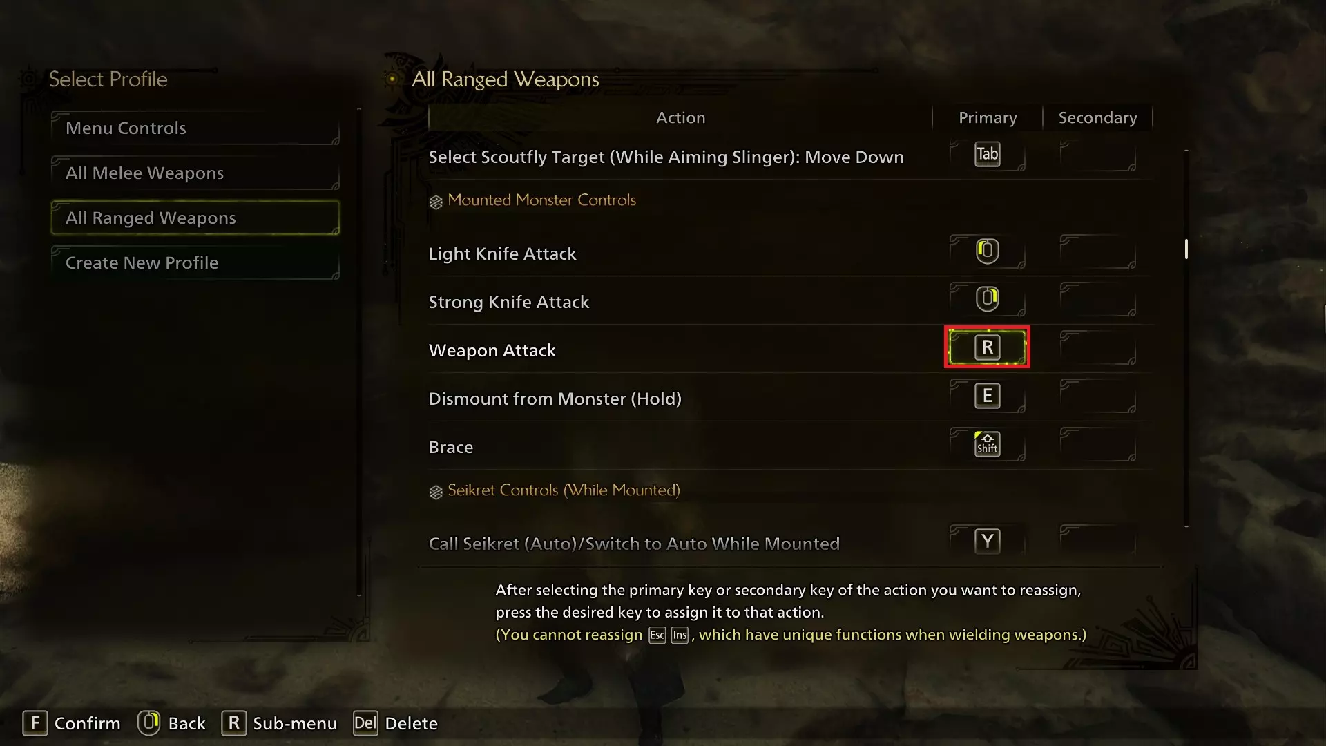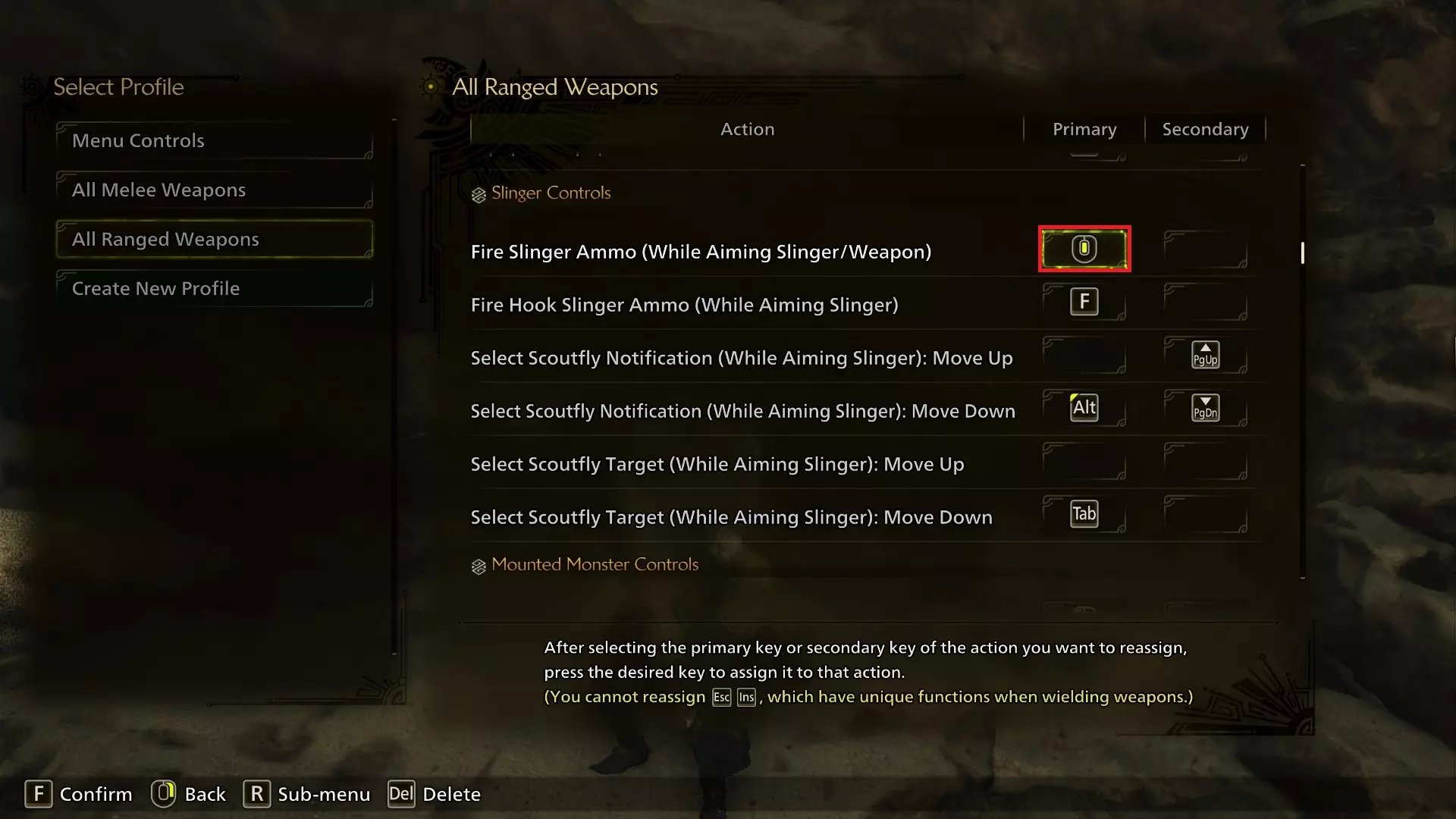 【火焰投射器弹药】(瞄准投射器/专注模式下)已从鼠标中键更改为C键,我觉得这样更直观。你可以根据自己的喜好,将此按键与【钩爪投射器】绑定(在此控制方案下仍为F键)互换,或者如果C键感觉不适,也可以使用其他按键,我认为这个键位设置可能是最不符合其他人偏好的。 【侦察蜂标记选择】(瞄准投射器时):下移功能已从Q键重新绑定到左Alt键。此按键的作用是,按下后可以选择屏幕左侧的侦察蜂标记,然后只需按下钩爪键,猎人就会抓取物品,无需移动镜头。这相当实用,而且在我看来,Alt键用于此功能很合理。怪物骑乘控制 注:本节内容指对怪物施加的骑乘状态效果,而非【Seikret】。