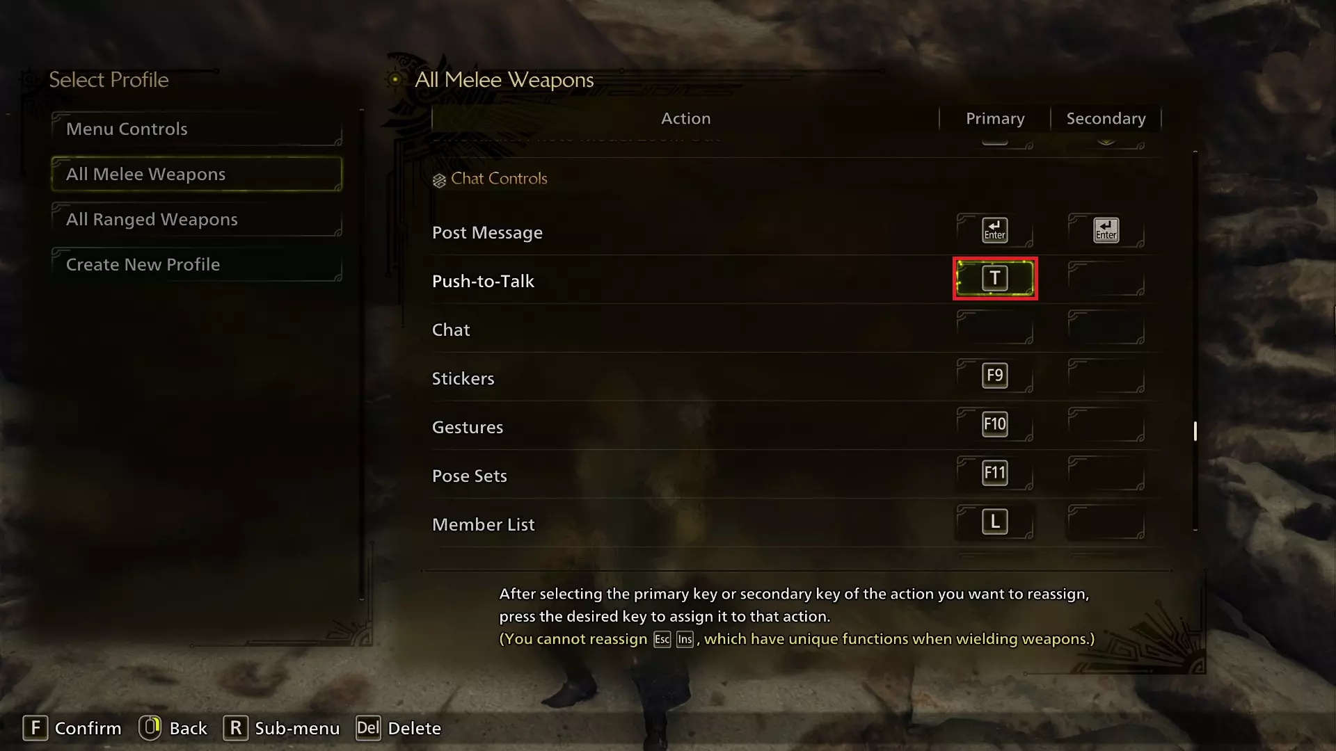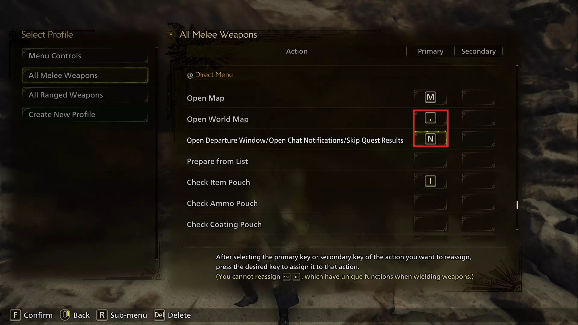 开放世界地图已添加,这是一个小改动,但它就在M键旁边,是一个很方便的功能。 打开出发菜单/打开聊天通知/跳过任务结果的按键已从Y键改到N键。N键靠近M键,而此按键关闭的通知会遮挡M键的地图按钮,因此将这两个按键放在一起非常理想。需要注意的是,此按键还可以跳过任务结束时的怪物死亡动画镜头!