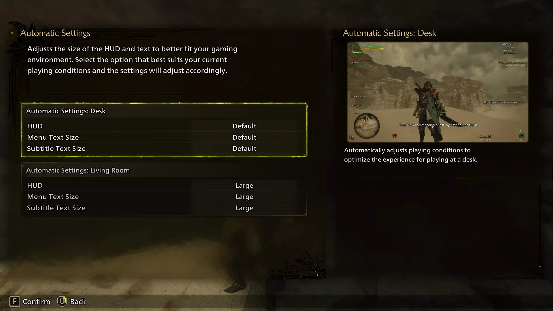 自动设置非常适合不想手动自定义HUD的玩家。它为桌面/电视玩家提供了两种默认尺寸。 其他 键鼠的钓鱼操作不够直观。你需要按前后键(大多数人是W和S)并保持一定节奏,直到猎人开始明显收线以吸引鱼的注意。节奏速度会影响你吸引到的鱼的种类。 在控制器上,这模拟了真实的收线动作,但在PC上这种操作体验没有很好地转换,所以包括我在内的很多人一开始都感到非常困惑!