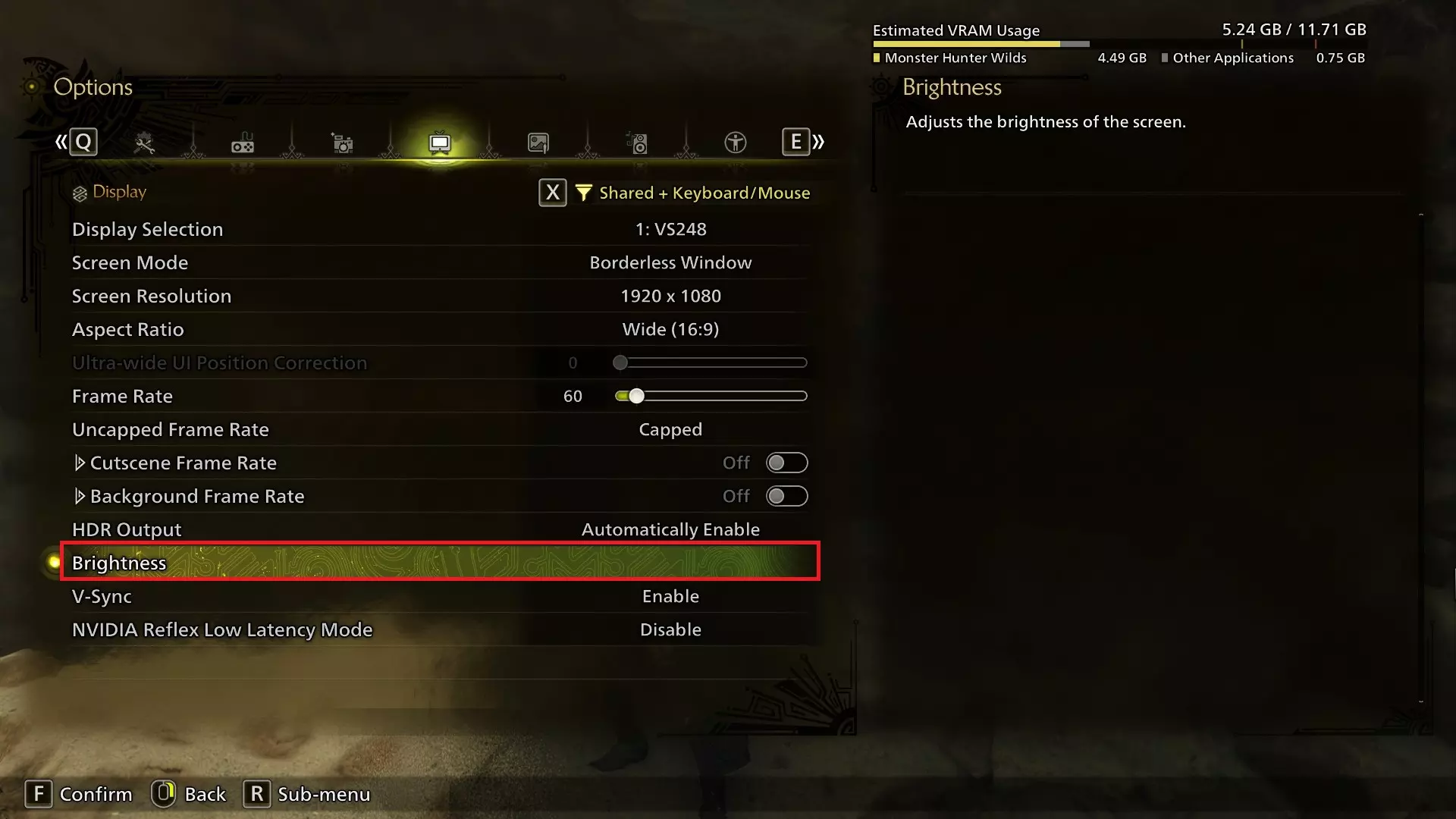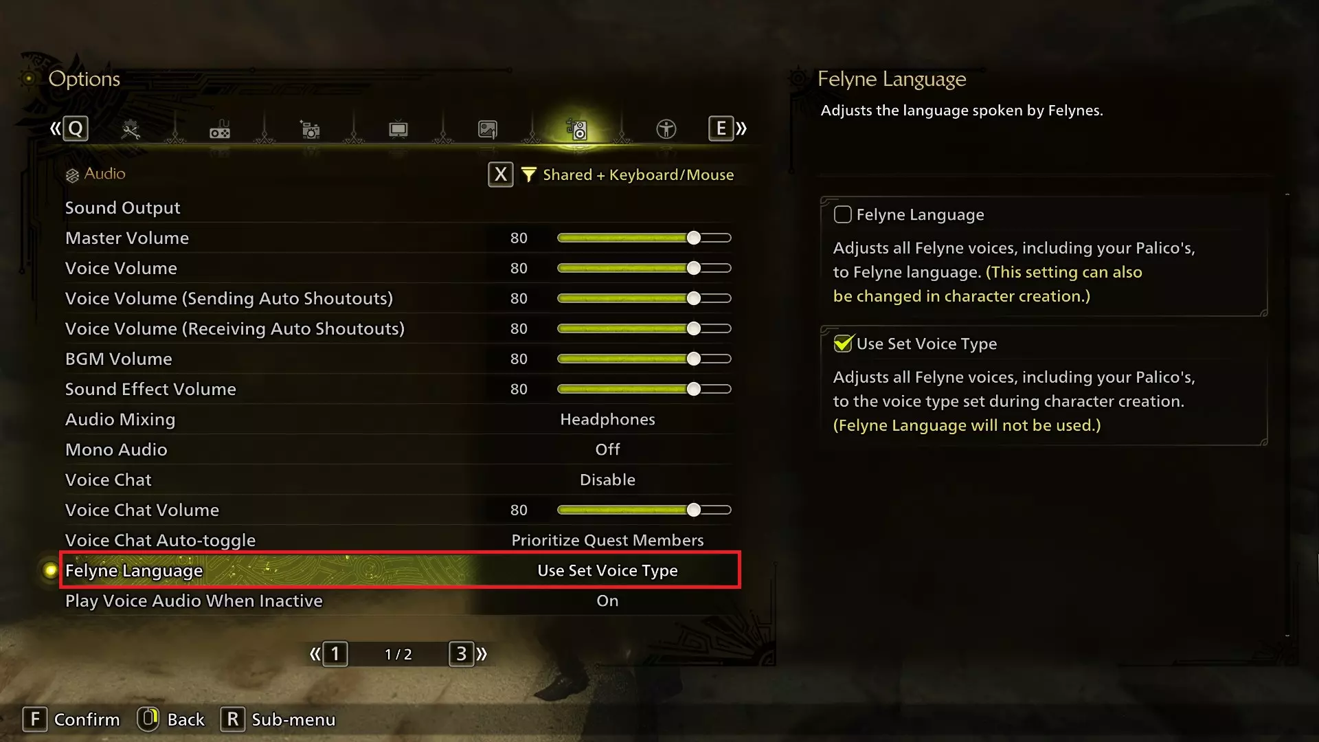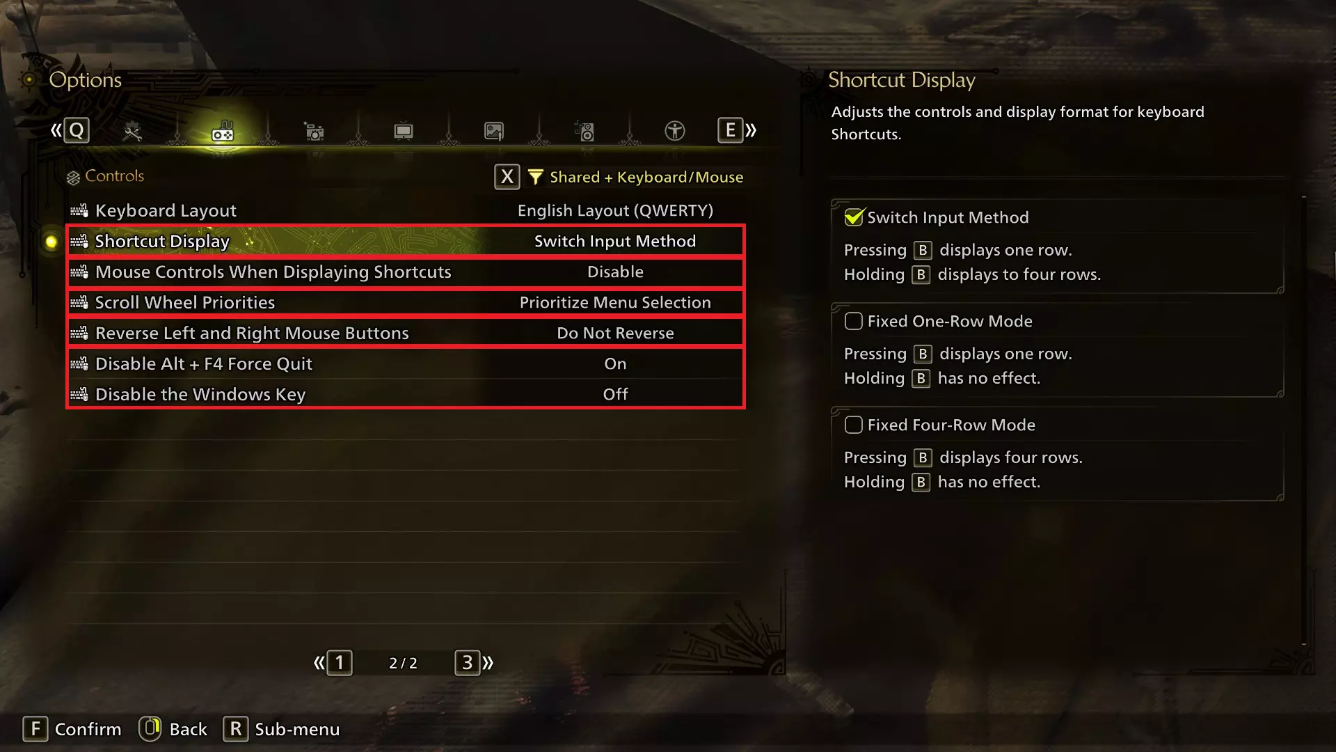 显示物品(按住)/重置视角不能设置为R键,因为该键在武器控制中更适合用作装填。对于远程武器使用者来说,这个按键更为重要,因为它是切换物品栏滚动与弹药/涂层滚动的方式。我认为《怪物猎人:世界》中该按键的默认设置Ctrl键对远程武器来说效果很好,但远程武器高手也可以轻松使用鼠标4或鼠标5(如果有的话)。 选项(第一部分) 我不会提及所有选项,但会重点介绍这个庞大选项菜单中一些你可能最初没注意到或想知道位置的重要内容。游戏设置 有一个可通过X键激活的筛选器。将其设置为【共享+键盘+鼠标】会隐藏所有仅适用于手柄的选项,如果你从不打算在《荒野》中使用手柄(或者反过来,不打算使用键盘),这个功能会很方便! 注意:所有这些选项均基于游戏内选项。我认为其中部分选项不会在主菜单设置中显示。