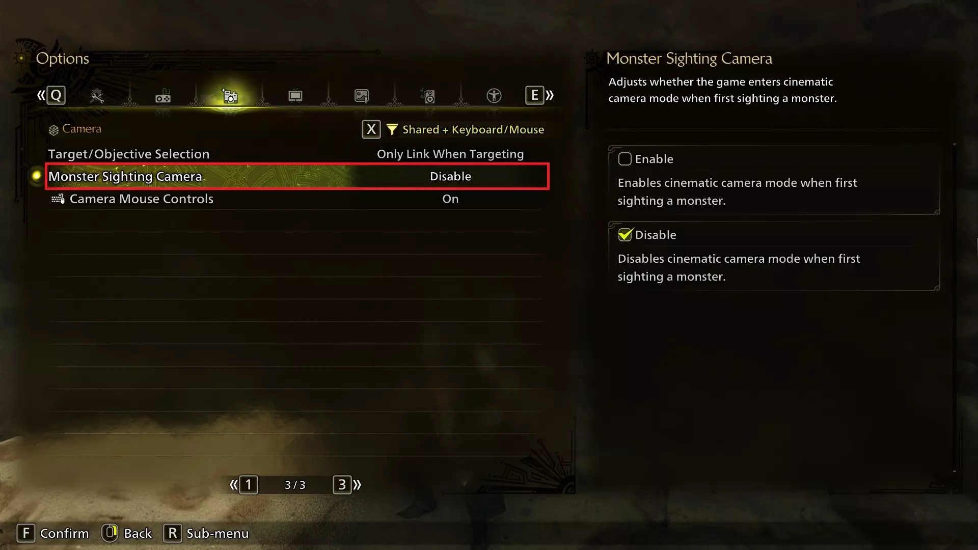 第三页的【怪物发现相机】在首次发现怪物时会导致画面放大,如果你在《怪物猎人:世界》中觉得这很烦人,现在可以将其关闭!显示