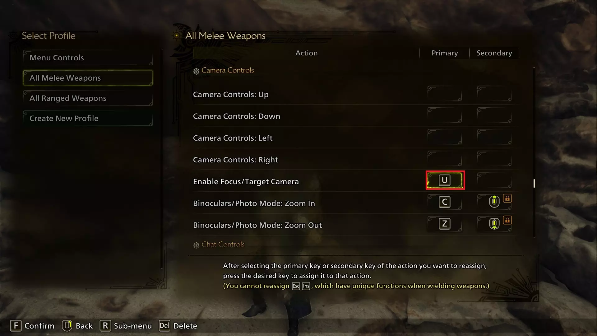 将启用专注/目标视角的按键改为U。反正把视角锁定在怪物猎人的怪物身上不是我的风格,所以我就把这个按键放到不碍事的地方了。如果你愿意,也可以用T键来对应“目标”,但你得想办法重新映射语音通话按键,因为T键默认是语音通话键——如果你本来就不打算用语音聊天,那就可以把语音通话键随便设到别的地方去。 聊天控制