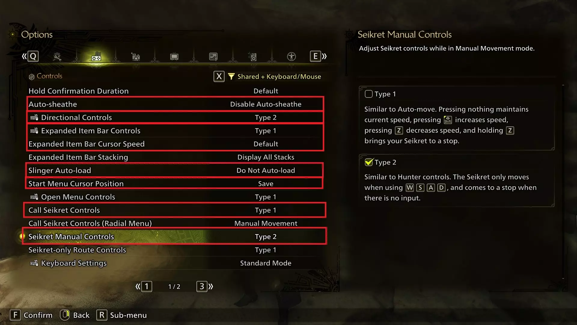 Seikret手动控制允许你将控制方式从“驾驶”风格(即通过提升/降低速度和转向来操作,类型1)更改为只需按住方向键的常规移动方式(类型2)。 我个人强烈推荐类型2手动控制。这能让Seikret在战斗中使用起来容易得多。在键盘鼠标操作下,你唯一失去的是让Seikret缓慢移动的能力,只有在类型2下使用手柄的模拟摇杆输入才能实现这一点。 自动收鞘:我强烈建议禁用此功能,自动收鞘可能会让你丧命。 方向控制:我个人将其设为类型2,因为这在我看来更合理(例如,如果你在攻击时想让猎人向左看,同时按住W键闪避,猎人会向前闪避而不是向左闪避,不过这是个人偏好,你可以两种设置都试试。 扩展物品栏控制:这是一个实用功能,通过额外的输入可以让你一次性显示物品栏的全部内容。你可以调整其工作方式或禁用它。 扩展物品栏光标速度:改变你滚动物品栏的速度! 投射器自动装填:启用此选项后,当物品栏中选中投射器弹药类型时,猎人会在片刻后自动装填。手动装填比自动装填更快,而且我可以确认投射器装填动画无法自由通过闪避取消,所以我个人关闭了这个功能。开始菜单光标位置:请注意,此设置还会保存你在开始菜单中所处的选项卡。我个人喜欢启用此设置。 键盘设置:这是为那些希望将键盘用作辅助控制输入(如聊天或键盘快捷键),同时使用控制器主要控制游戏的玩家准备的。