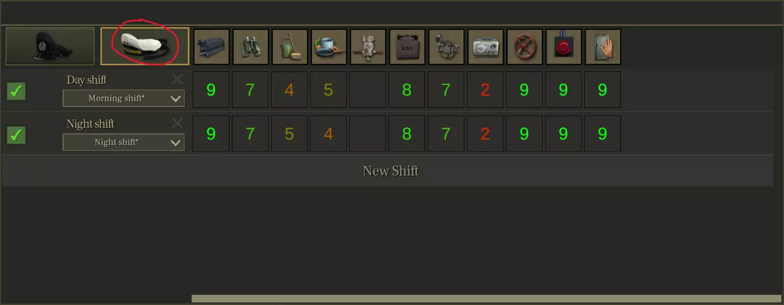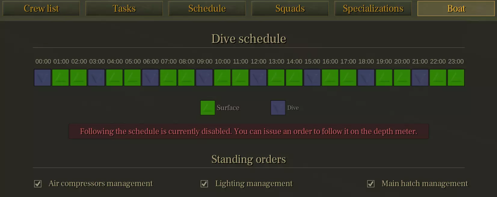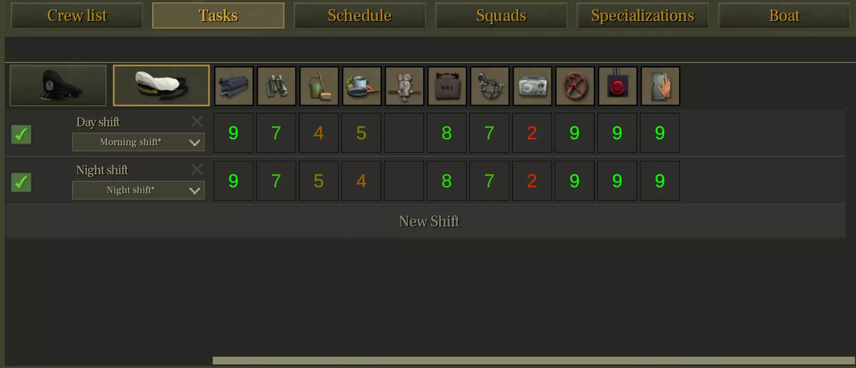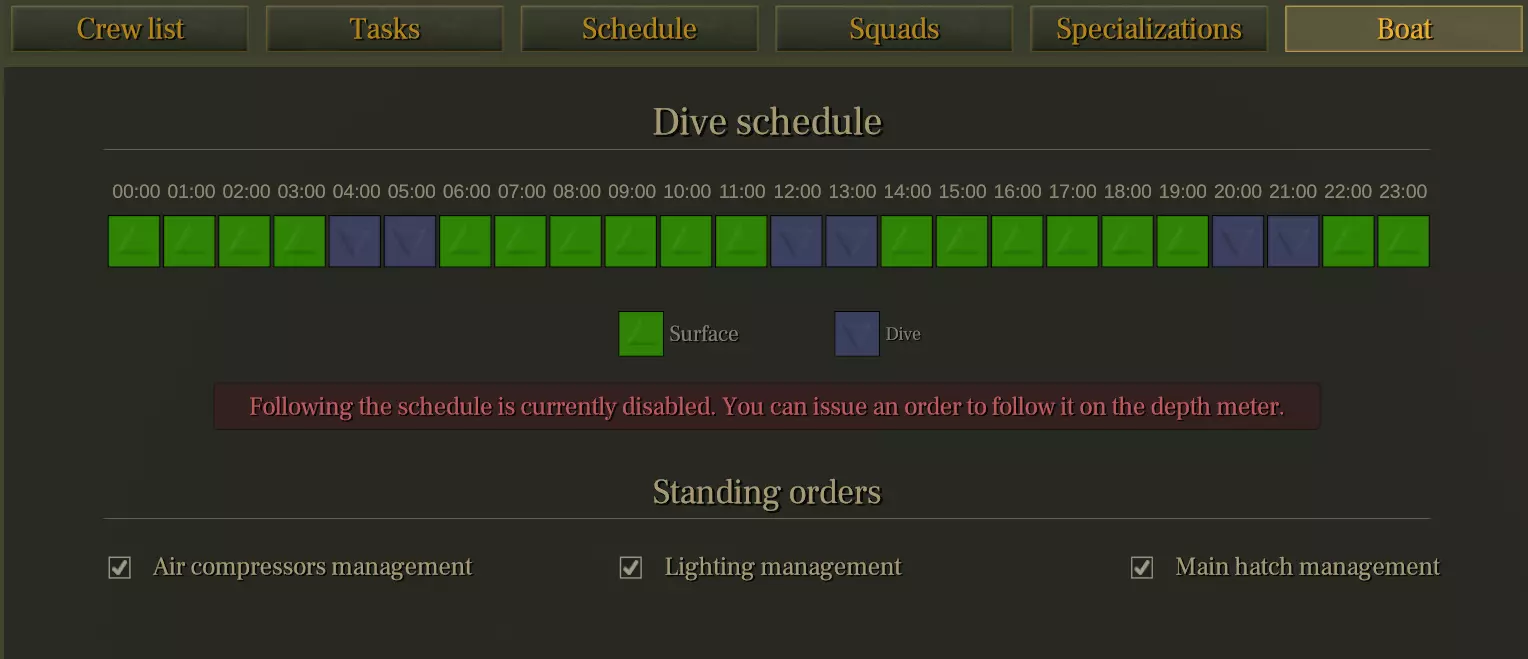 (You can assign sailors to shifts using the + and - buttons and up to two sailors per officer. You can also use the green button to assign a specific sailor manually, but that's only for roleplay purposes, it has no impact on gameplay.) 5 Officers ( 7 later) and 14 Sailors. Each officer (except Radioman) gets 2 sailors assigned to them, boosting their tasks. There are two main crew configurations used with 19 total crew (5 officers, 14 sailors): 5-5-8 and 7-7-8. 5-5-8 means 5 sailors in the day shift, 5 in the night shift (10 total), and 8 sailors assigned to officers. 7-7-8 means 7 sailors in each shift (14 total), and 8 sailors assigned to officers.I chose 7-7-8 as the better setup because: It ensures *continuous station coverage* (cleaning, cooking, navigation) throughout the day and night. Even though it slightly reduces the number of sailors helping officers (from 6 to 5), this loss is minor and doesn’t impact officer efficiency significantly. Most importantly, it prevents task interruptions and warning alerts (like no cook assigned between 20h–21h), which can happen in 5-5-8. The extra fatigue generated in 7-7-8 (~+1/min) is negligible and can be offset with others bonuses (like food diversity).In short: 5-5-8 saves sailor fatigue but causes occasional gaps in task coverage. 7-7-8 gives you full task coverage with no critical downside. Here is a more detailed explanation of the whole crew management and shift assignments, I suggest taking the time (10 minutes) to test this yourself. You will have a better understanding of how it works. It is best to do this while at sea where you can use max time compression: — If you assign **more** sailors to the shifts, your officers will get less help (bonuses), but all the stations in the submarine will be correctly manned. You can easily test this yourself by: Assigning 14 sailors to both shifts and removing all the sailors from the officers Going back to the normal view Letting a few hours pass at max time compression to let the changes take effect Looking at the bottom right of the screen: you’ll see that no rectangles next to officer portraits can be filled, and the “on duty” box on the far right of the portrait will show 0/0 sailors available.Now, even if you assign the max sailors to each officer, none of them will get help, because shift-assigned sailors take priority over officer-assigned sailors. So: no bonus. — If you assign **fewer** sailors to the shifts, your officers will have more help available, but stations in the submarine like cleaning, cooking, engine room, etc. (see the “Sailor task assignments” section above for details) will not be correctly manned. You can test this by: Assigning 0 sailors to both shifts and adding the max sailors to the officers Going back to the normal view Letting a few hours pass at max time compression to let the changes take effect Looking at the bottom right of the screen: you’ll see that all rectangles next to officer portraits are filled, and the “on duty” box will show x/9 sailors available (x will change when your officers go to bed or start working).But, as you probably already heard through the alert system, stations (like the galley, cleaning, helmsman) are **not** staffed. You can see this visually by looking around the submarine: it will be mostly empty, and you’ll see 9 sailors lying in beds, waiting to be assigned to officers. You can also check the Discipline bar at the top of the screen next to the money: it will drop quickly due to the submarine being unmaintained. If you are still limited to 14 sailors max, you might be wondering why it says x/9 sailors are available to help officers, and not x/10, since in the squad screen we’ve told the game we want 2 sailors per officer, for 5 officers, so 2×5=10 ??? This is because there’s a line in the game’s code that limits the total number of officer assigned sailors at any given time: if (this.officerFollowersCount != num) this.officerFollowersCount = num; this.maxOfficerFollowersCount = Ceil(valid_sailors * 0.6f);This formula means: maxOfficerFollowersCount = Ceil((number_of_available_sailors) * 0.6)Out of all sailors who are not sleeping, injured, or busy doing something else, the game only allows 60% of them to be assigned to assist officers. The result is rounded up using `Ceil`, so you don’t lose a sailor due to rounding. Examples: 10 sailors available → 10 × 0.6 = 6 → max 6 sailors assignable 12 sailors available → 12 × 0.6 = 7.2 → max 8 sailors assignable 14 sailors available → 14 × 0.6 = 8.4 → max 9 sailors assignable 16 sailors available → 16 × 0.6 = 9.6 → max 10 sailors assignable If you want to assign 10 sailors to your officers, you need at least 16 truly available sailors. For the "Why ?" I don't know, but it's probably a safeguard for the game to keep at least a few sailors free under any circumstances to allow them to perform task that should not be blocked (like open hatch, turning valve, turn on light etc). Dive schedule: