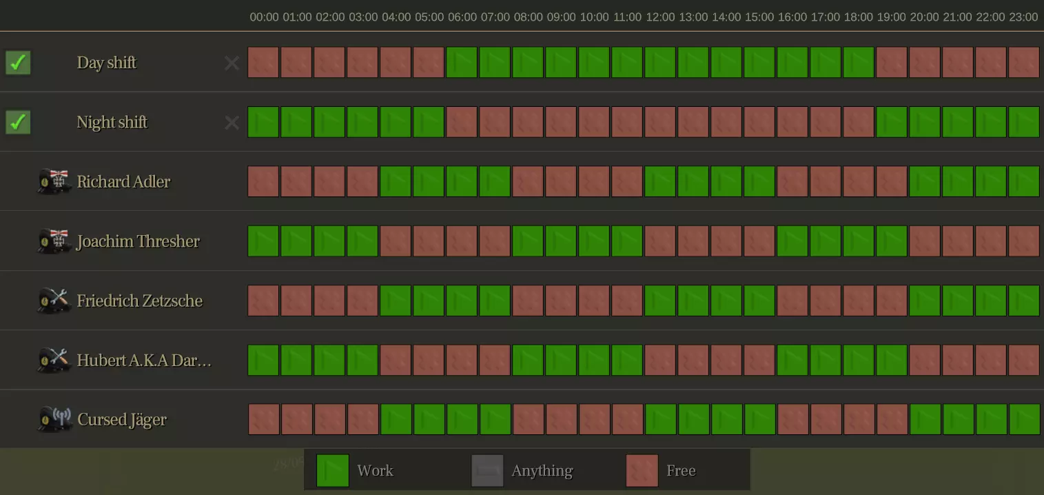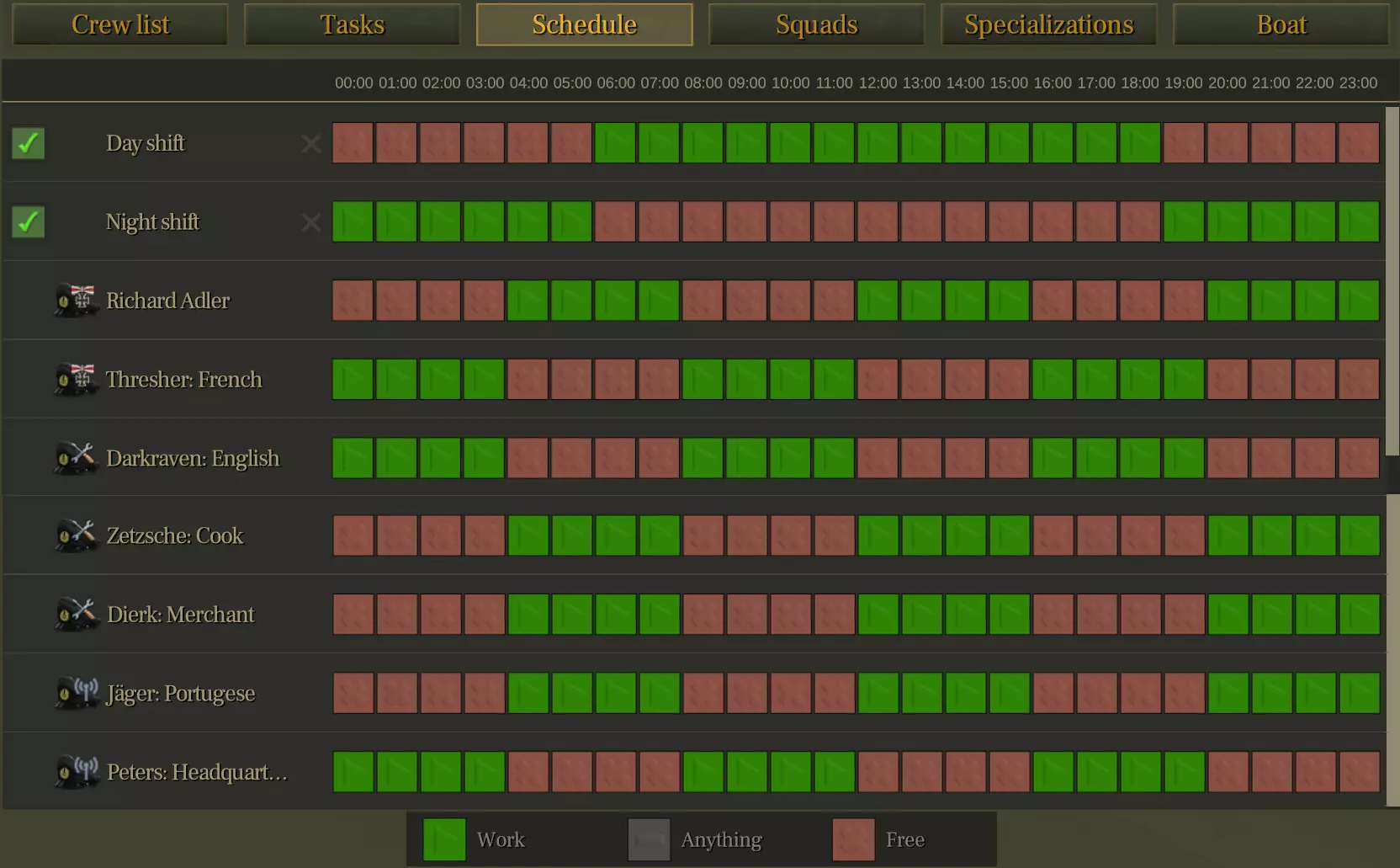 我会快速说明一下:这主要是关于在哪个班次中哪些任务具有优先级。如你所见,我删除了一个班次,并重新命名了另外两个班次。 引擎、阀门、电源开关任务和舱壁非常重要,它们能让潜艇根据当前情况更好或更快地运行(例如,如果军官需要进行鱼雷维护或装填鱼雷,就需要折叠床铺,这通常是必须快速完成的关键任务,因此优先级很高)。 IIA型/IID型潜艇上没有分配人员进行潜望镜观察,因为人手不足,但之后可能会分配。这不是很重要,因为已有两名军官带着他们的水兵负责此事。(不过,如果两名军官都失去行动能力,这可能会暂时有用——请记住这一点。) 我调整了两个班次的清洁和烹饪优先级,以便每次都能妥善完成这两项任务(在没有更紧急任务的情况下)。 日程安排: