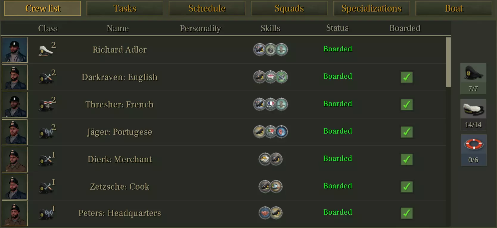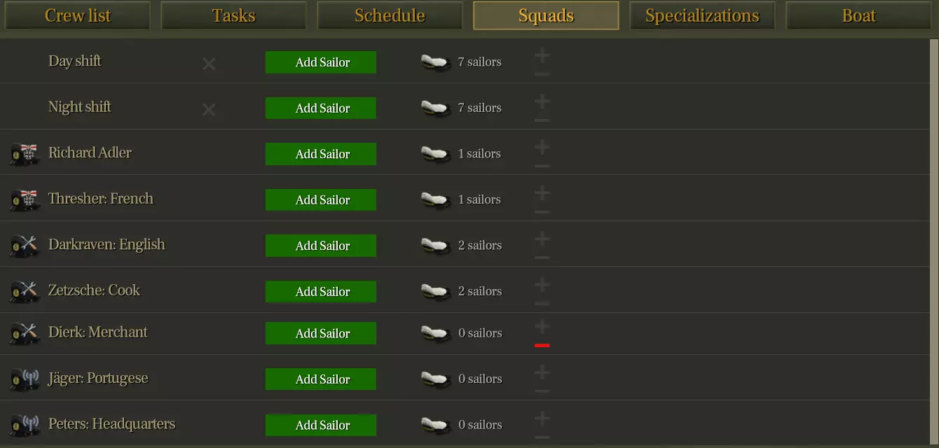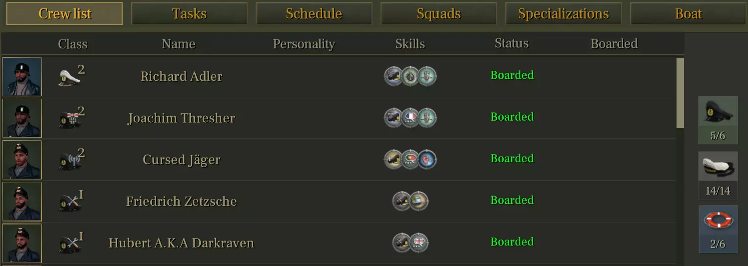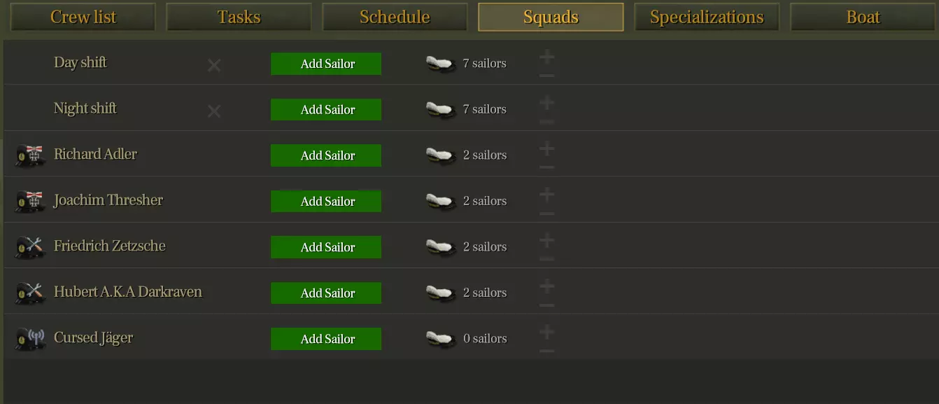 仅保留两种班次:日班和夜班。已移除第三班次。 所有水手和军官均在日班/夜班之间轮换。 更短的班次有助于实现更动态的任务管理和更好的反应能力。 一次最多只能有4名军官睡觉(军官床位仅有4个,船长在更大的潜艇上稍后将拥有自己的床位)。 小队管理: