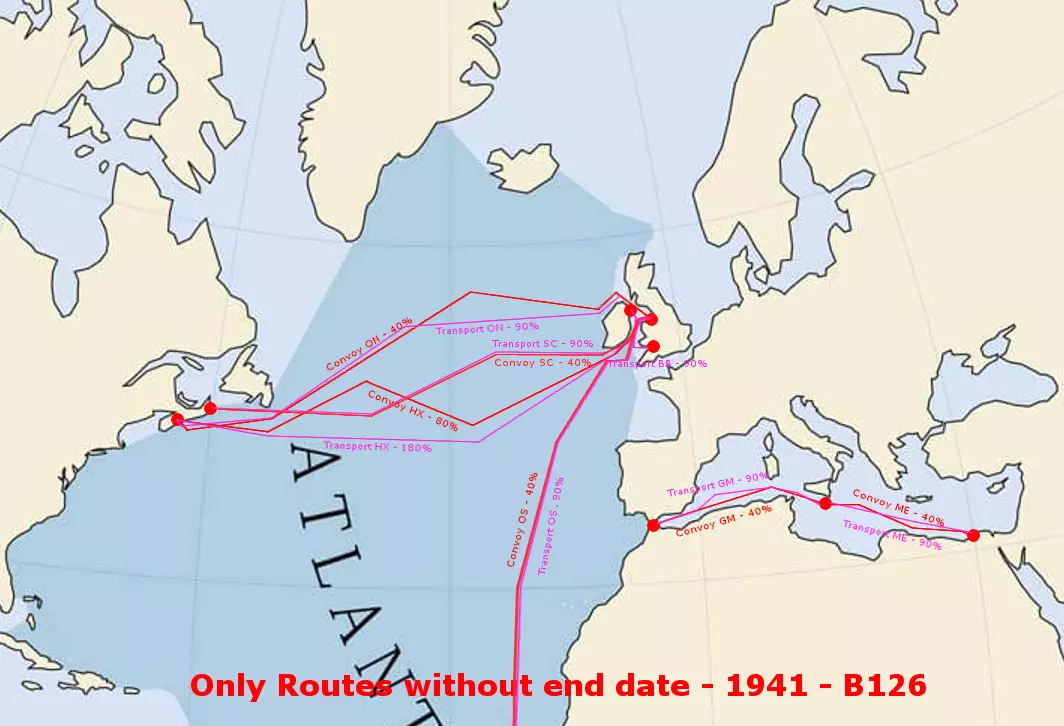 名称 出发地 目的地 开始日期 国家 路线进度 护航队JW 利物浦港 摩尔曼斯克港 1942-09-02 英国、美国、苏联 50% 护航队UG 纽约与新泽西港 直布罗陀港 1942-10-24 英国、美国 25% 运输队UG 纽约与新泽西港 直布罗陀港 1942-10-24 英国、美国 90%