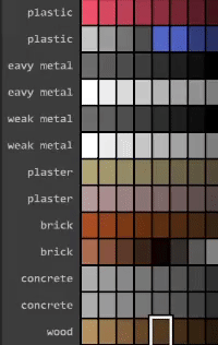 查看材料列表并合理组合,以获得满意的结果。 窗户、灯光及类似物品 要制作窗户,只需选择窗户材料(调色板索引1-9)。 选择颜色并在右侧选择材料。 金属材质会使你的材料看起来像金属。粗糙度滑块可让金属呈现出被钢刷打磨过的效果。 如果想要灯光,请使用【Emit】着色器。其他所有材料的操作方式相同。 (不过目前在游戏中它们实际上还不会发光)