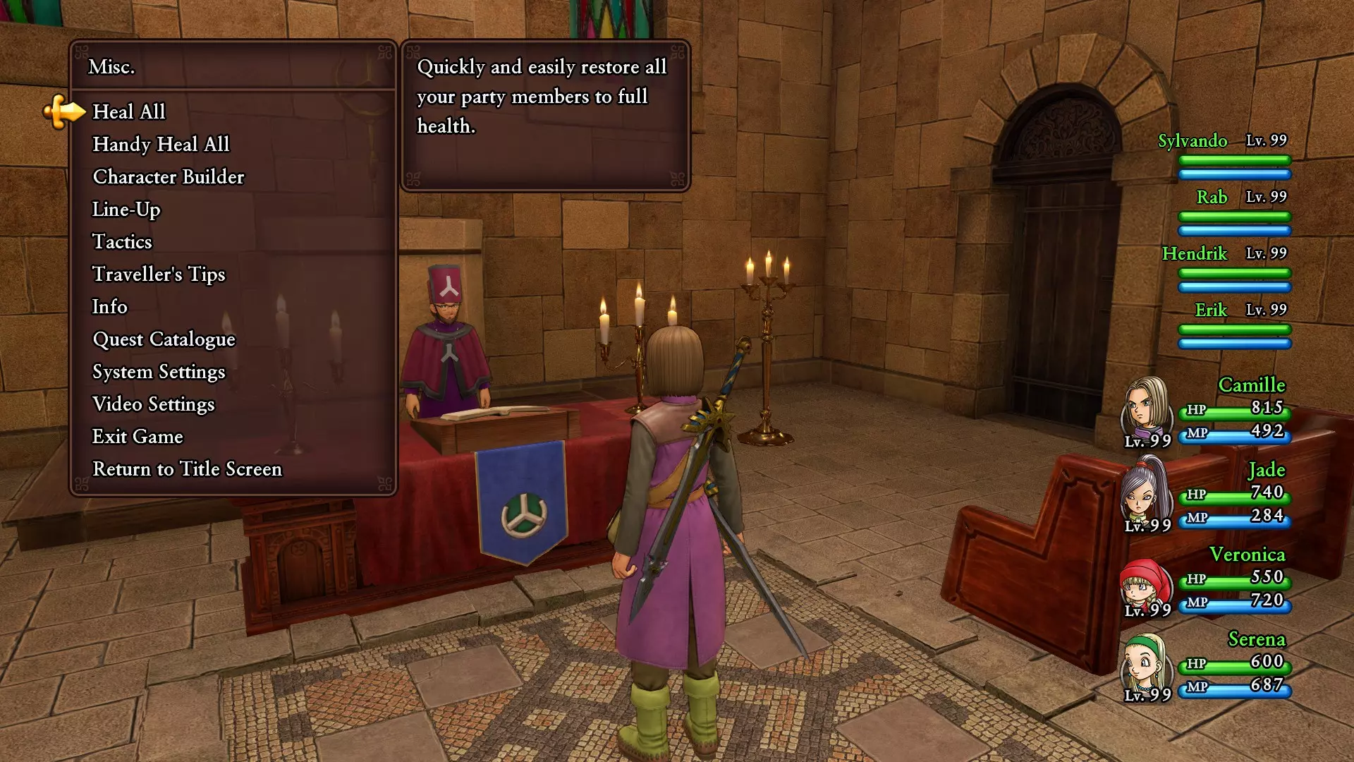 当你的队伍生命值已满时,使用杂项菜单下的【全体治疗】选项。