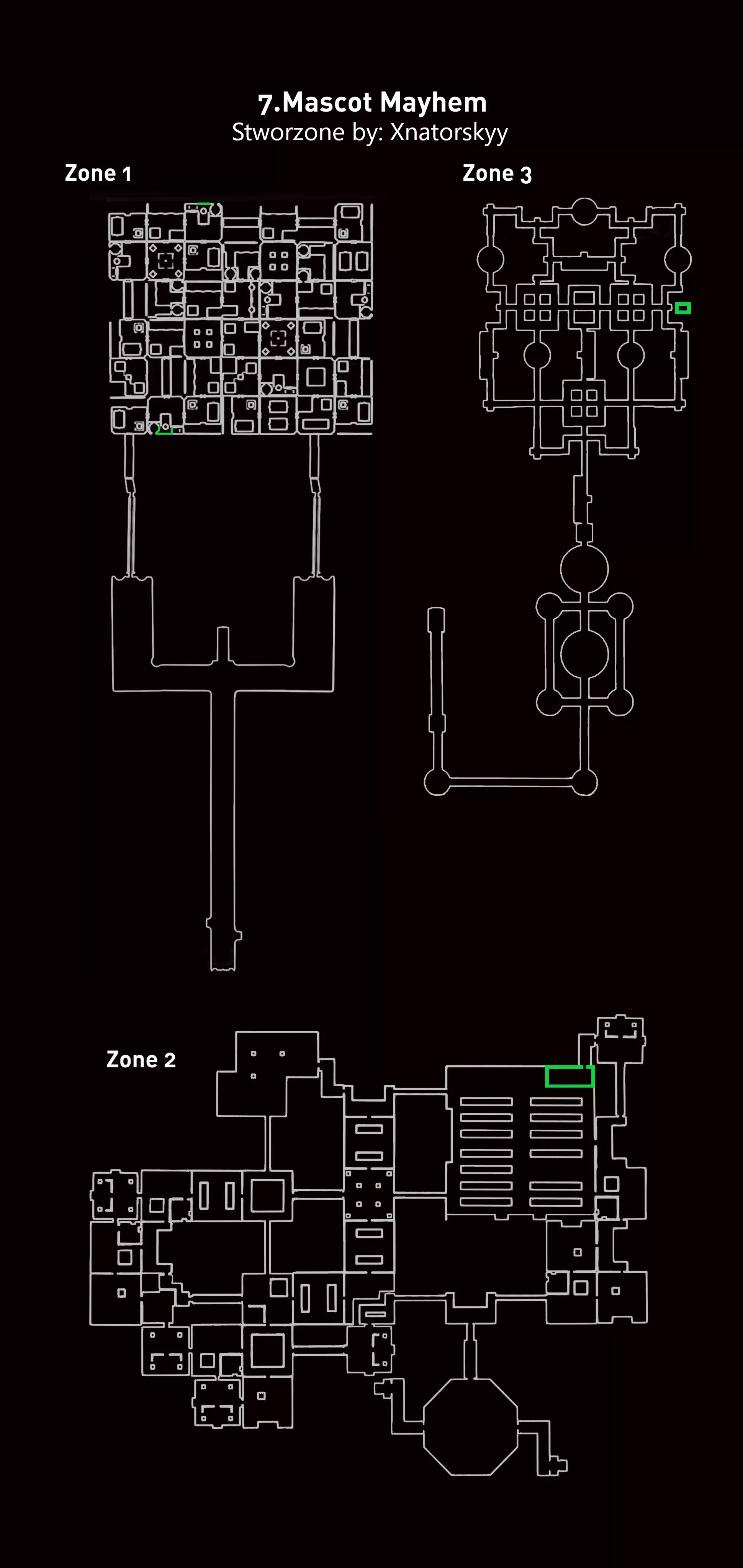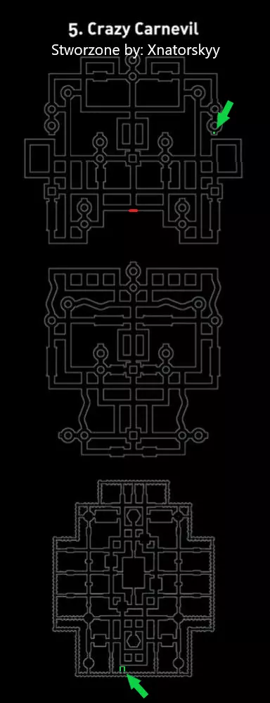 尽量打开尽可能多的门,因为当鸭子开始追你时,逃跑会很困难,甚至可能无法逃脱;0 经常使用心灵感应,并且在通道中小心移动…… 这是一个缓慢的过程,我们通过它开始和结束关卡。我个人觉得这很无聊,尽管概念很有趣 【地图辅助:红色标记为传送门,绿色标记为秘密】 如何躲避敌人——只有一种方法,因为我们无论如何都必须从它旁边经过,因为那里有碎片。我们只需要在激活它们后通过使用速度提升来摆脱它们。 强烈建议当鸭子把你逼到角落或你来不及打开的门下面时使用传送。当鸭子靠近我们时,我们传送到它身后,然后快速按住“W”+“Shift”。虽然我们有很多逃跑时间,但不要把时间浪费在速度上。毕竟我们想甩掉鸭子 :) Boss战流程: Doom Ducky 向我们发射鸭子,我们躲在柱子后面。 当 Doom Ducky(Boss)扔出的“鸭子”击中柱子时,它会暂停一会儿——这时我们靠近中间的塞子并拧开它——在此期间 Boss 会起身,你必须逃跑。然后重复这些操作 :) 现在是逃跑时间,Doom Ducky 在追我们,我们只需要向前跑,游戏会自动为我们显示通往传送门的路径。交替使用速度提升和传送技能,末日鸭子(Doom Ducky)并没有那么快,你们应该能应付。记住,最后末日鸭子会从左侧墙壁出现,所以你们必须避开它,不要被抓住。就这样。疯狂嘉年华 我觉得这是最简单的关卡 ;-; 数据统计: 碎片 - 280 区域 - 2 敌人 - 小丑地精(Karłowate Klauny) Boss - 巨人小丑(Ogromne Karłowate Klauny) 陷阱:大锤、杰克盒子、小货车、炮台 技能:恐慌之惧 - 可以让敌人定身(就像收集到黄色球体【眩晕球】后一样) Boss难度 - 简单 关卡难度 - (对我来说)简单 | (对大多数人来说)困难 敌人数量 - 未知 / 取决于移动路线 [很多] 关卡要点:躲避小丑并阻止它们繁殖...我们尽可能让大多数车辆使用“原始恐惧”技能,这样小丑就无法繁殖,这是它们的技能(在某种意义上我们可以剥夺它们的这项技能)。