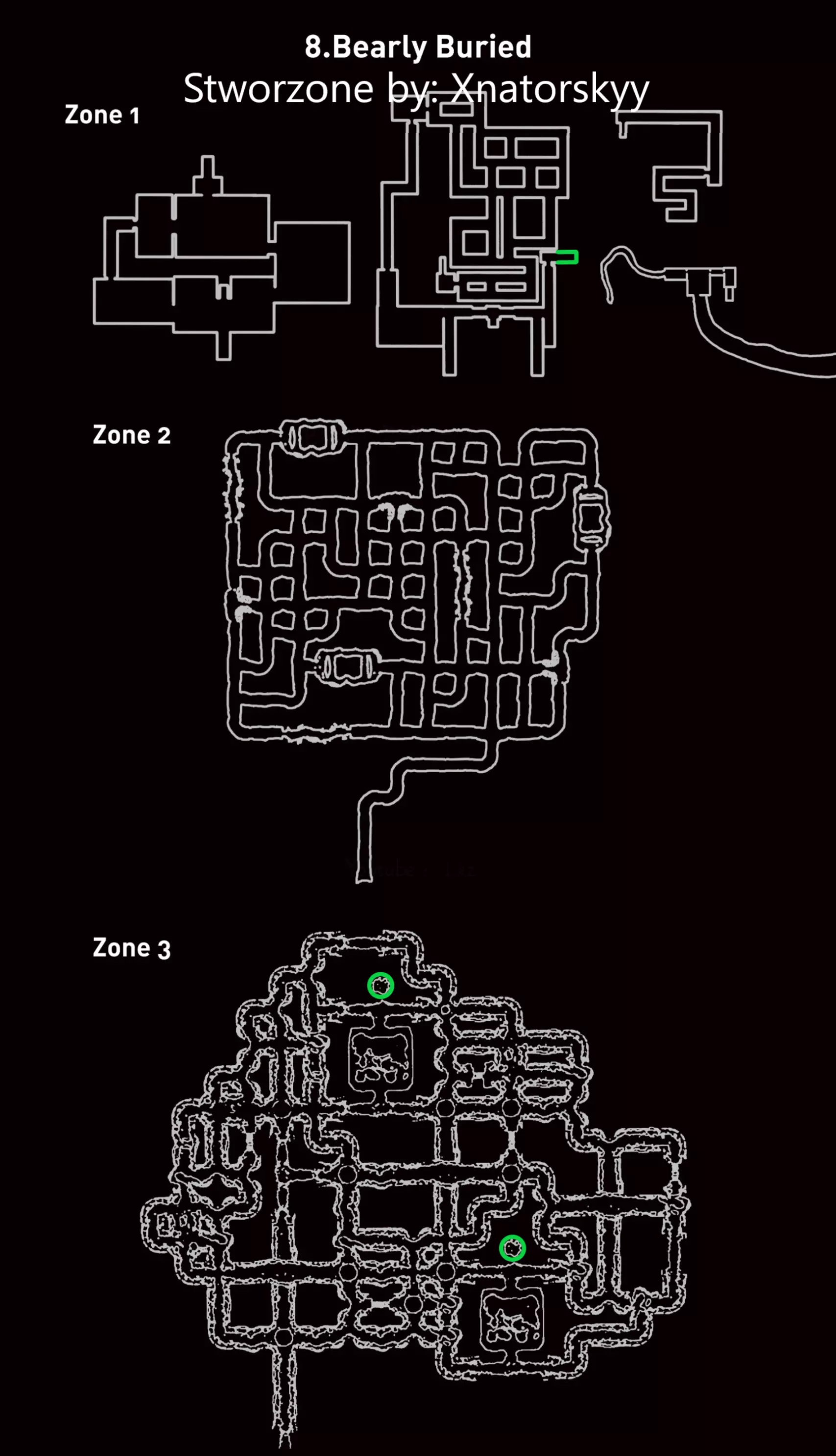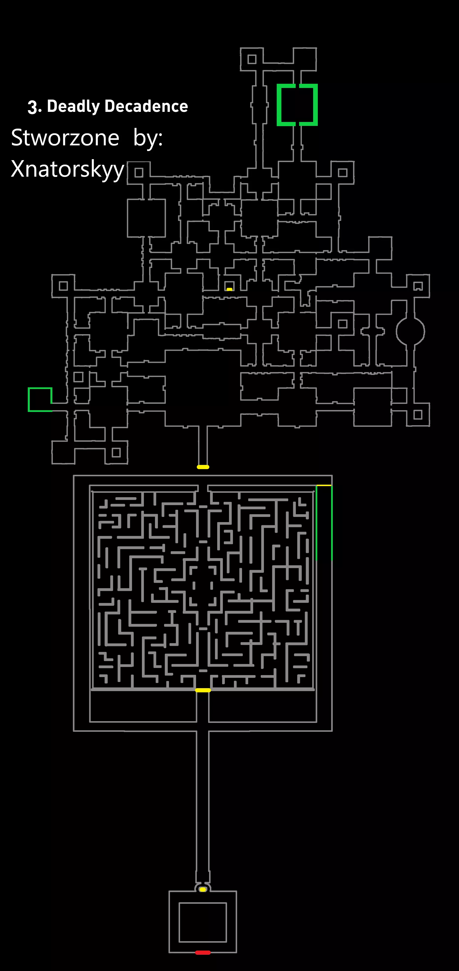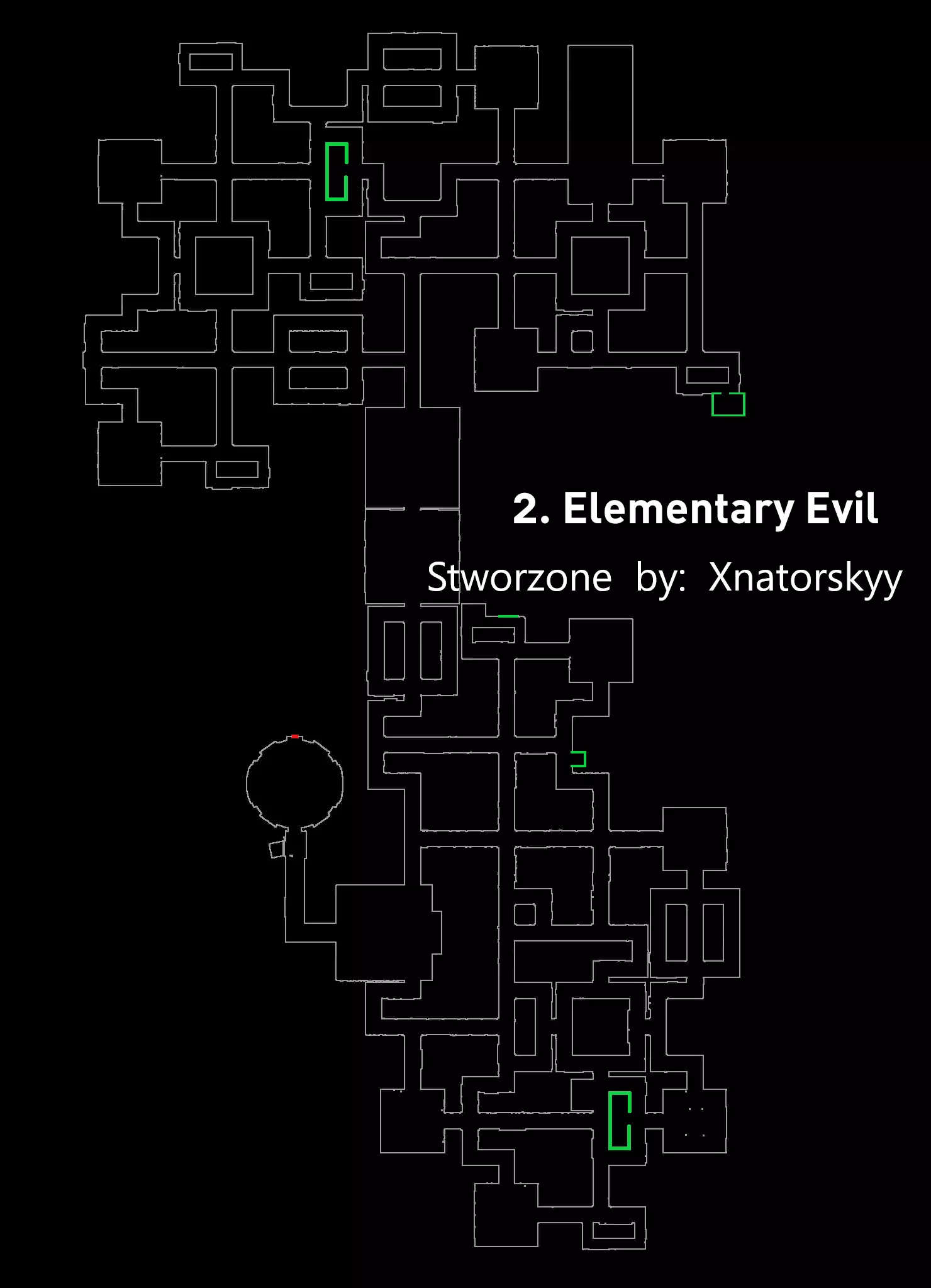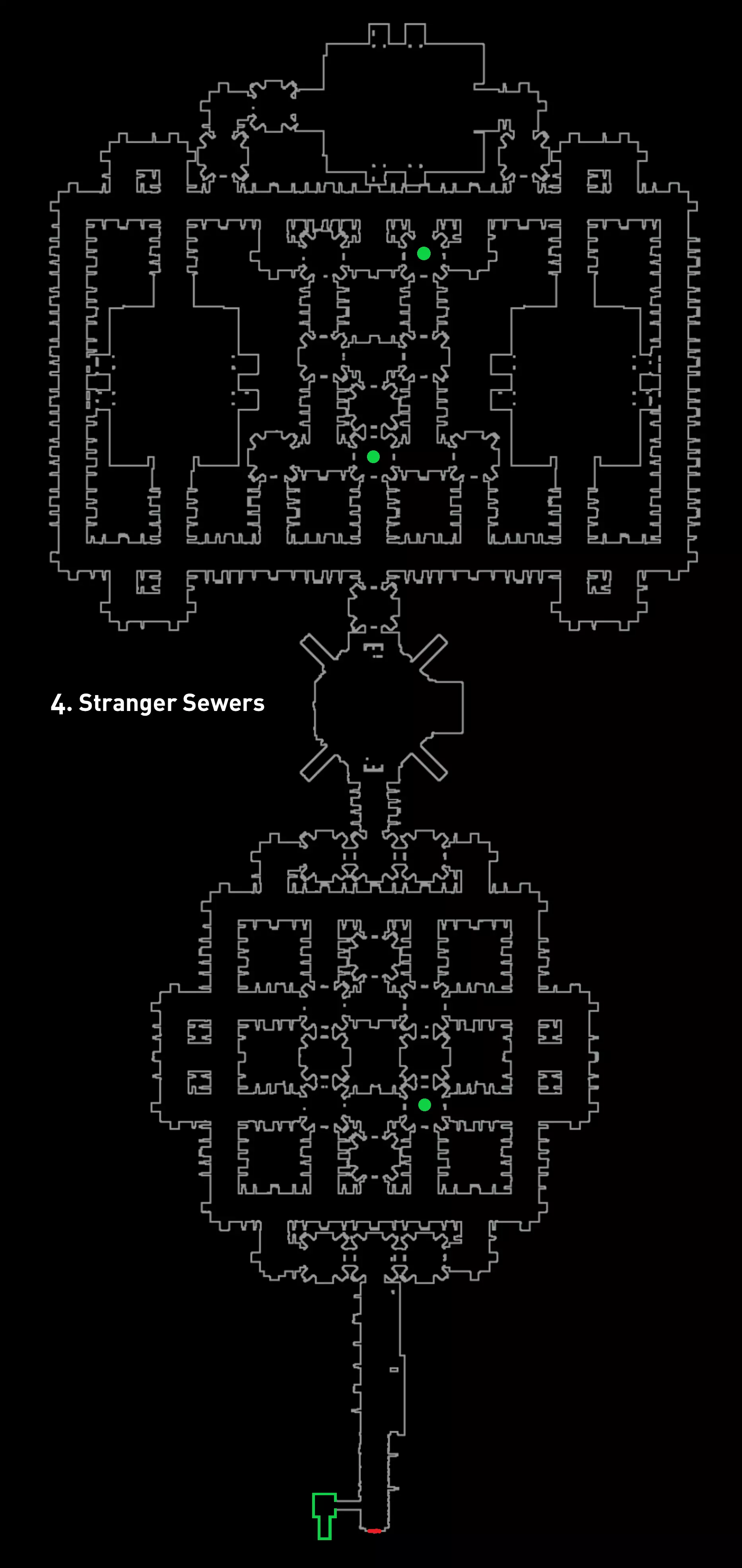 【战术】: 第一种 - 基础战术。你只需跑动,留意黄金观察者。当听到“嘶嘶”声时,意味着它们就在你正后方——立刻转身!然后迅速退开,但要小心别被其他方向的黄金观察者抓住哦;留意脚步声,因为脚步声能告诉你黄金观察者的位置(建议使用立体声耳机)。 第二种 - 待在地图角落,转身等待黄金观察者靠近你——你可以通过脚步声判断它们何时靠近,所以要仔细听!这应该不难,因为脚步声很大,很容易听到。 当你能看到所有黄金观察者时,就正常跑动,但你的视线只需盯着你看到它们的那个地方。这样他们就无法移动,但【注意】!要留意陷阱,因为很容易掉进去! (地图辅助:秘密用绿色标记 - 关卡起点用红色标记,黄色标记为大门和新区域入口) Boss战流程: 在从宅邸(别墅)出来后,会与Boss“Titan Watcher(s)”展开战斗。你会身处一个大广场,周围全是敌人“Malak”,上方还有巨大的“Titan Watcher”向你投掷镰刀。它会直接朝你投掷镰刀,你需要躲避。你必须时不时站在大门下方等待投掷。当镰刀两次击中大门上的木栓时,你就可以离开了。不过在整个过程中,你必须像绕着广场转圈一样行动,因为会有太多敌人想要杀你。穿过大门后,传送门后面会立刻出现第二个泰坦守望者,这个只会向你射击,不需要你解锁任何东西,所以只需避开敌人冲向传送门。 陌生下水道 这个关卡并不难,但很长——因为碎片收集得很慢。水会减慢我们的速度,接下来会详细说明一切。统计数据: 碎片 - 310 区域 - 2 敌人 - 恐惧鸭子 Boss - 末日鸭子 技能:心灵感应 - 允许我们透过墙壁看到敌人 Boss难度 - 简单 关卡难度 - 简单 敌人数量 - 随机/未知 关卡内容:由于水的原因,需要缓慢收集水晶,判断哪只鸭子是“坏”的 - 有时需要逃跑和开门。 “战术”: