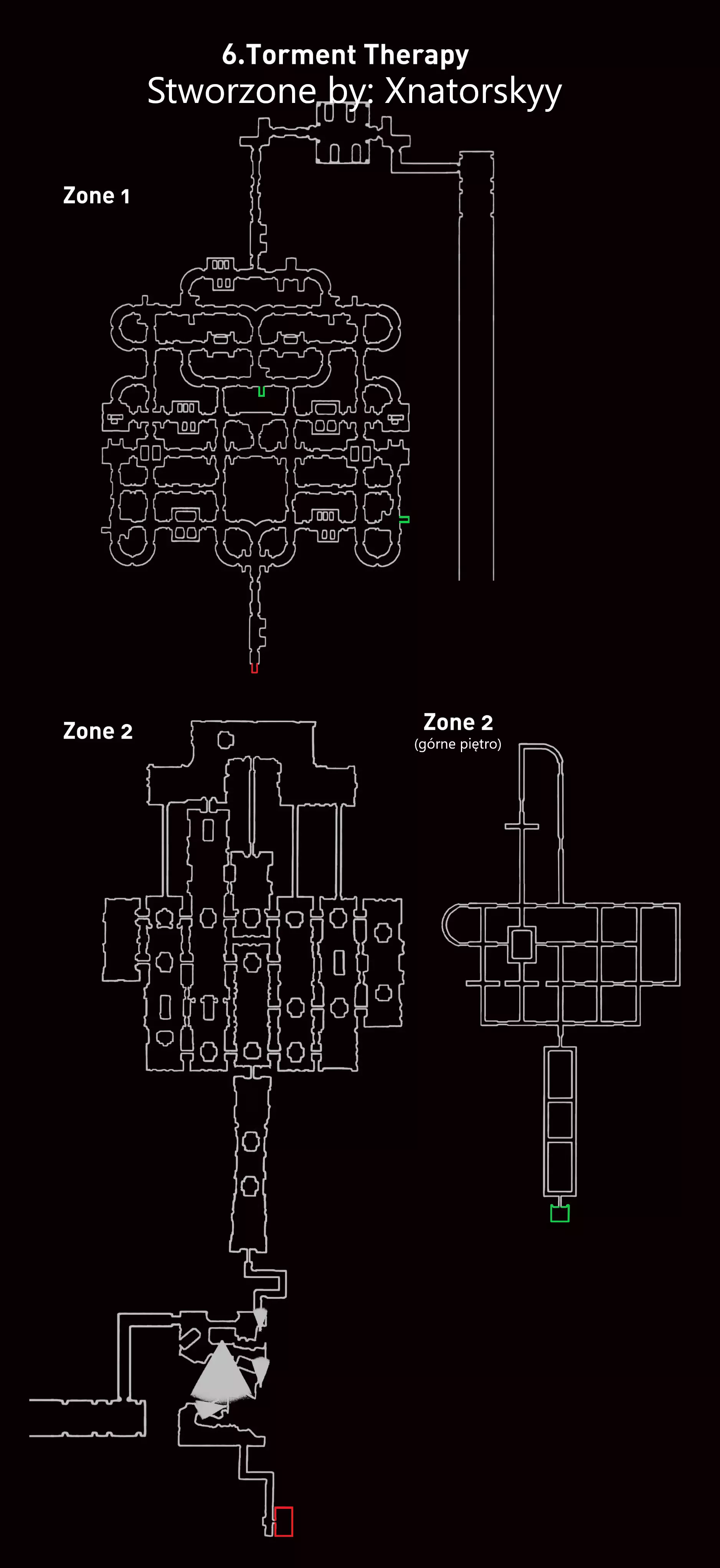 我在地图上添加了箭头,以便更好地显示秘密地点的位置,不过地图虽然很大但仍不完整。另外两个秘密地点的位置如下:一个在初始区域的大帐篷里,当你通过梯子爬到顶部时可以找到;另一个在区域之间,当你身处祭坛环附近的封闭房间时,墙壁上会随机打开一扇门,你肯定不会错过它,记得收集就行。 关卡“战术”: 使用原始恐惧技能让敌人无法追上你。尽量大幅度避开车辆和陷阱。利用传送门传送到其他楼层,以此来躲避小丑。 尽量远离汽车,因为只有当汽车靠近你时,小丑才会从里面跳出来(并进行复制)。当你无处可逃时,要尽快在这样的车辆上使用【原始恐惧】来摆脱它。 关于第二区域的战术,就是每隔一段时间用心灵感应查看小丑的位置,然后远远躲开,因为它们经常成群结队。最后你们将不得不冒险在它们附近收集水晶,但小丑本身移动非常缓慢,很容易甩掉,所以这不算挑战;3 Boss战流程: 我们会获得一把锤子,一群小丑会追我们——可以用锤子击杀小丑,但不建议这么做,因为锤子有延迟,很容易死亡…… 我们周围能看到巨大的小丑,每隔几秒小丑会把它们的武器扔到地上。用锤子击打武器——这样就能杀死所有小丑……(1个小丑=2拳=2次攻击=1个被打倒的小丑)共有6个小丑…… 小知识:该关卡最初名为“CARNEVILS”。实际上在第三章发布前的最后时刻才更改了名称。直到现在,尽管进行了此次更改,在该关卡获得S级评价的成就图标上,仍然显示着旧名称,你们可以自己去确认。折磨疗法 新的生命系统让游戏变得简单了很多,但总体来说这是最难的难度(当然这只是对我而言,目前是这样) 统计数据: 地点 - 医院 碎片 - 679 区域 - 2 敌人 - 收割者护士 Boss - 护士长 技能:心灵遥感 - 允许使用所谓的冲击波收集特定区域内的水晶。 Boss难度 - 中等 关卡难度 - 不可能 敌人数量 - 6名护士 关卡要点:躲避收割者护士,她们可以隐形并且速度非常快;) 玩家@JustKacper撰写的策略: 在区域1使用心灵感应来了解护士的位置,以避免意外遇到她们(尤其是她们会隐形的时候)。如果他们开始追我们,我们就把他们聚集到身边,使用原始恐惧技能,然后逃离他们的视线范围。 在区域2有个有趣的战术。具体来说,我们乘电梯到更高的楼层,然后使用心灵遥感,同时从两层收集水晶。 --- Boss战流程: 我们在一辆行驶的卡车上,我们的任务是从一辆卡车传送到另一辆卡车,直到拿到注射器,用注射器把爬上卡车的收割者护士赶下去。 收割者护士必须被击晕(原始恐惧或眩晕球)才能被赶下去。永远不要在击败收割者护士后立即传送,这样才能攻击到护士长(Boss)。 护士长(Boss)在受到4次攻击后死亡。 地图: (在这种情况下地图非常大,因为关卡规模很大,不像小地图时那样清晰可见)