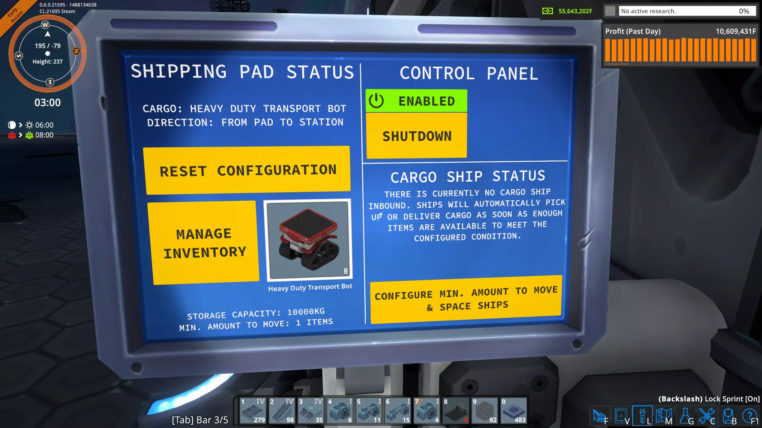 我正在使用T2版本。 还有一个注意事项,我要说明的是,我将货运平台(中型)限制为仅允许中型船只使用,不允许小型船只占用。 首次测试 - 小型货船T2/低级货运平台(小型)/最小货物量 在首次测试中,我设置了一个场景:低级货运平台上只有一个机器人;如果那里完全没有货物,测试就无法进行。在平台面板上,我将“移动的最小数量”设置为1。这样做是为了确保船只在平台停留的时间最短。