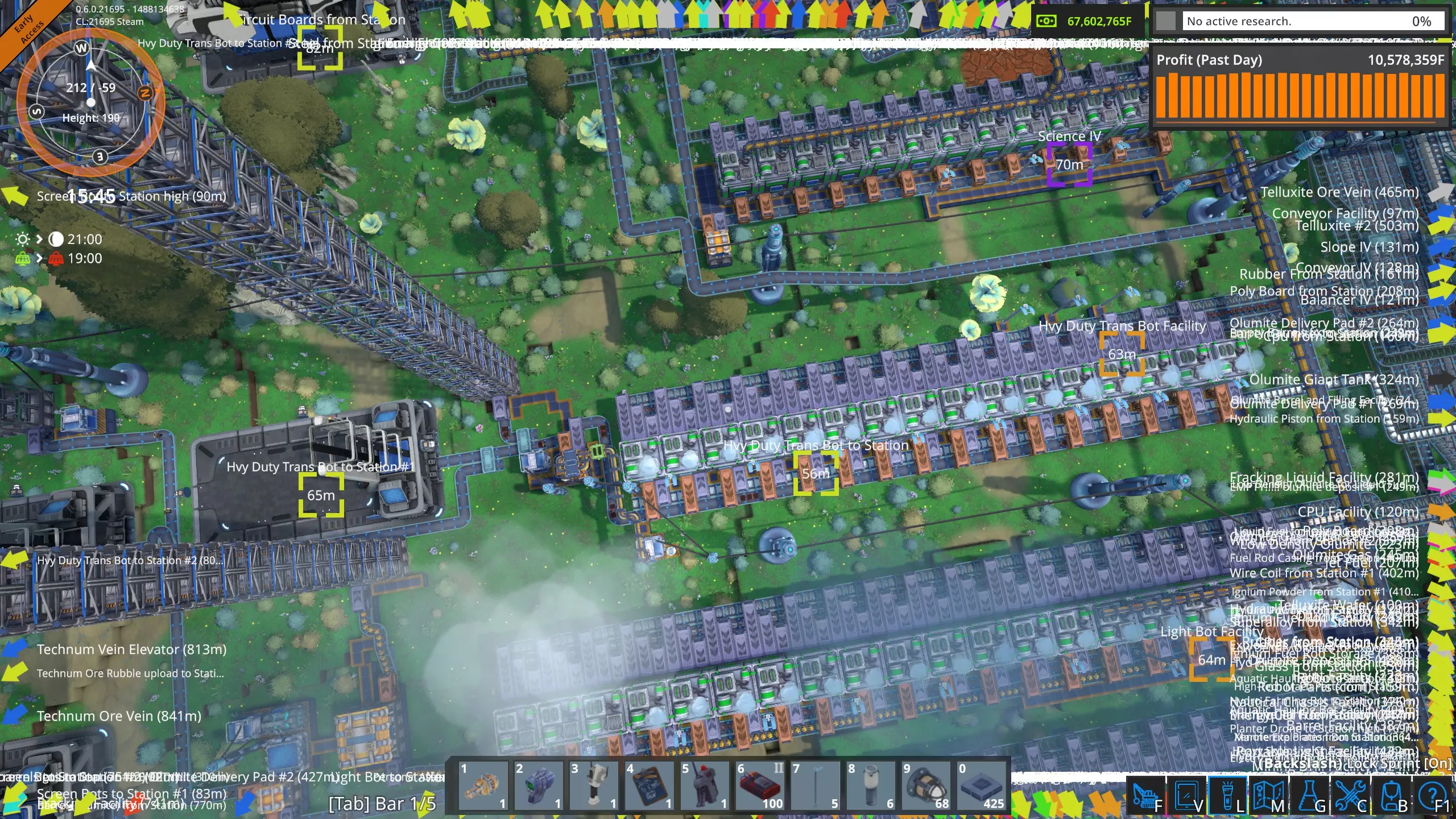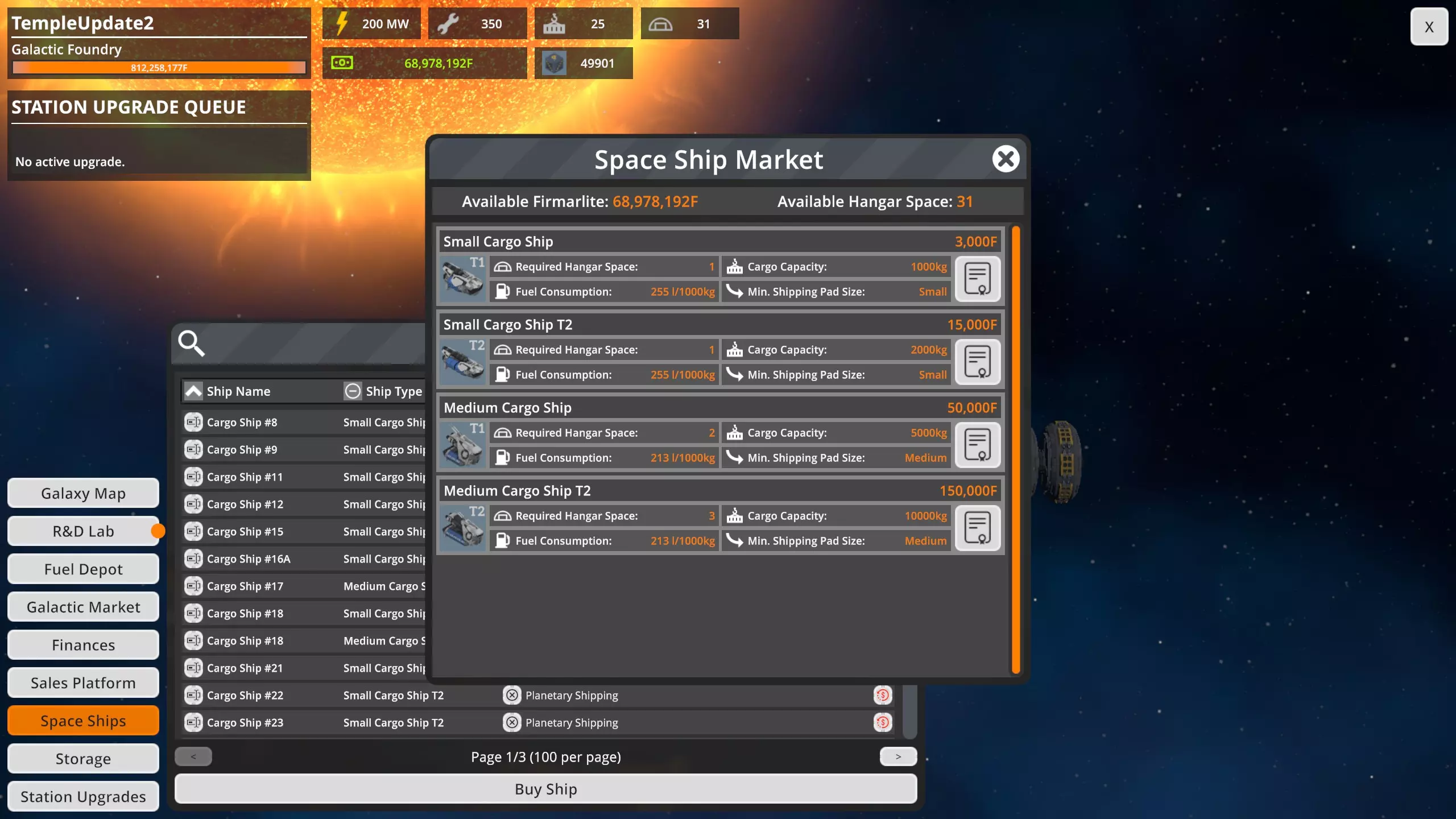 从空间站财务界面来看,目前35个星球每小时对重型运输机器人的需求量为10,994个。但我需要多少艘中小型飞船以及低/高停机坪才能满足这一需求呢? 要知道具体数量,我们需要确定每种飞船尺寸与停机坪高度组合的每小时上传速率。为此,我们需要了解前往低停机坪和高停机坪的往返时间。我们假设地面的生产速率以及用于补充停机坪的传送带和升降机足以在飞船停靠时将其装满。 此外,我们将高停机坪的往返时间设定为20秒,低停机坪为30秒。这里存在一些四舍五入,但对于比较而言应该足够准确。 小型飞船,低停机坪:往返时间为64秒,即每小时56次。每小时25次往返 每次往返可运送66个机器人,即每小时3712个 小型飞船,高平台 往返一次需54秒,即每小时66.66次往返 每次往返可运送66个机器人,即每小时4440个 中型飞船,低平台 往返一次需78秒,即每小时46.2次往返 每次往返可运送333个机器人,即每小时15384个 中型飞船,高平台 往返一次需68秒,即每小时52.9次往返 每次往返可运送333个机器人,即每小时17615个 因此,在【FOUNDRY】这种每小时需要上传约一万一千个重型运输机器人的情况下,我需要三艘小型T2飞船从三个小型平台运行,无论这些平台是在地面还是在最高高度。但我只需要一艘中型飞船,无论它是在地面还是在高空。为了进行公平比较,我们将上一部分中的数据转换为上传重量。 以下列表中,所有飞船均视为对应尺寸的T2级。该列表还考虑到中型货运飞船仅允许在【中型货运平台】使用。上传至空间站的货物按重量计算,而非物品数量。往返时间包含装载货物的时间。在空间站卸载货物为即时完成。 要了解每小时可上传多少产品(机器人、无人机或机械人),请用下方列出的重量除以每件物品的重量(可在【制造界面】中查看)。请注意,通过在【研发实验室】投入点数,产品的原始重量最多可减少一半。考虑的两种情况分别是位于行星表面(高度约130)的停机坪,以及位于最大允许高度(约237)的停机坪。 小型货船,小型货运停机坪,位于表面: - 往返时间64秒,即每小时56.25次往返 - 每次往返载货2000千克,即每小时112500千克 小型货船,小型货运停机坪,位于约237高度: - 往返时间54秒,即每小时66.66次往返 - 每次往返载货2000千克,即每小时133320千克 中型货船,中型货运停机坪,位于表面: - 往返时间78秒,即每小时46.2次往返 - 每次往返载货10000千克,即每小时462000千克 中型货船,中型货运停机坪,位于约237高度: - 往返时间68秒,即每小时52次往返每小时9次往返。每次往返运输10,000千克,即每小时529,000千克。