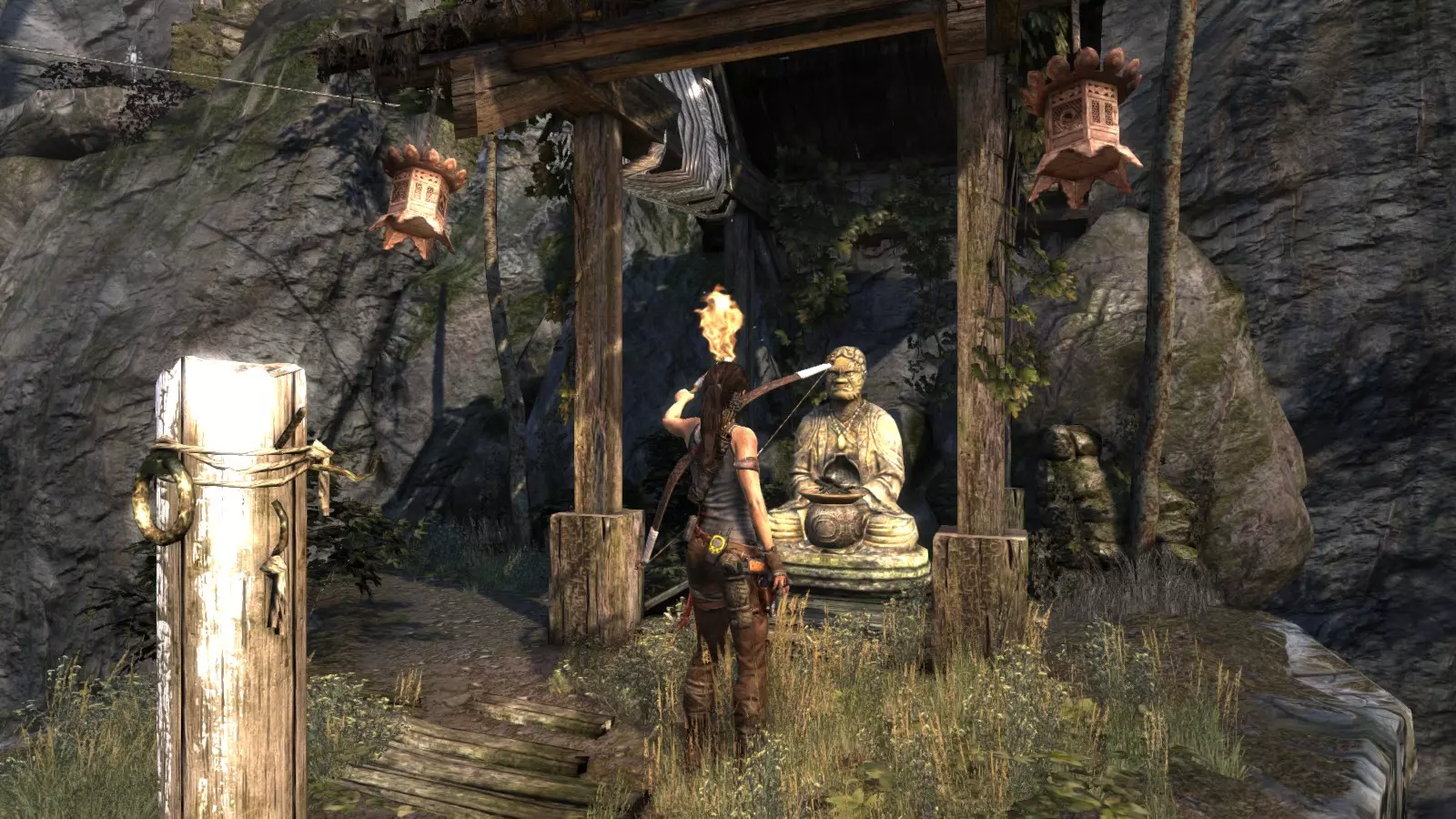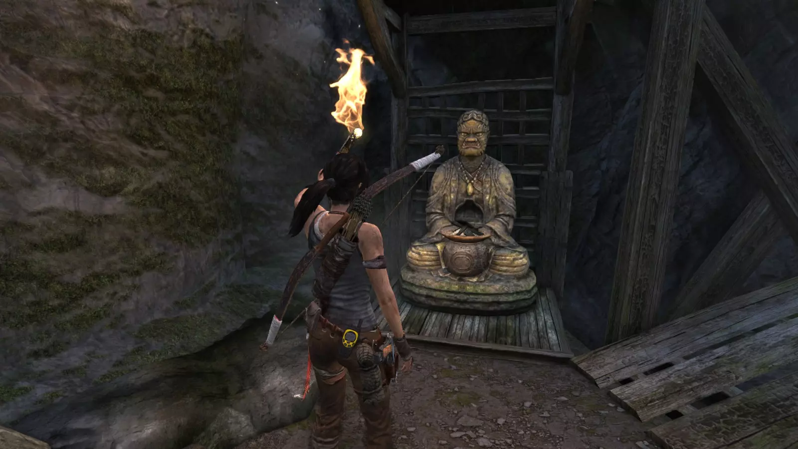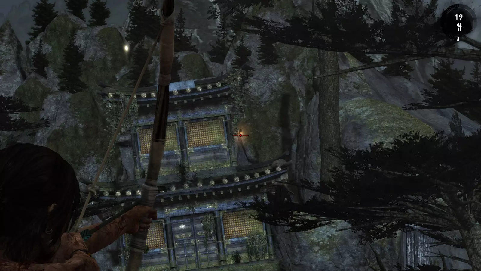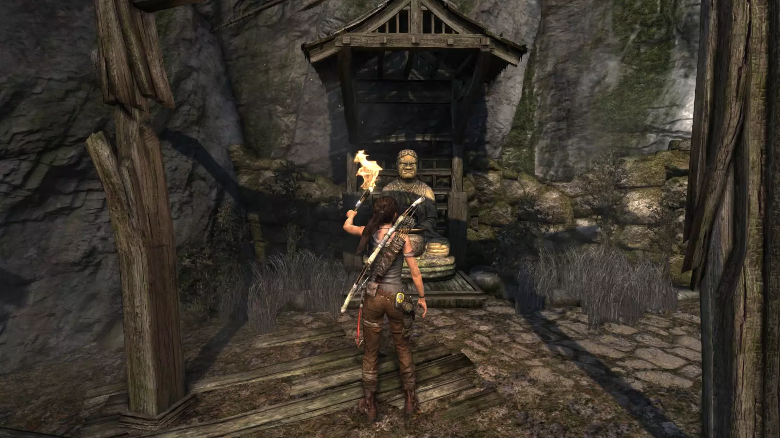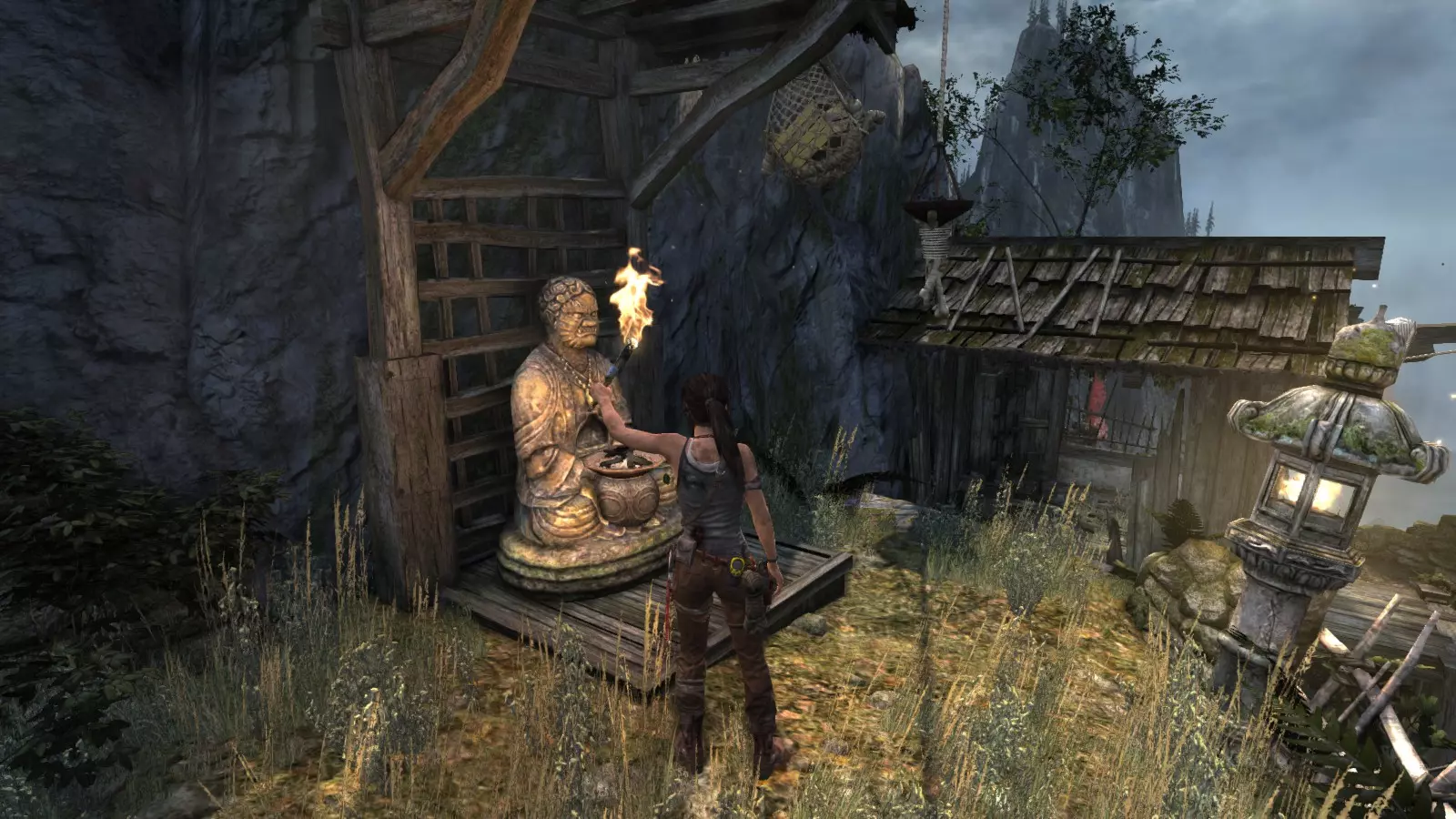 山间村落 - 点亮雕像 逃离神殿和太阳神庙守卫后,劳拉将穿过一条狭窄的通道去寻找罗斯,她看到罗斯正在抵御狼群。这个村落的挑战是最耗时完成的,因为劳拉会在多次往返中经过这个村落,并非每次都能进入挑战所在的区域。 点亮雕像挑战需要点燃分布在整个村落的10座雕像的火焰。完成此挑战需要装备冰镐、绳箭和霰弹枪,因此要等到发现卑弥呼古墓并逃离鬼武士之后才能完成。 点亮雕像1
