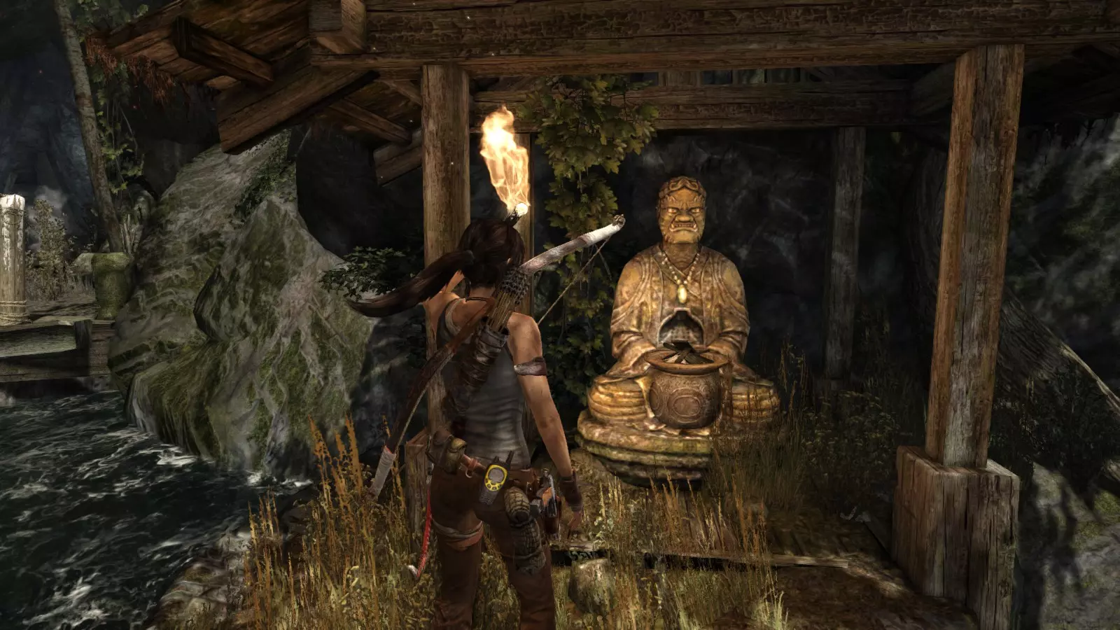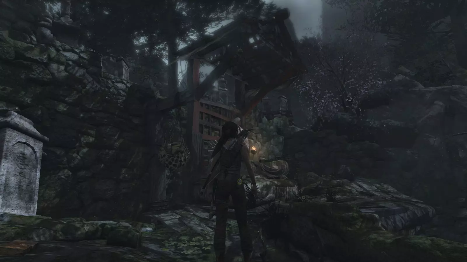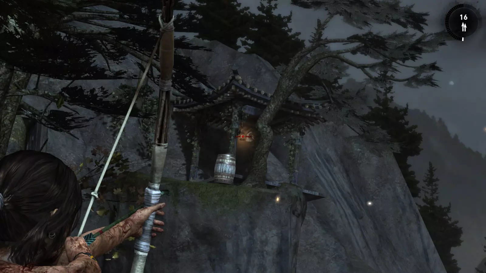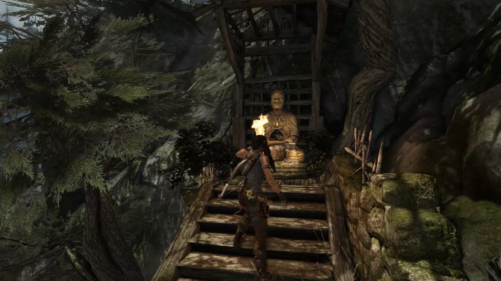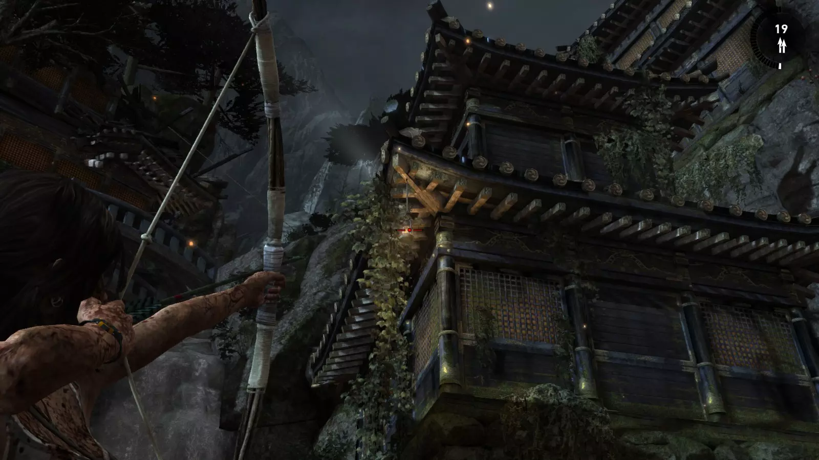 山间村落 - 点亮雕像 逃离神殿和太阳神庙守卫后,劳拉将穿过一条狭窄的通道去寻找罗斯,她看到罗斯正在抵御狼群。这个村落的挑战是最耗时完成的,因为劳拉会在多次往返中经过这个村落,并非每次都能进入挑战所在的区域。 点亮雕像挑战需要点燃分布在整个村落的10座雕像的火焰。完成此挑战需要装备冰镐、绳箭和霰弹枪,因此要等到发现卑弥呼古墓并逃离鬼武士之后才能完成。 点亮雕像1