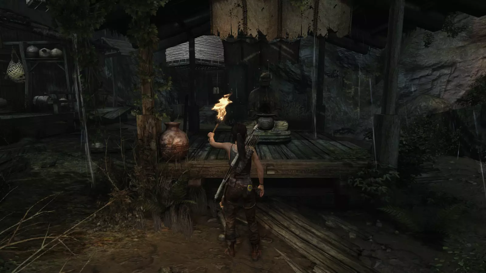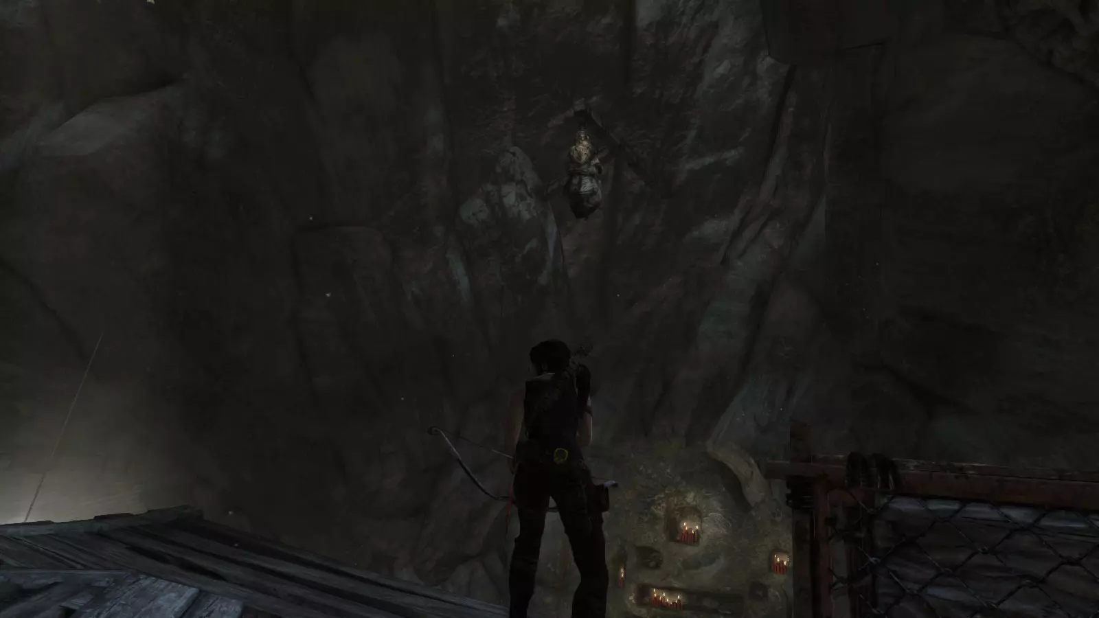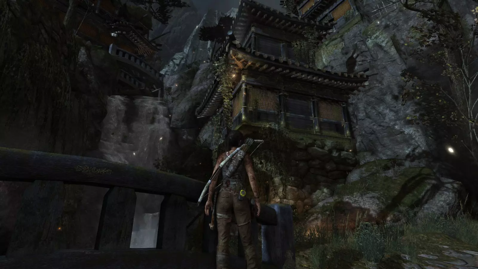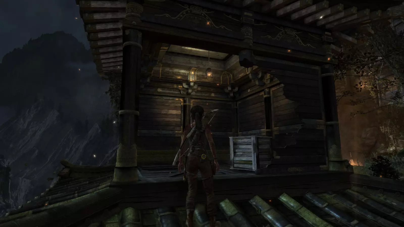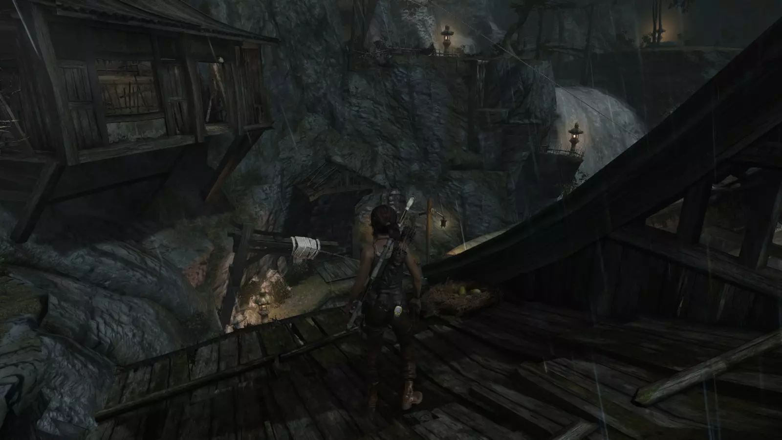 山间村落 - 点亮雕像 逃离神殿和太阳神庙守卫后,劳拉将穿过一条狭窄的通道去寻找罗斯,她看到罗斯正在抵御狼群。这个村落的挑战是最耗时完成的,因为劳拉会在多次往返中经过这个村落,并非每次都能进入挑战所在的区域。 点亮雕像挑战需要点燃分布在整个村落的10座雕像的火焰。完成此挑战需要装备冰镐、绳箭和霰弹枪,因此要等到发现卑弥呼古墓并逃离鬼武士之后才能完成。 点亮雕像1