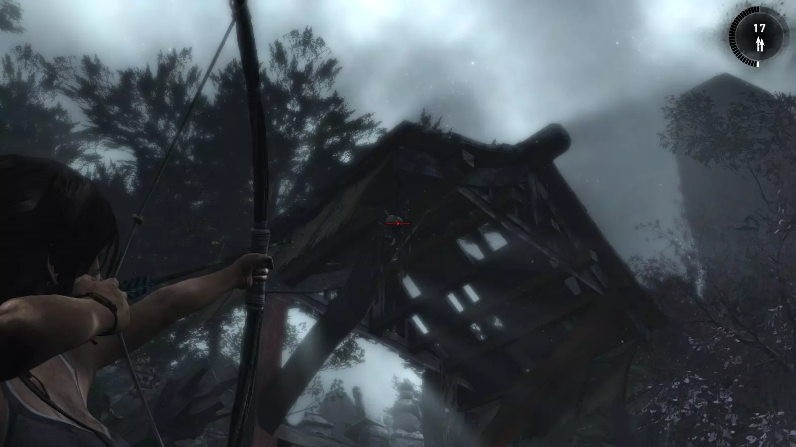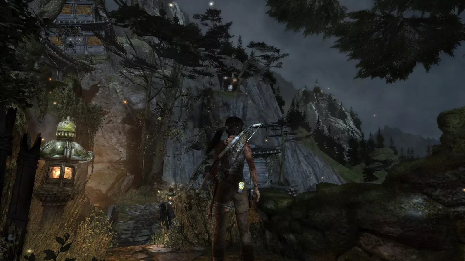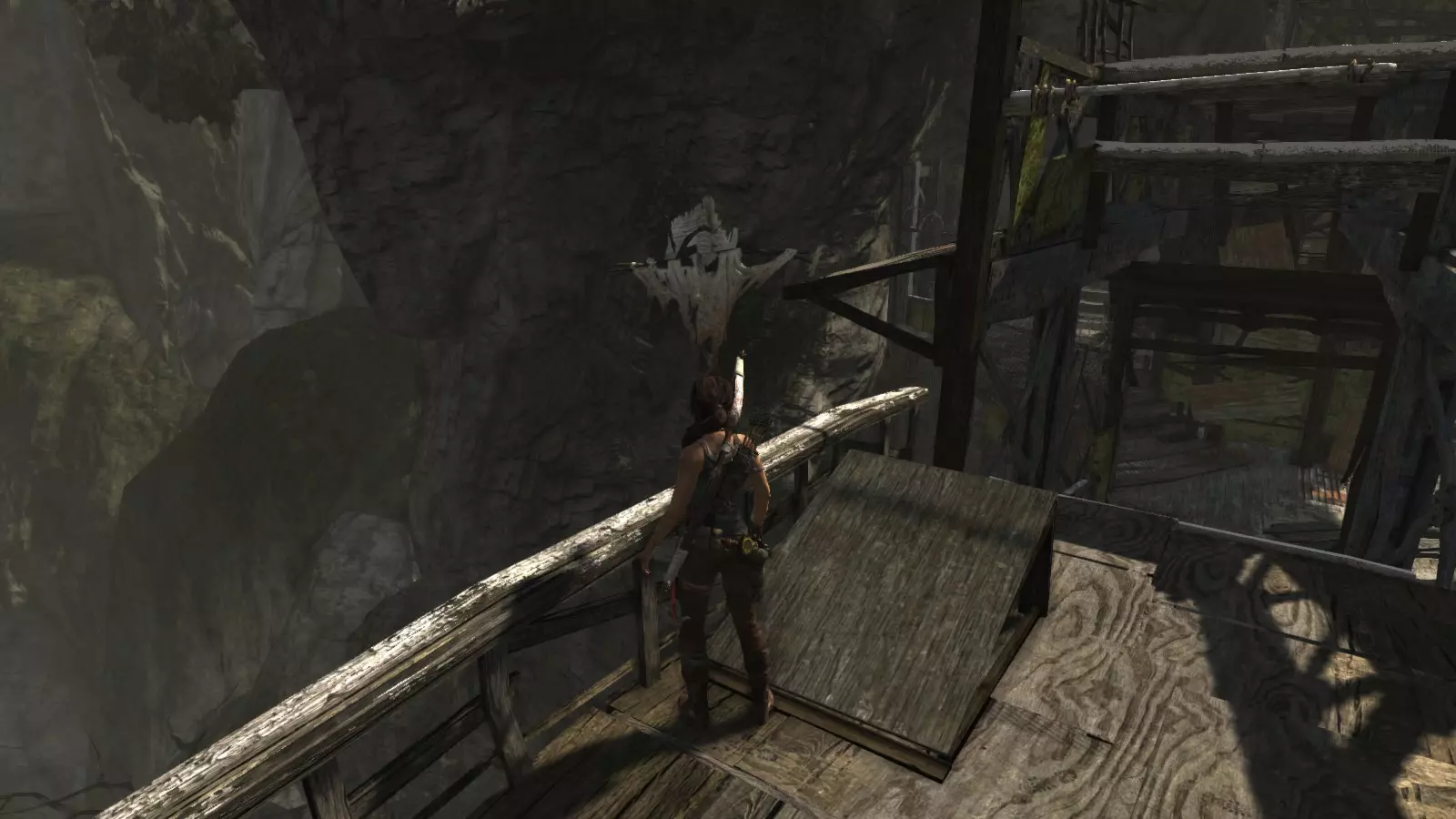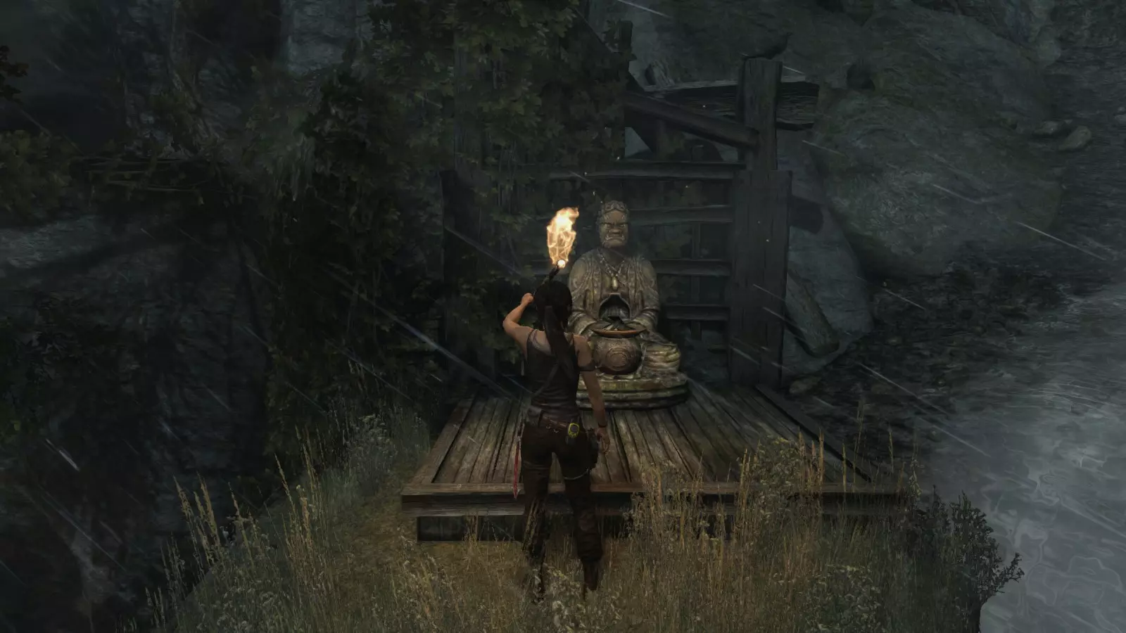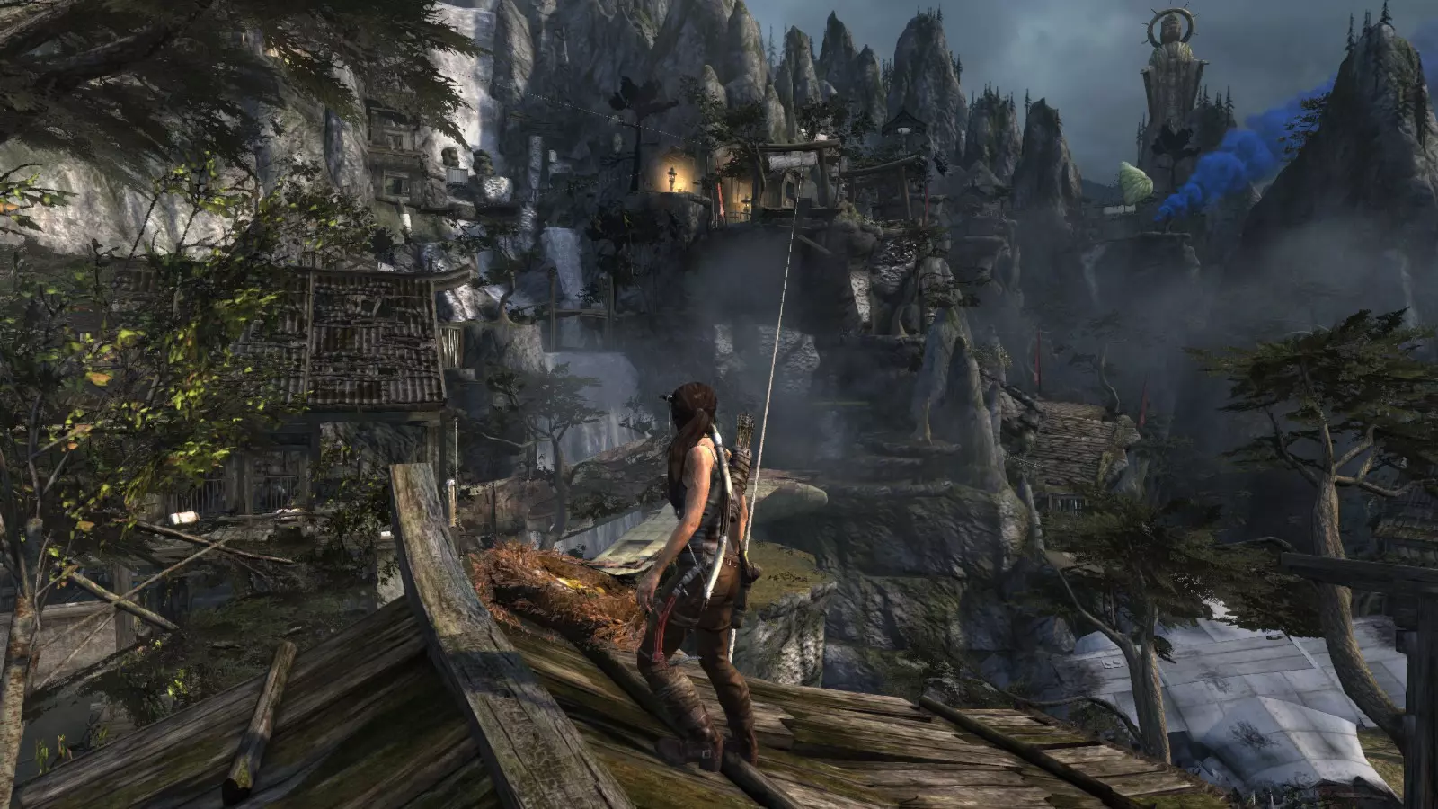 山间村落 - 点亮雕像 逃离神殿和太阳神庙守卫后,劳拉将穿过一条狭窄的通道去寻找罗斯,她看到罗斯正在抵御狼群。这个村落的挑战是最耗时完成的,因为劳拉会在多次往返中经过这个村落,并非每次都能进入挑战所在的区域。 点亮雕像挑战需要点燃分布在整个村落的10座雕像的火焰。完成此挑战需要装备冰镐、绳箭和霰弹枪,因此要等到发现卑弥呼古墓并逃离鬼武士之后才能完成。 点亮雕像1