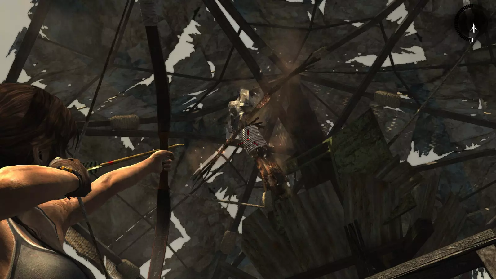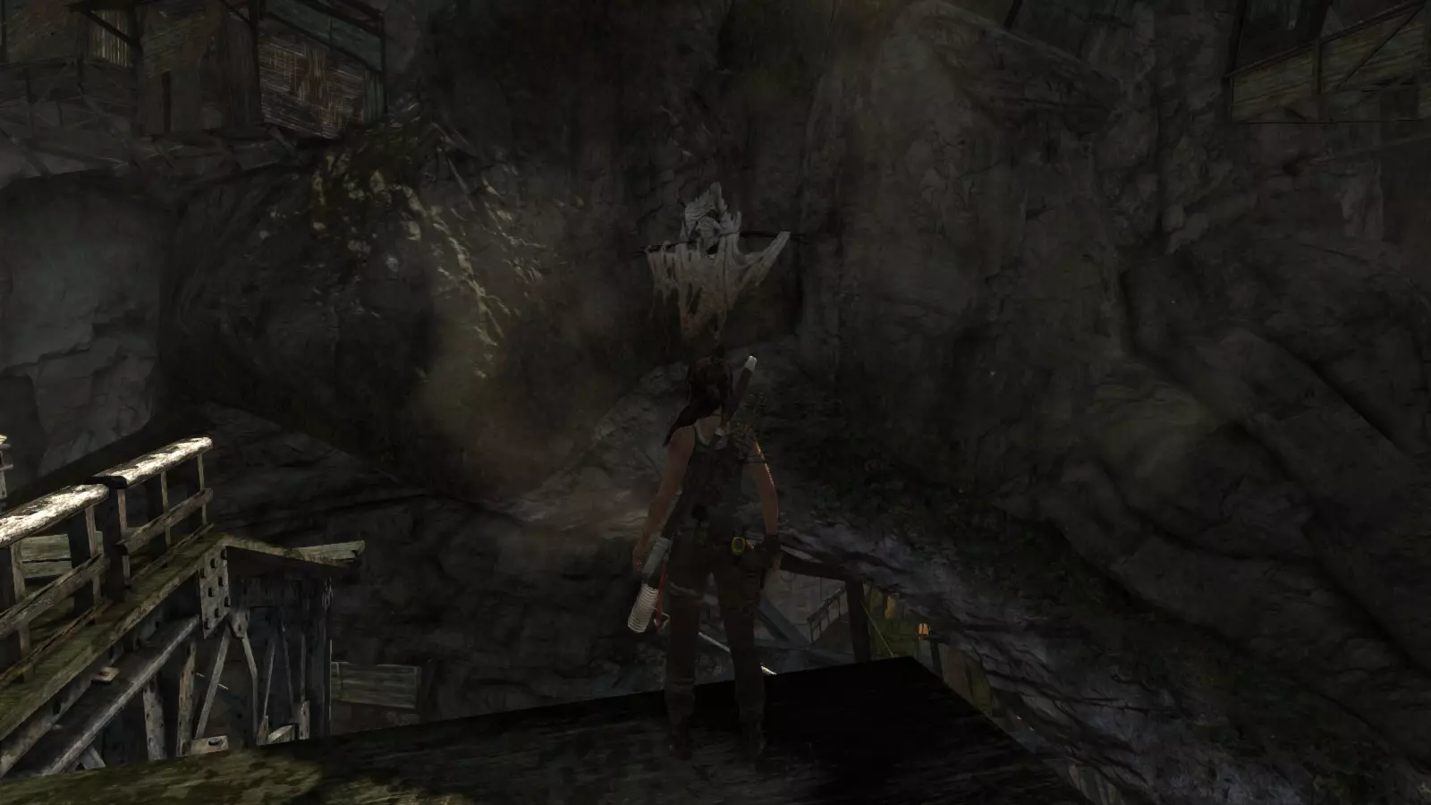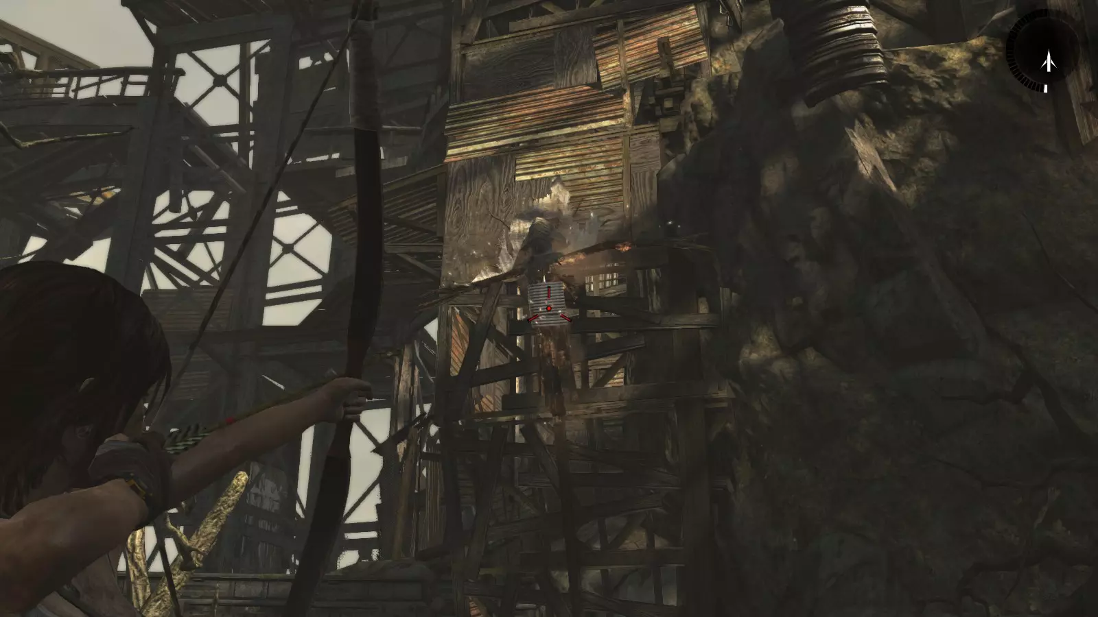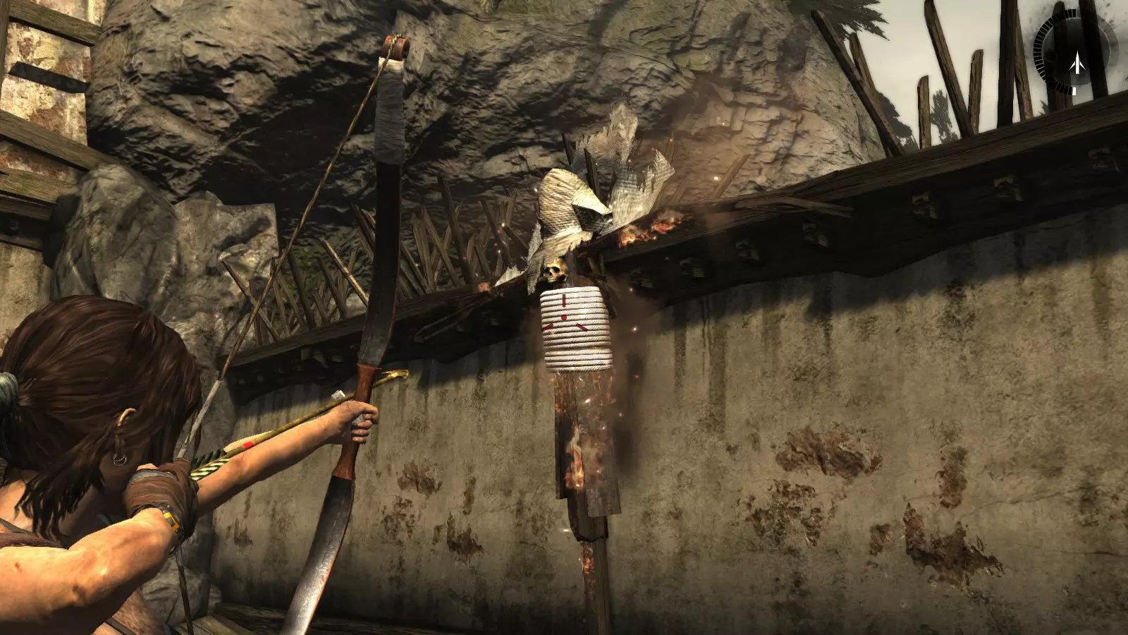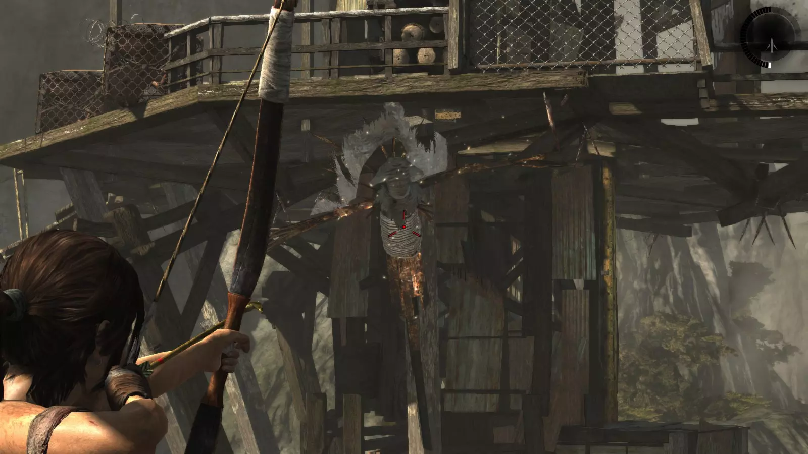 山间村落 - 点亮雕像 逃离神殿和太阳神庙守卫后,劳拉将穿过一条狭窄的通道去寻找罗斯,她看到罗斯正在抵御狼群。这个村落的挑战是最耗时完成的,因为劳拉会在多次往返中经过这个村落,并非每次都能进入挑战所在的区域。 点亮雕像挑战需要点燃分布在整个村落的10座雕像的火焰。完成此挑战需要装备冰镐、绳箭和霰弹枪,因此要等到发现卑弥呼古墓并逃离鬼武士之后才能完成。 点亮雕像1