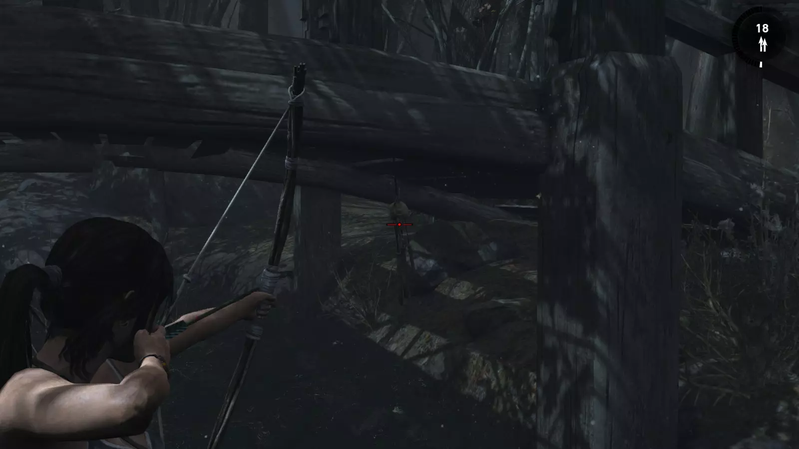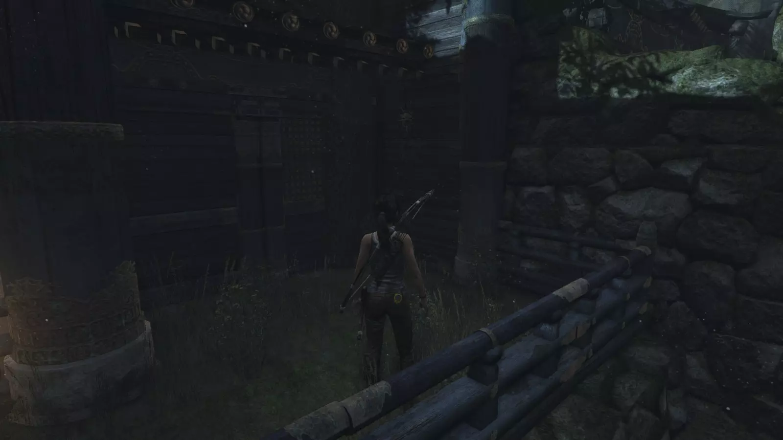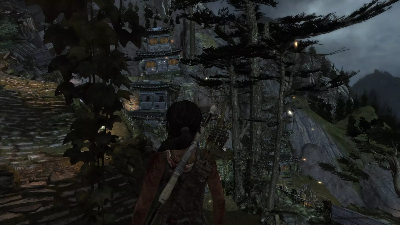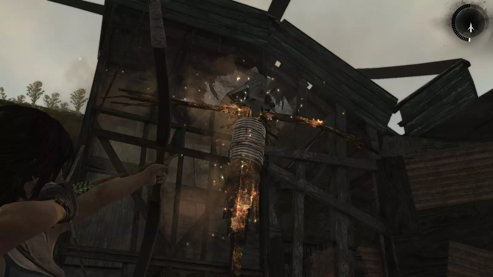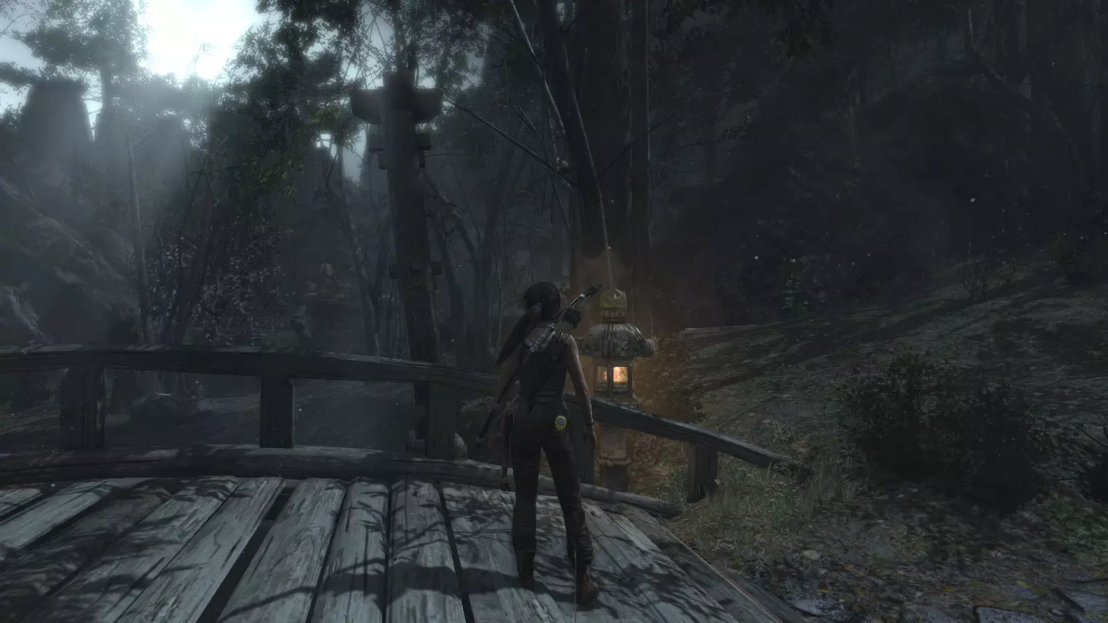 山间村落 - 点亮雕像 逃离神殿和太阳神庙守卫后,劳拉将穿过一条狭窄的通道去寻找罗斯,她看到罗斯正在抵御狼群。这个村落的挑战是最耗时完成的,因为劳拉会在多次往返中经过这个村落,并非每次都能进入挑战所在的区域。 点亮雕像挑战需要点燃分布在整个村落的10座雕像的火焰。完成此挑战需要装备冰镐、绳箭和霰弹枪,因此要等到发现卑弥呼古墓并逃离鬼武士之后才能完成。 点亮雕像1