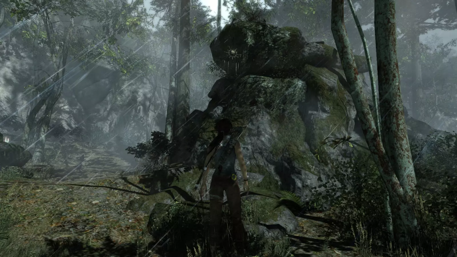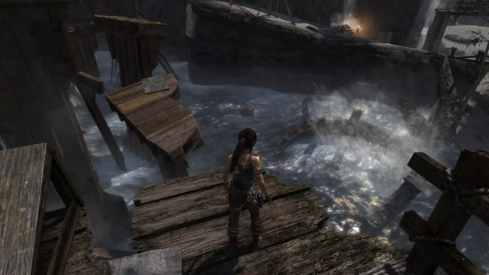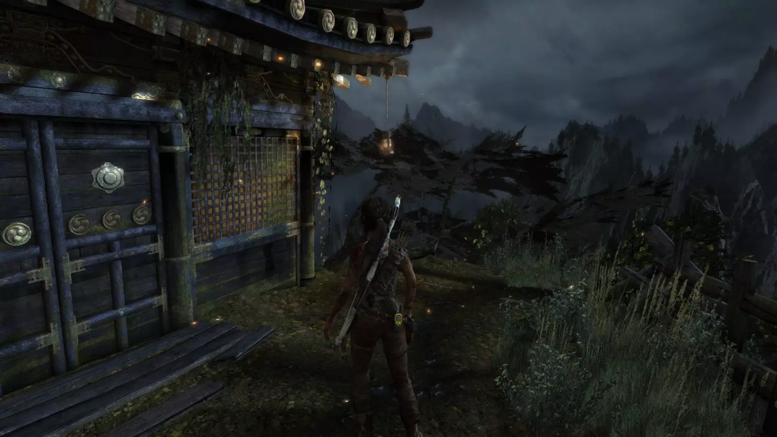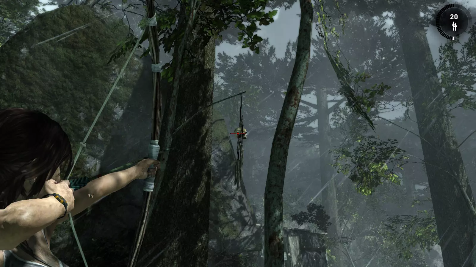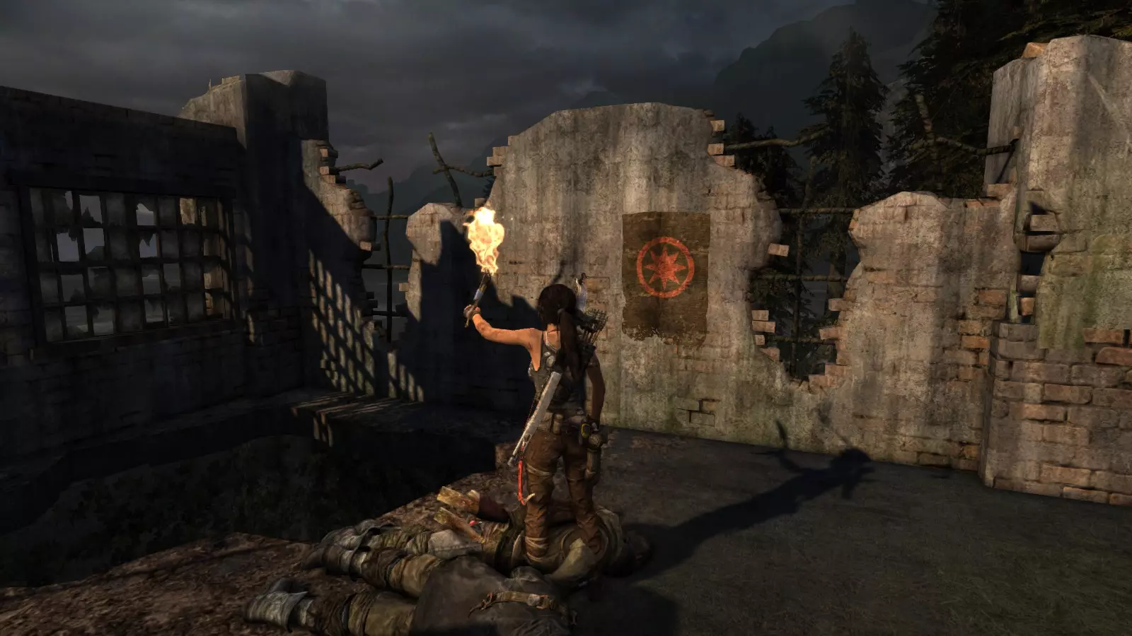 山间村落 - 点亮雕像 逃离神殿和太阳神庙守卫后,劳拉将穿过一条狭窄的通道去寻找罗斯,她看到罗斯正在抵御狼群。这个村落的挑战是最耗时完成的,因为劳拉会在多次往返中经过这个村落,并非每次都能进入挑战所在的区域。 点亮雕像挑战需要点燃分布在整个村落的10座雕像的火焰。完成此挑战需要装备冰镐、绳箭和霰弹枪,因此要等到发现卑弥呼古墓并逃离鬼武士之后才能完成。 点亮雕像1