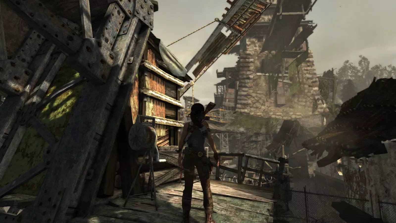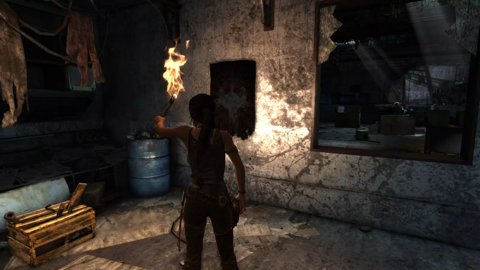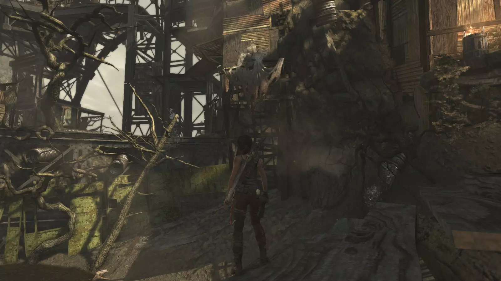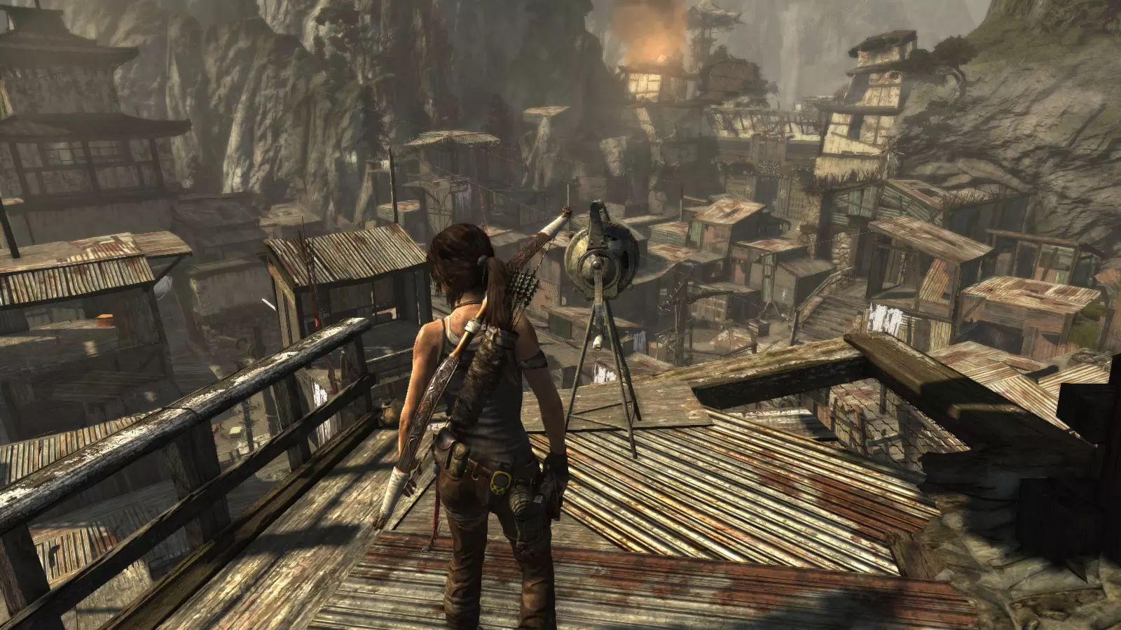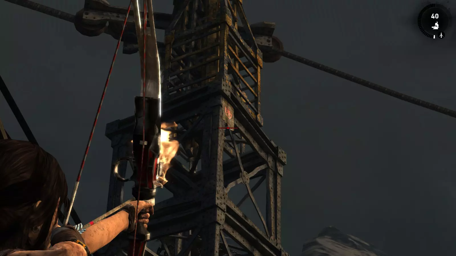 山间村落 - 点亮雕像 逃离神殿和太阳神庙守卫后,劳拉将穿过一条狭窄的通道去寻找罗斯,她看到罗斯正在抵御狼群。这个村落的挑战是最耗时完成的,因为劳拉会在多次往返中经过这个村落,并非每次都能进入挑战所在的区域。 点亮雕像挑战需要点燃分布在整个村落的10座雕像的火焰。完成此挑战需要装备冰镐、绳箭和霰弹枪,因此要等到发现卑弥呼古墓并逃离鬼武士之后才能完成。 点亮雕像1
