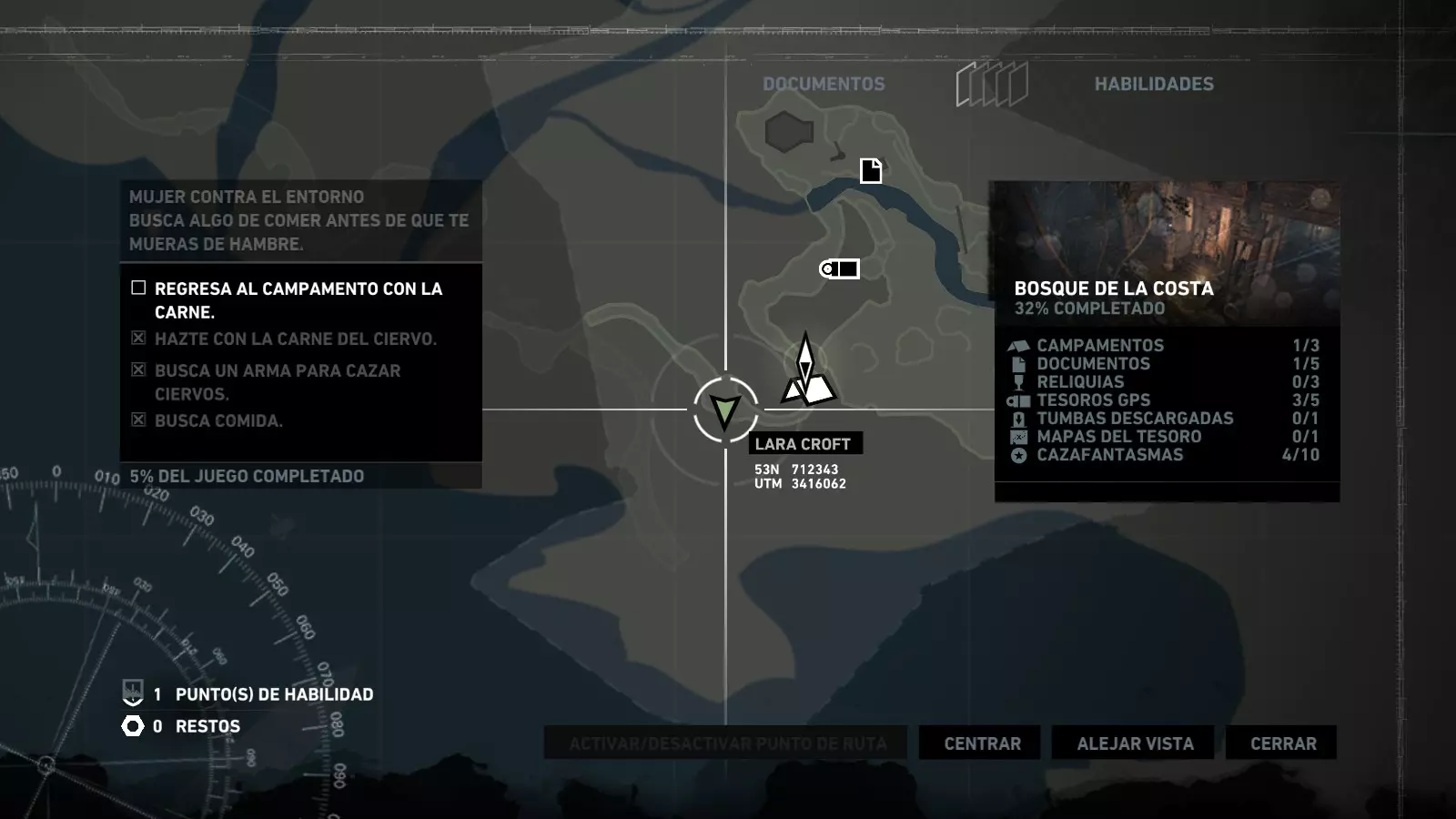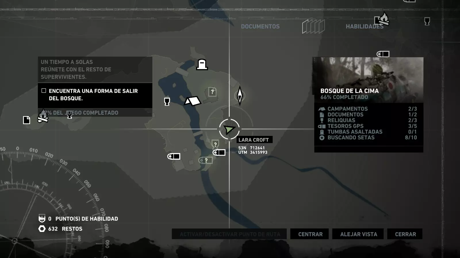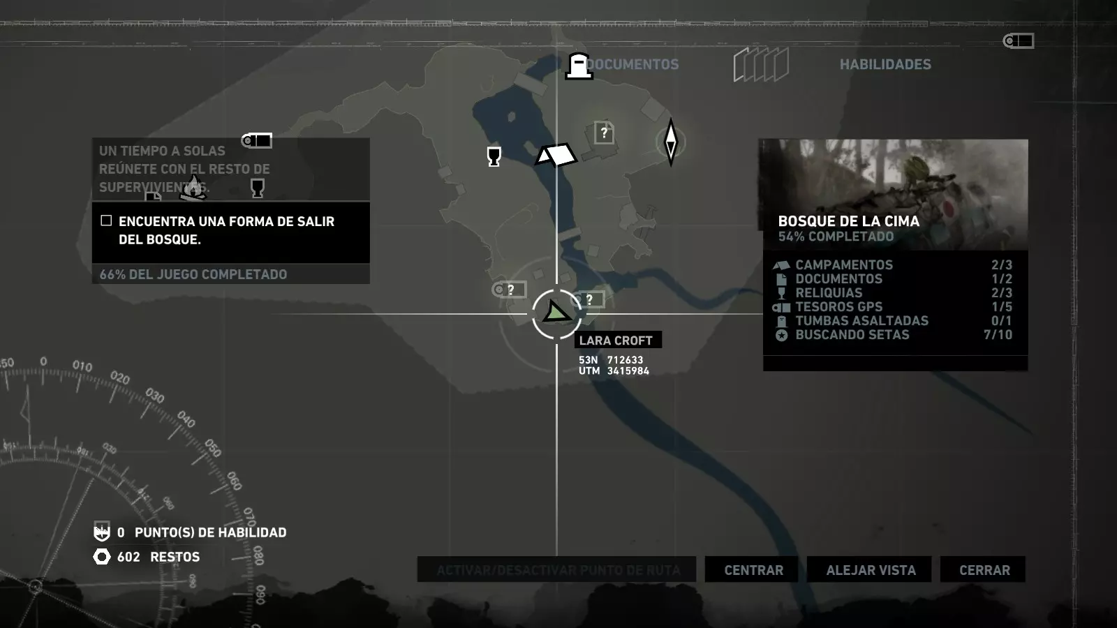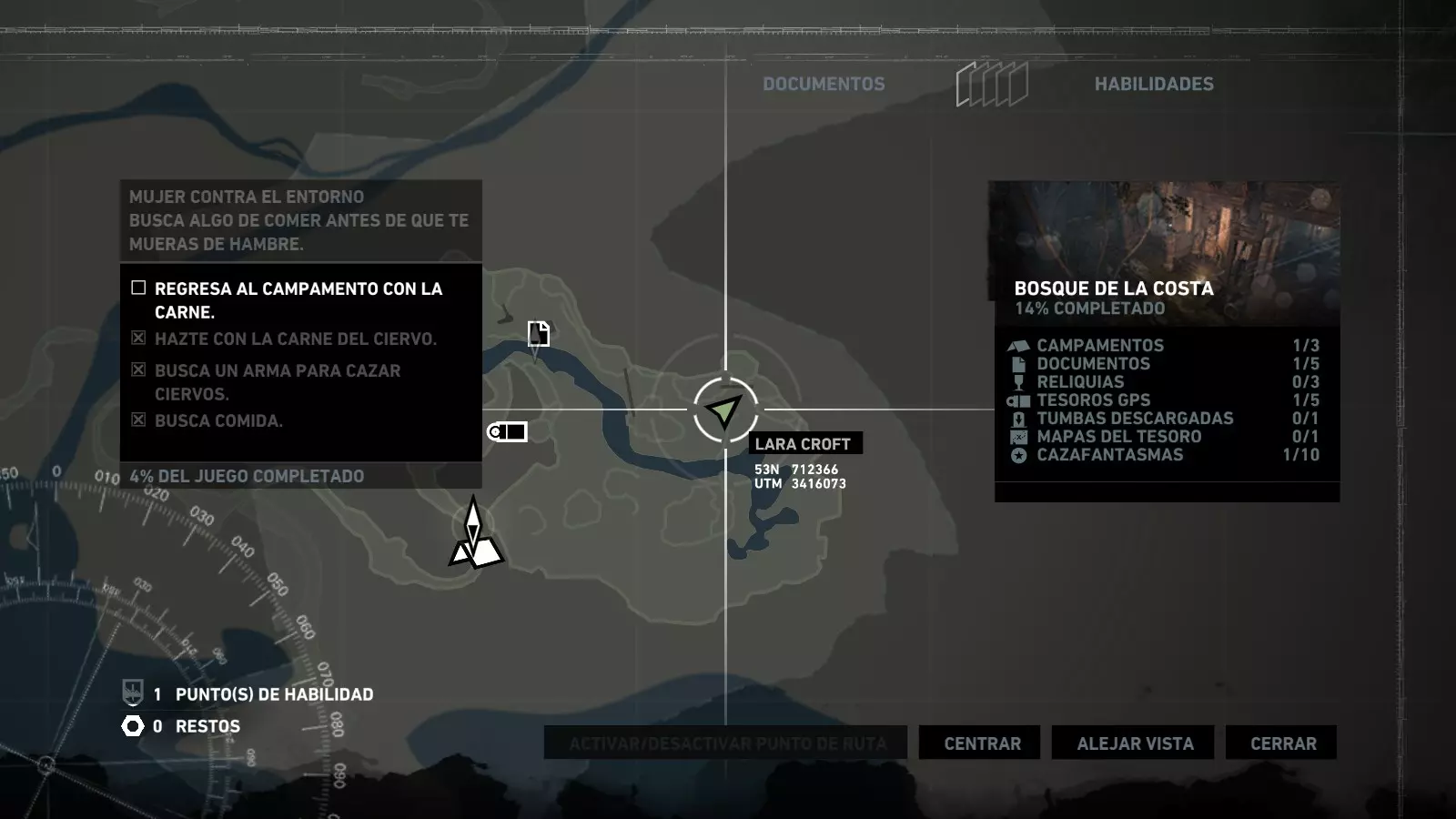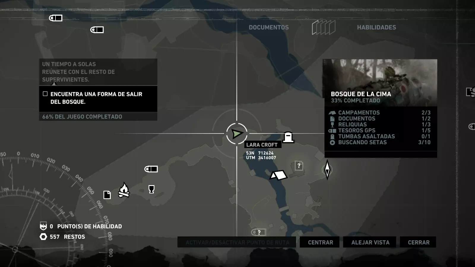 以下指南旨在帮助玩家轻松完成《古墓丽影》游戏中出现的各种挑战。每个挑战内容都配有地图图片以显示其位置,以及游戏内该位置的视角图,并附带文字说明如何到达该地点以及在游戏的哪个阶段进行。《古墓丽影》允许玩家随时返回之前的地点完成挑战,但本指南旨在让玩家在推进游戏进程的同时完成这些挑战。 简介 欢迎阅读我的《古墓丽影》挑战指南!本指南将指导你完成游戏中的各种挑战,帮助你找到或摧毁完成挑战所需的所有物品。 游戏中共有13个不同的挑战需要完成,包括收集蘑菇或鸡蛋、点燃雕像、摧毁海报或恐怖装饰品等。尽管游戏允许你在正常流程中未完成挑战时返回继续,但本指南旨在让你在游戏进程中直接达成100%完成度。因此,本指南将为岛屿的每个区域单独设立一个章节,说明需要完成的挑战以及它们的获取顺序;最后一个章节将按“时间顺序”整理各个元素,因为在某些情况下,由于我们没有必要的武器或工具,若不先经过其他区域,就无法完成某个区域的所有挑战。 每个元素将至少配有两张图片:其中一张是地图图片,根据劳拉·克劳馥的位置大致显示该元素所在的地点。在某些情况下,当挑战是收集或点燃附近的某个物品时,雷达的位置将指示离该物品最近的地方。在其他需要摧毁玩家位置远处物体的情况下,地图会通过绿色箭头显示劳拉的位置,而物体的位置则会用白色定位十字标记。 第二张图片会展示游戏中挑战所在位置的视角。需要说明的是,这两张图片是相关联的,也就是说,游戏内的视角与地图图片中显示的方向相对应。在某些情况下,如果相关物体难以看清,会有第三张图片,通过武器的缩放来更清晰地显示其位置。除了图片外,每个元素还会配有一段简短但清晰的说明,用于解释如何到达地图上指示的位置。 海岸森林 - 幽灵猎人 刚逃离食腐者巢穴,劳拉受伤又饥饿,她在森林中寻找避难所,同时继续追踪“坚忍号”同伴的踪迹。 在游戏的第一个区域,你的目标是找到并摧毁10个悬挂的图腾,这些图腾的中心有一个骷髅头。由于我们处于森林区域,且行动发生在暴风雨中或夜晚,有些图腾乍一看可能很难找到。 幽灵猎人1