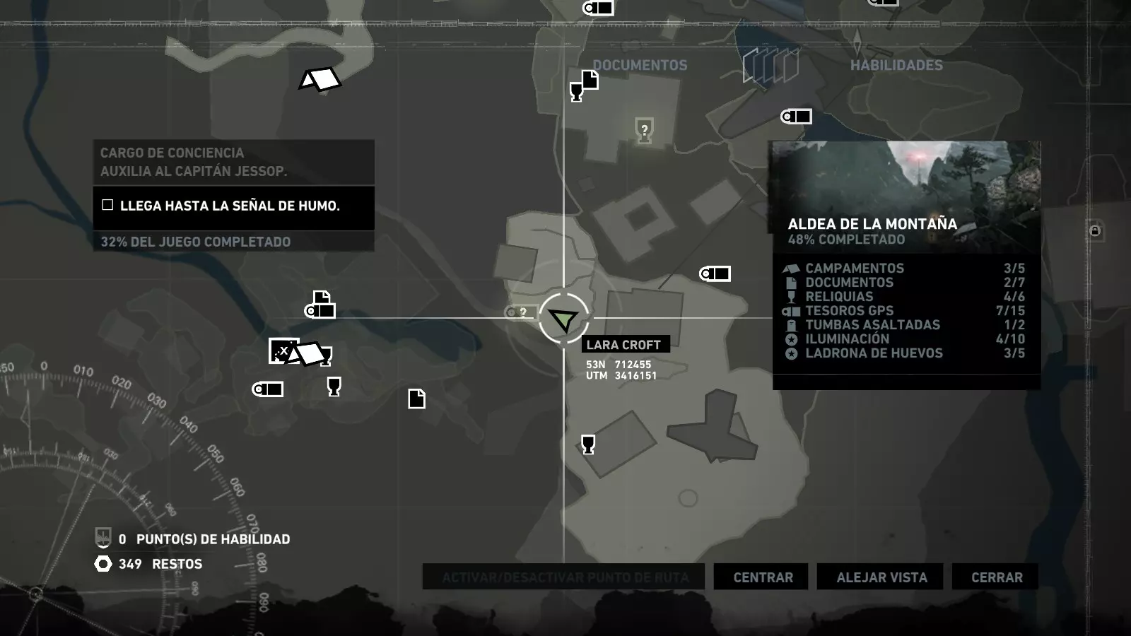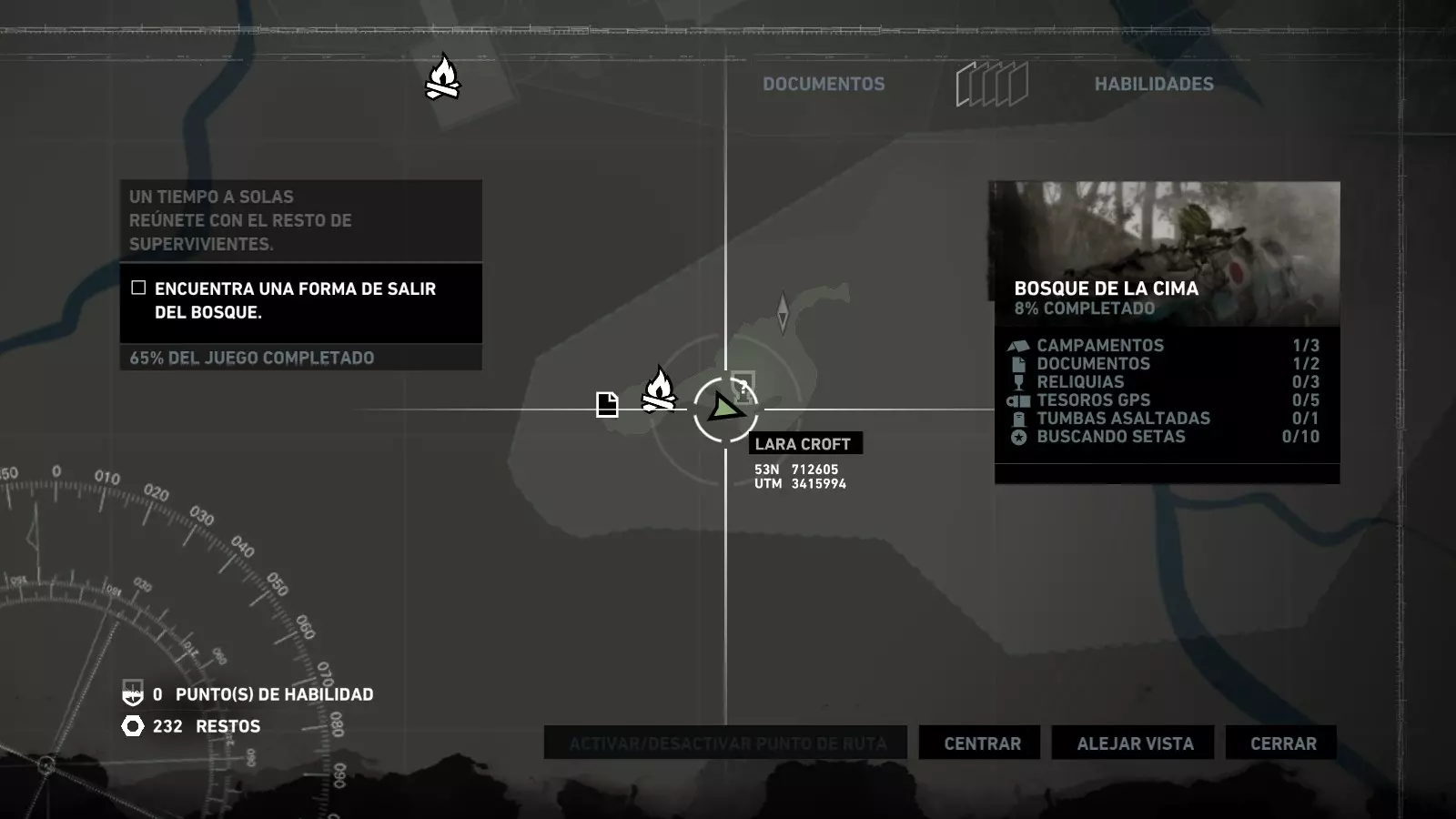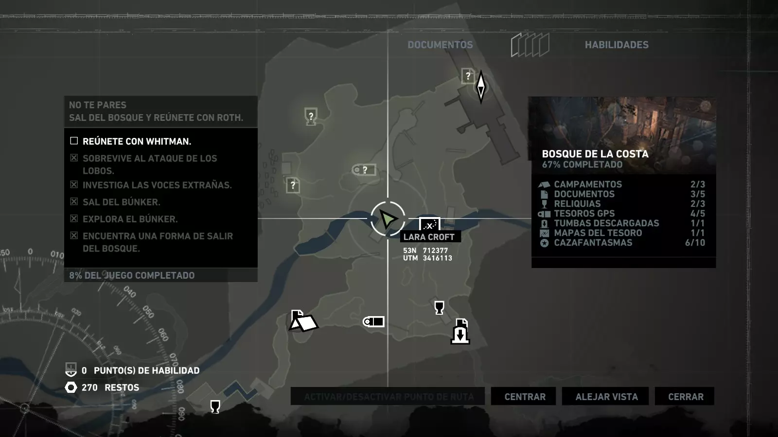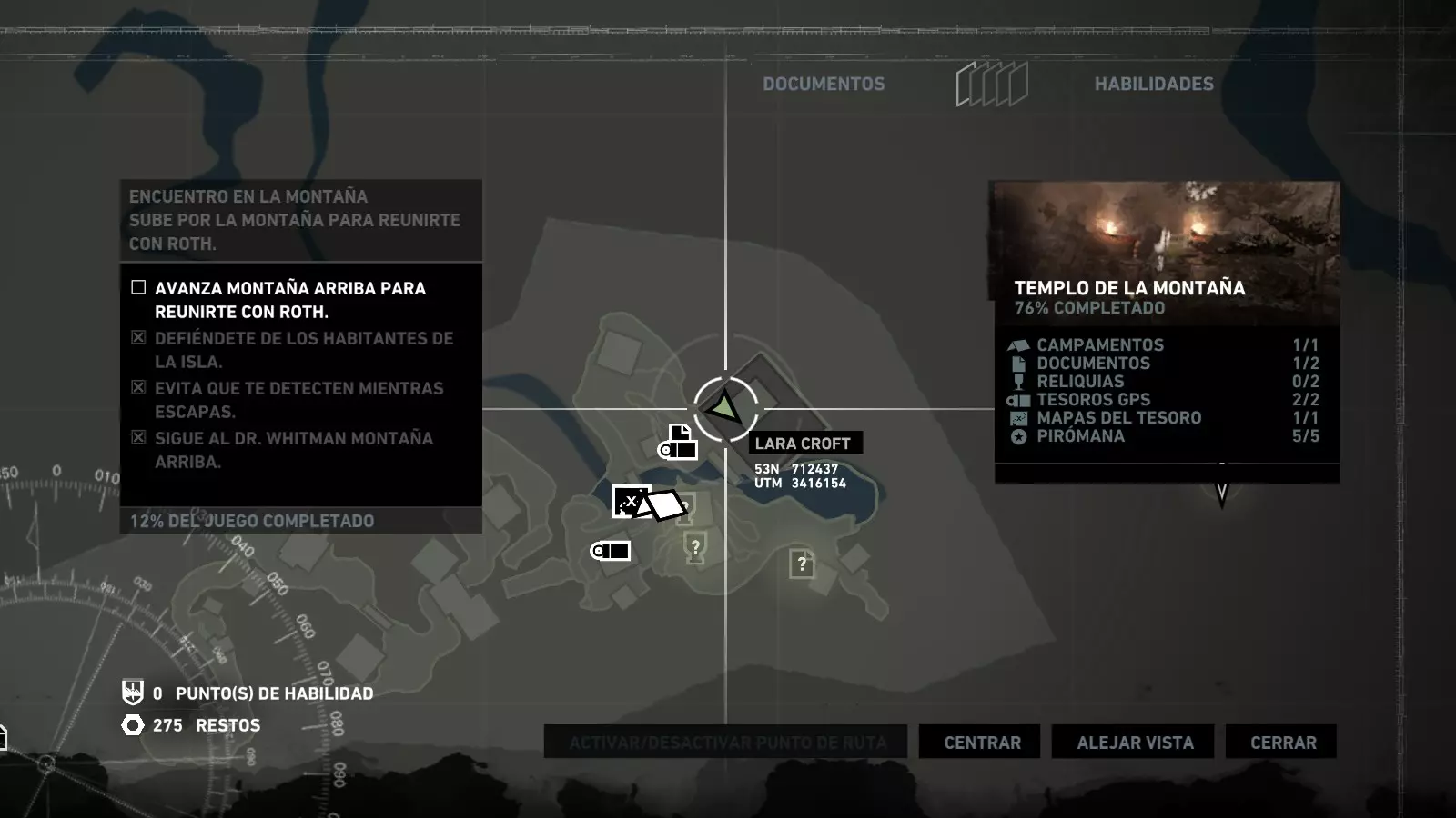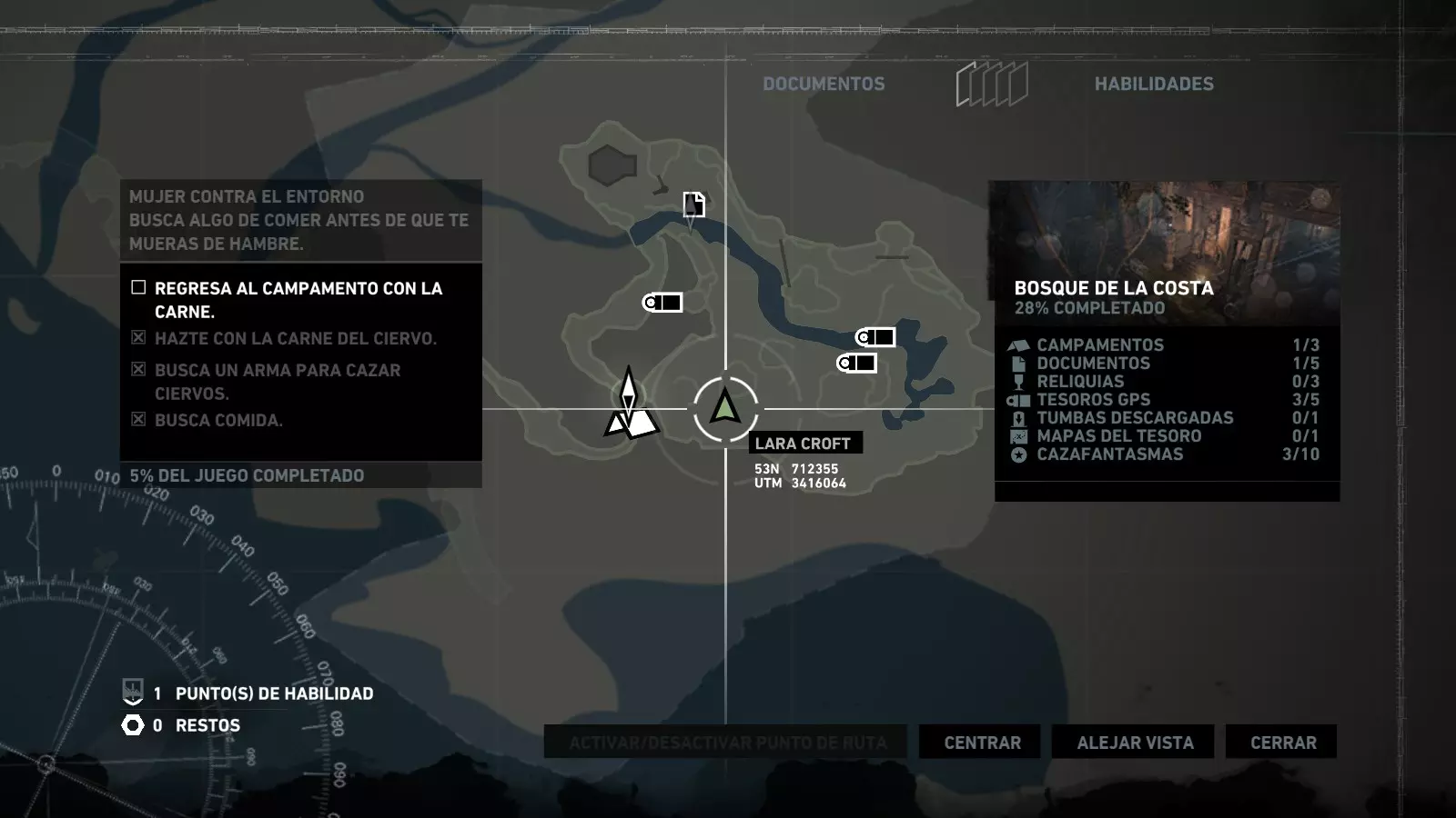 以下指南旨在帮助玩家轻松完成《古墓丽影》游戏中出现的各种挑战。每个挑战内容都配有地图图片以显示其位置,以及游戏内该位置的视角图,并附带文字说明如何到达该地点以及在游戏的哪个阶段进行。《古墓丽影》允许玩家随时返回之前的地点完成挑战,但本指南旨在让玩家在推进游戏进程的同时完成这些挑战。 简介 欢迎阅读我的《古墓丽影》挑战指南!本指南将指导你完成游戏中的各种挑战,帮助你找到或摧毁完成挑战所需的所有物品。 游戏中共有13个不同的挑战需要完成,包括收集蘑菇或鸡蛋、点燃雕像、摧毁海报或恐怖装饰品等。尽管游戏允许你在正常流程中未完成挑战时返回继续,但本指南旨在让你在游戏进程中直接达成100%完成度。因此,本指南将为岛屿的每个区域单独设立一个章节,说明需要完成的挑战以及它们的获取顺序;最后一个章节将按“时间顺序”整理各个元素,因为在某些情况下,由于我们没有必要的武器或工具,若不先经过其他区域,就无法完成某个区域的所有挑战。 每个元素将至少配有两张图片:其中一张是地图图片,根据劳拉·克劳馥的位置大致显示该元素所在的地点。在某些情况下,当挑战是收集或点燃附近的某个物品时,雷达的位置将指示离该物品最近的地方。在其他需要摧毁玩家位置远处物体的情况下,地图会通过绿色箭头显示劳拉的位置,而物体的位置则会用白色定位十字标记。 第二张图片会展示游戏中挑战所在位置的视角。需要说明的是,这两张图片是相关联的,也就是说,游戏内的视角与地图图片中显示的方向相对应。在某些情况下,如果相关物体难以看清,会有第三张图片,通过武器的缩放来更清晰地显示其位置。除了图片外,每个元素还会配有一段简短但清晰的说明,用于解释如何到达地图上指示的位置。 海岸森林 - 幽灵猎人 刚逃离食腐者巢穴,劳拉受伤又饥饿,她在森林中寻找避难所,同时继续追踪“坚忍号”同伴的踪迹。 在游戏的第一个区域,你的目标是找到并摧毁10个悬挂的图腾,这些图腾的中心有一个骷髅头。由于我们处于森林区域,且行动发生在暴风雨中或夜晚,有些图腾乍一看可能很难找到。 幽灵猎人1