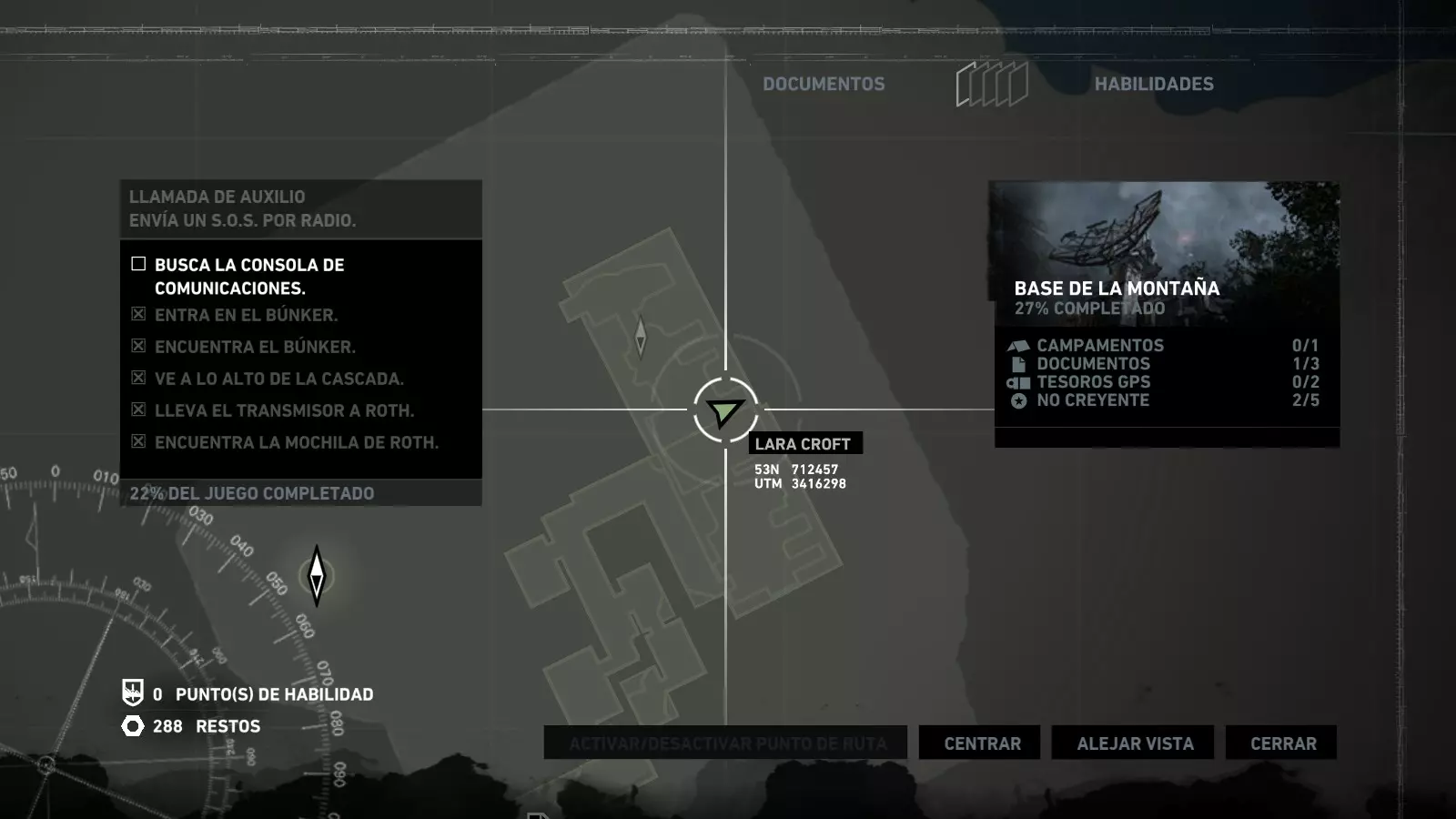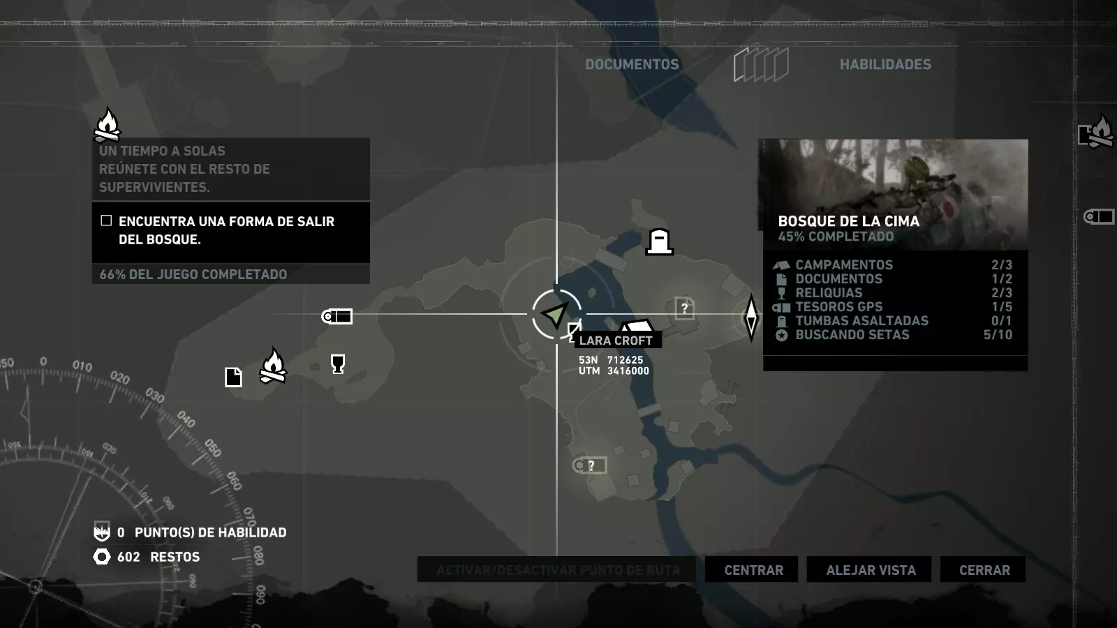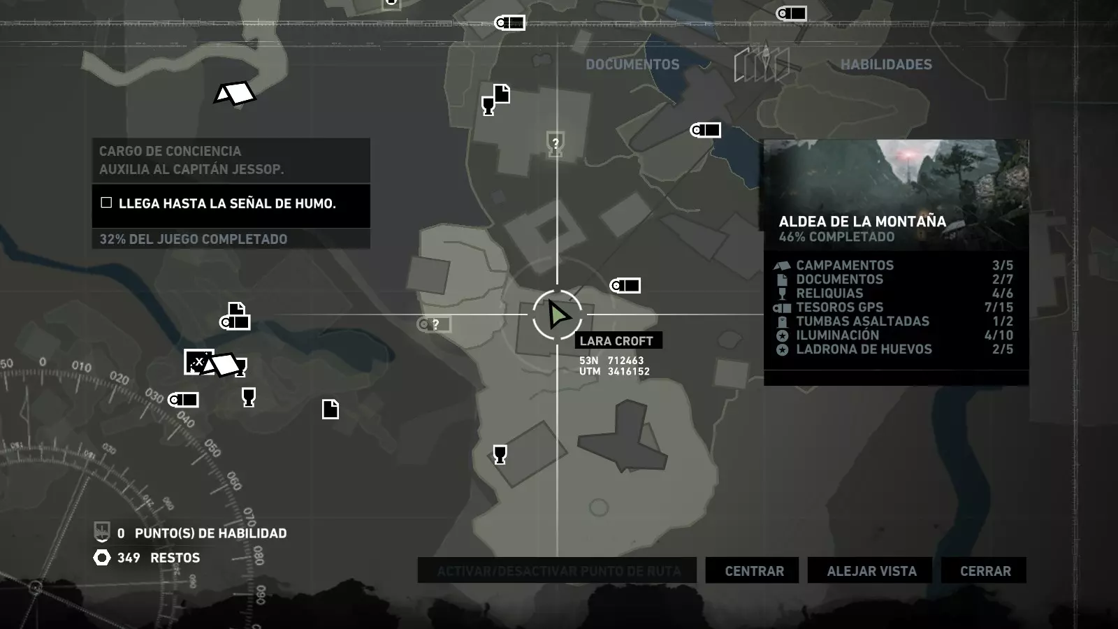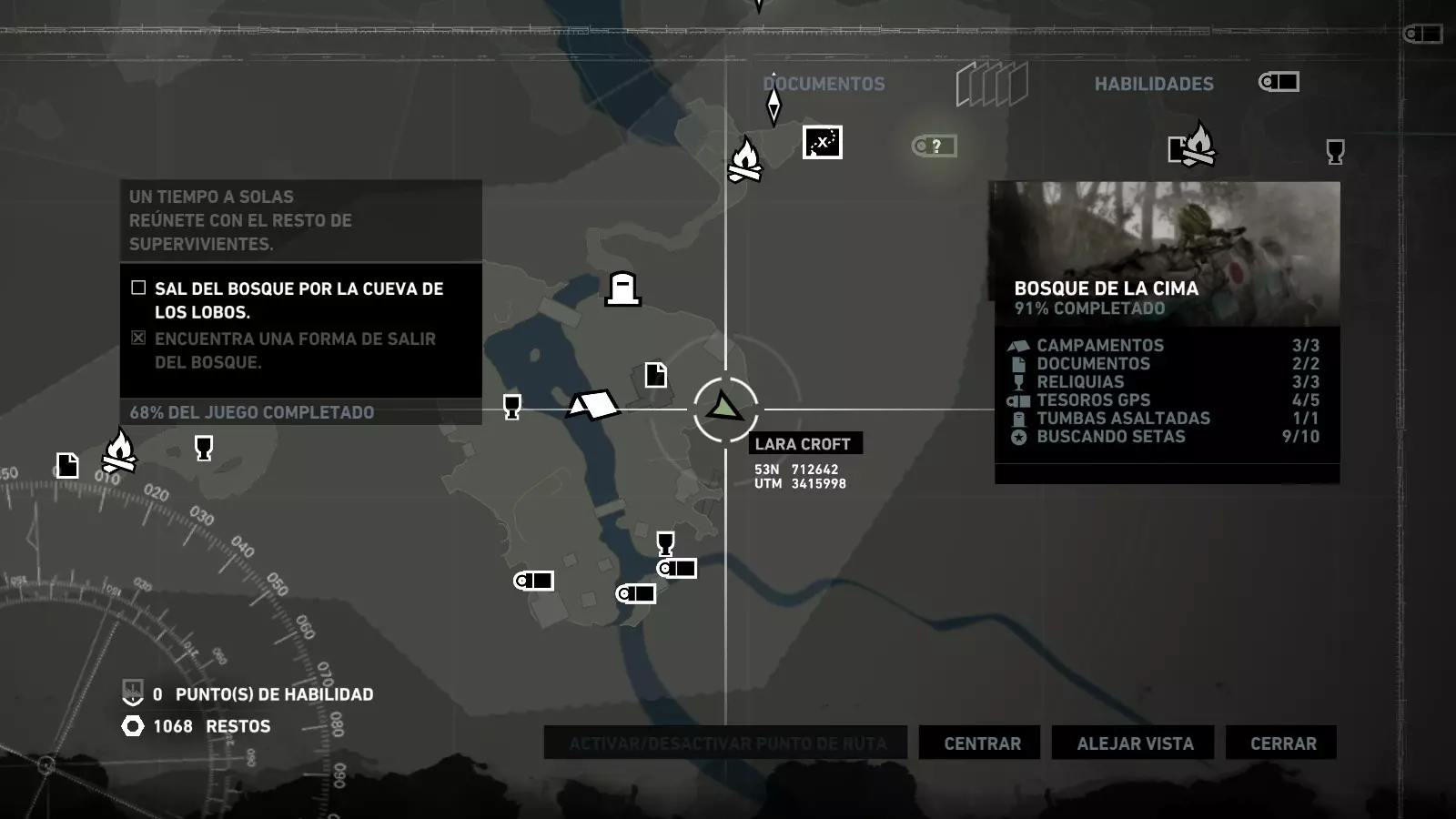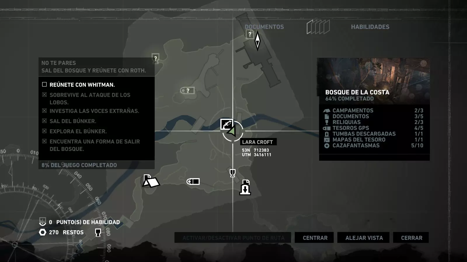 以下指南旨在帮助玩家轻松完成《古墓丽影》游戏中出现的各种挑战。每个挑战内容都配有地图图片以显示其位置,以及游戏内该位置的视角图,并附带文字说明如何到达该地点以及在游戏的哪个阶段进行。《古墓丽影》允许玩家随时返回之前的地点完成挑战,但本指南旨在让玩家在推进游戏进程的同时完成这些挑战。 简介 欢迎阅读我的《古墓丽影》挑战指南!本指南将指导你完成游戏中的各种挑战,帮助你找到或摧毁完成挑战所需的所有物品。 游戏中共有13个不同的挑战需要完成,包括收集蘑菇或鸡蛋、点燃雕像、摧毁海报或恐怖装饰品等。尽管游戏允许你在正常流程中未完成挑战时返回继续,但本指南旨在让你在游戏进程中直接达成100%完成度。因此,本指南将为岛屿的每个区域单独设立一个章节,说明需要完成的挑战以及它们的获取顺序;最后一个章节将按“时间顺序”整理各个元素,因为在某些情况下,由于我们没有必要的武器或工具,若不先经过其他区域,就无法完成某个区域的所有挑战。 每个元素将至少配有两张图片:其中一张是地图图片,根据劳拉·克劳馥的位置大致显示该元素所在的地点。在某些情况下,当挑战是收集或点燃附近的某个物品时,雷达的位置将指示离该物品最近的地方。在其他需要摧毁玩家位置远处物体的情况下,地图会通过绿色箭头显示劳拉的位置,而物体的位置则会用白色定位十字标记。 第二张图片会展示游戏中挑战所在位置的视角。需要说明的是,这两张图片是相关联的,也就是说,游戏内的视角与地图图片中显示的方向相对应。在某些情况下,如果相关物体难以看清,会有第三张图片,通过武器的缩放来更清晰地显示其位置。除了图片外,每个元素还会配有一段简短但清晰的说明,用于解释如何到达地图上指示的位置。 海岸森林 - 幽灵猎人 刚逃离食腐者巢穴,劳拉受伤又饥饿,她在森林中寻找避难所,同时继续追踪“坚忍号”同伴的踪迹。 在游戏的第一个区域,你的目标是找到并摧毁10个悬挂的图腾,这些图腾的中心有一个骷髅头。由于我们处于森林区域,且行动发生在暴风雨中或夜晚,有些图腾乍一看可能很难找到。 幽灵猎人1