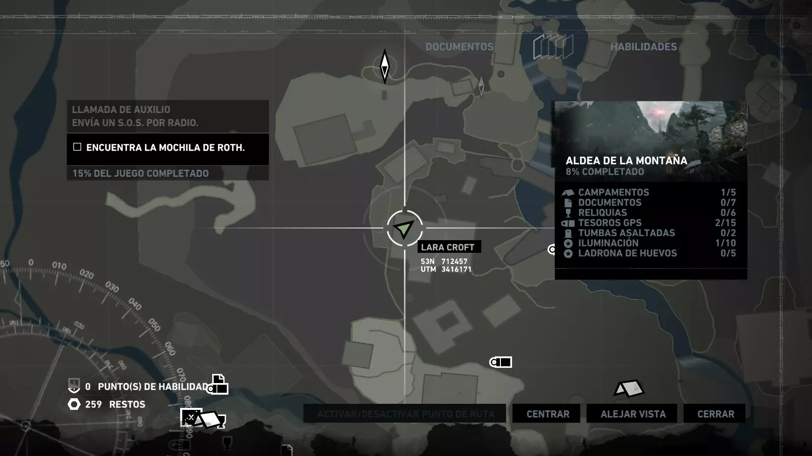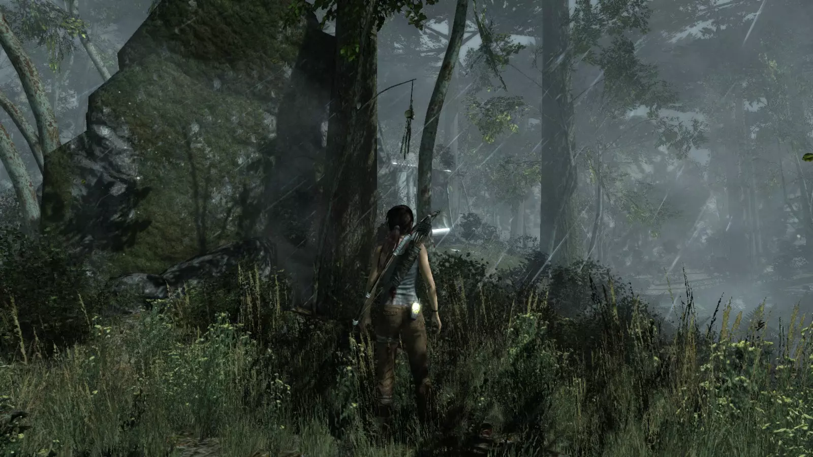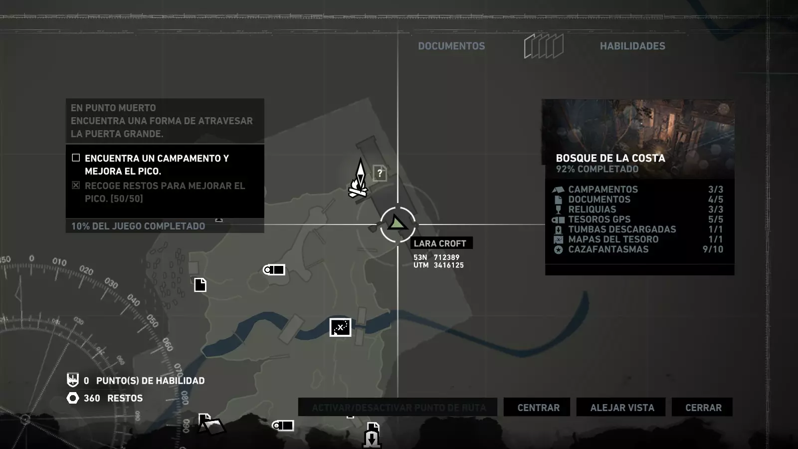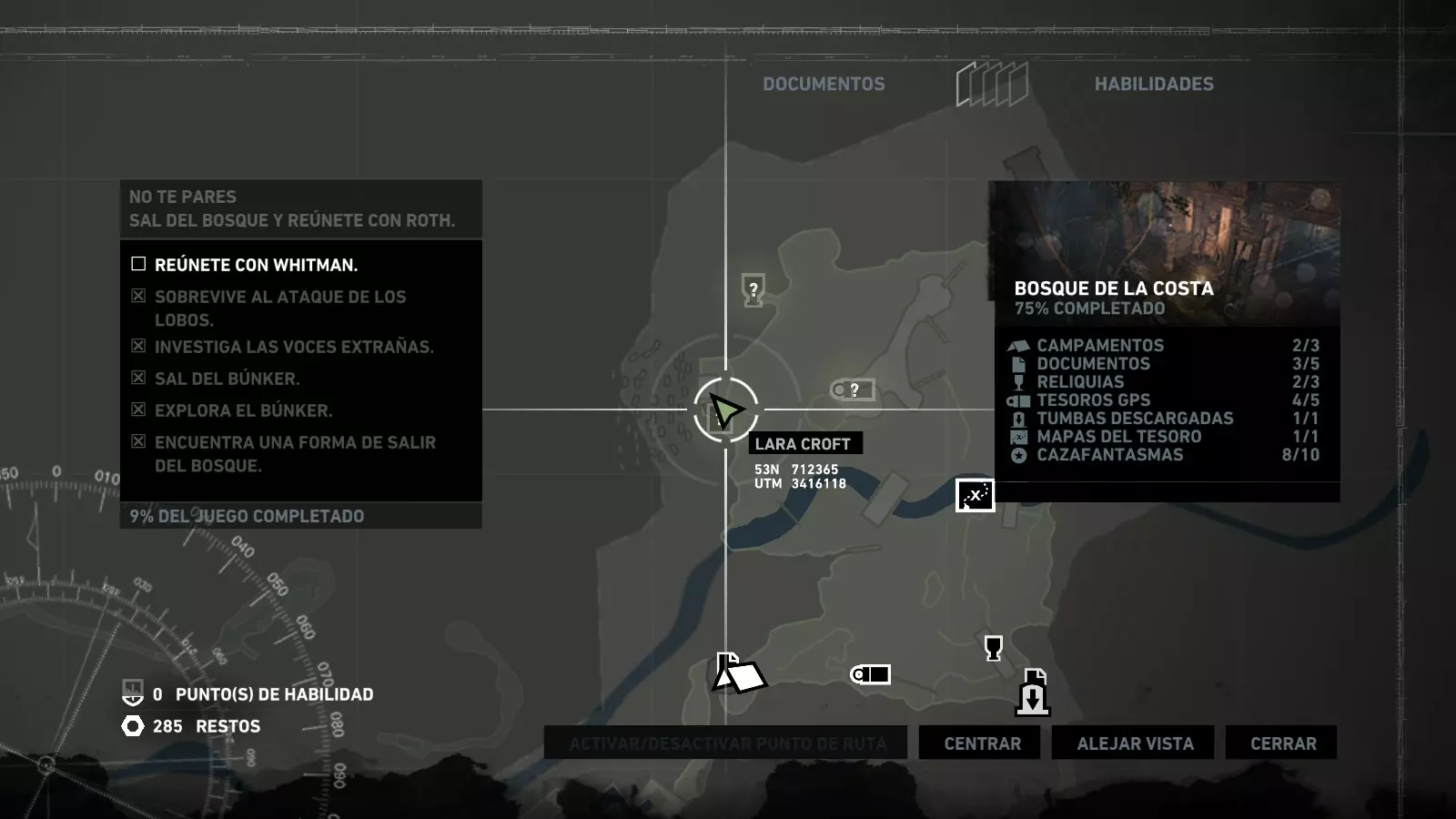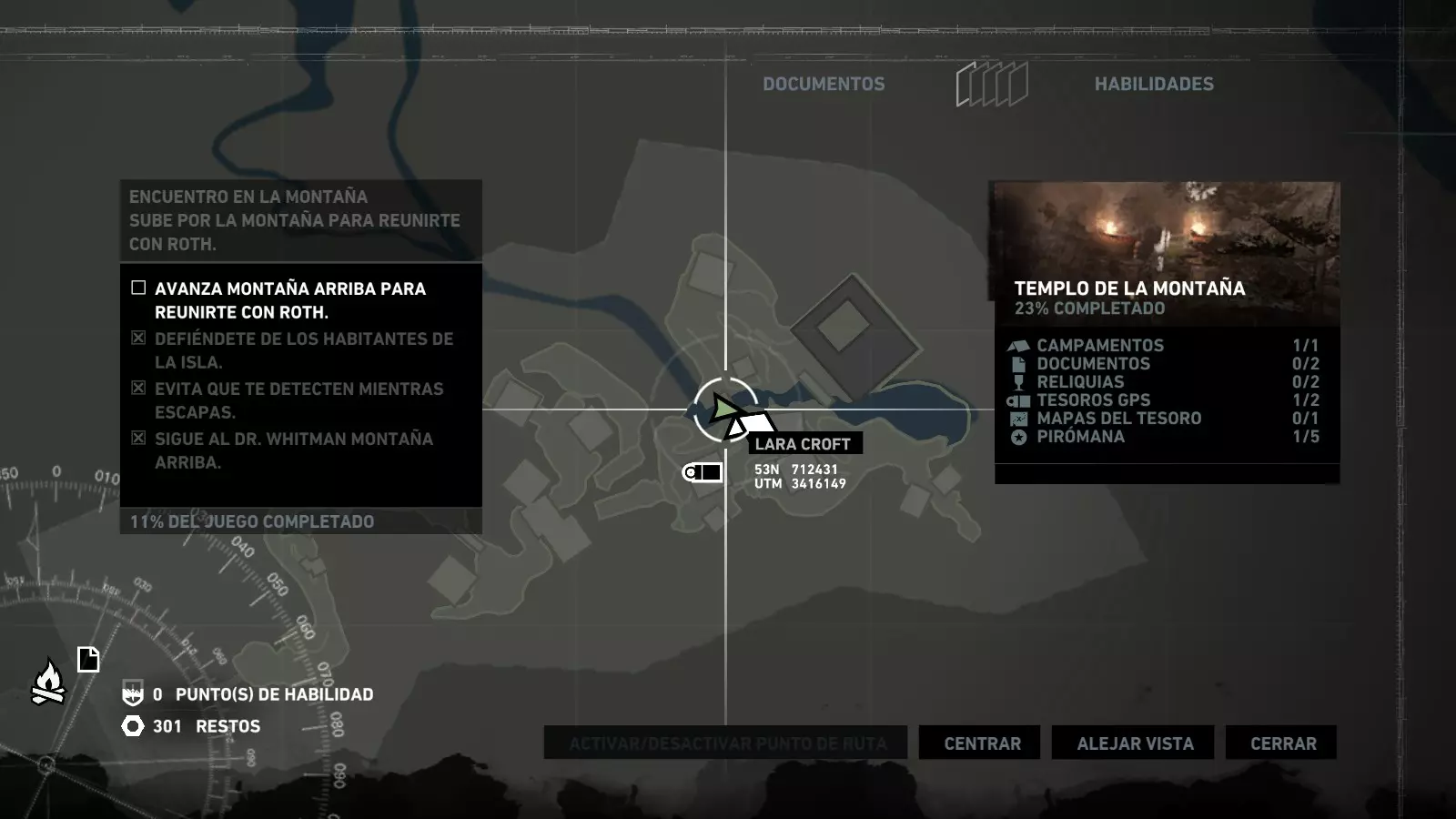 以下指南旨在帮助玩家轻松完成《古墓丽影》游戏中出现的各种挑战。每个挑战内容都配有地图图片以显示其位置,以及游戏内该位置的视角图,并附带文字说明如何到达该地点以及在游戏的哪个阶段进行。《古墓丽影》允许玩家随时返回之前的地点完成挑战,但本指南旨在让玩家在推进游戏进程的同时完成这些挑战。 简介 欢迎阅读我的《古墓丽影》挑战指南!本指南将指导你完成游戏中的各种挑战,帮助你找到或摧毁完成挑战所需的所有物品。 游戏中共有13个不同的挑战需要完成,包括收集蘑菇或鸡蛋、点燃雕像、摧毁海报或恐怖装饰品等。尽管游戏允许你在正常流程中未完成挑战时返回继续,但本指南旨在让你在游戏进程中直接达成100%完成度。因此,本指南将为岛屿的每个区域单独设立一个章节,说明需要完成的挑战以及它们的获取顺序;最后一个章节将按“时间顺序”整理各个元素,因为在某些情况下,由于我们没有必要的武器或工具,若不先经过其他区域,就无法完成某个区域的所有挑战。 每个元素将至少配有两张图片:其中一张是地图图片,根据劳拉·克劳馥的位置大致显示该元素所在的地点。在某些情况下,当挑战是收集或点燃附近的某个物品时,雷达的位置将指示离该物品最近的地方。在其他需要摧毁玩家位置远处物体的情况下,地图会通过绿色箭头显示劳拉的位置,而物体的位置则会用白色定位十字标记。 第二张图片会展示游戏中挑战所在位置的视角。需要说明的是,这两张图片是相关联的,也就是说,游戏内的视角与地图图片中显示的方向相对应。在某些情况下,如果相关物体难以看清,会有第三张图片,通过武器的缩放来更清晰地显示其位置。除了图片外,每个元素还会配有一段简短但清晰的说明,用于解释如何到达地图上指示的位置。 海岸森林 - 幽灵猎人 刚逃离食腐者巢穴,劳拉受伤又饥饿,她在森林中寻找避难所,同时继续追踪“坚忍号”同伴的踪迹。 在游戏的第一个区域,你的目标是找到并摧毁10个悬挂的图腾,这些图腾的中心有一个骷髅头。由于我们处于森林区域,且行动发生在暴风雨中或夜晚,有些图腾乍一看可能很难找到。 幽灵猎人1