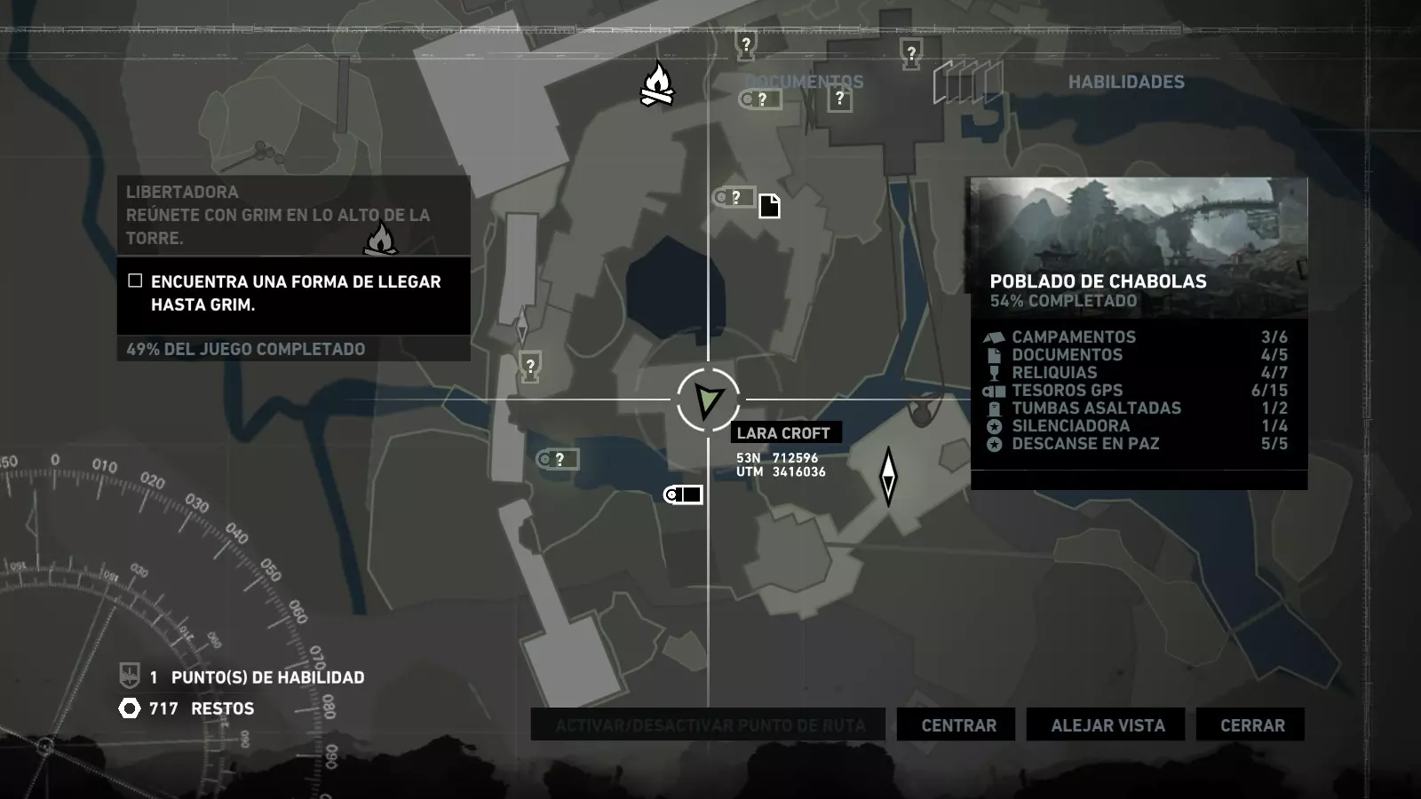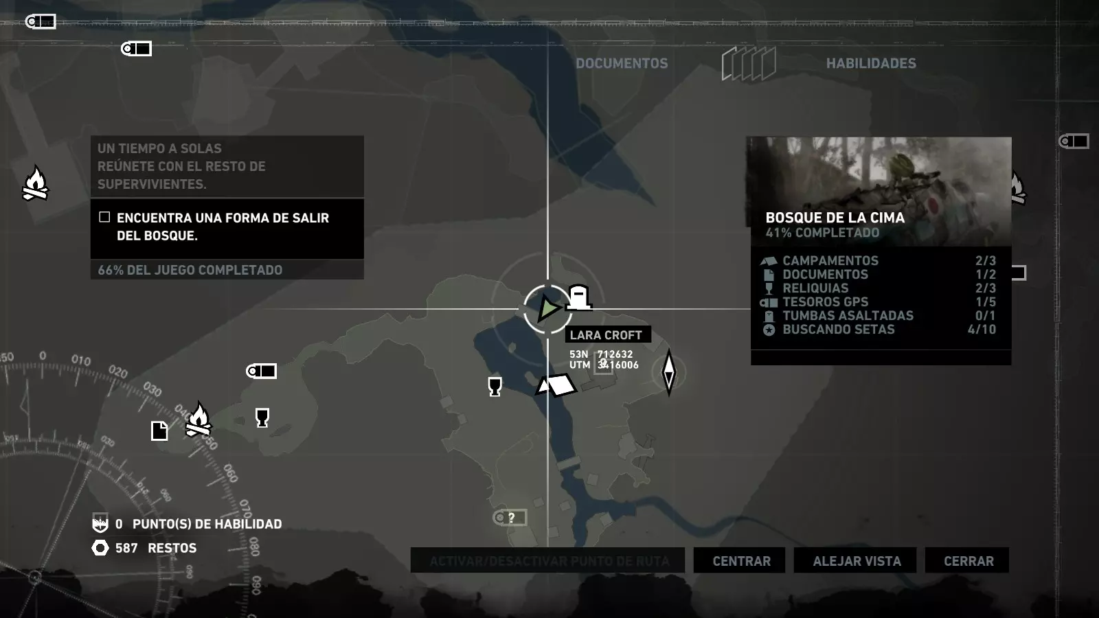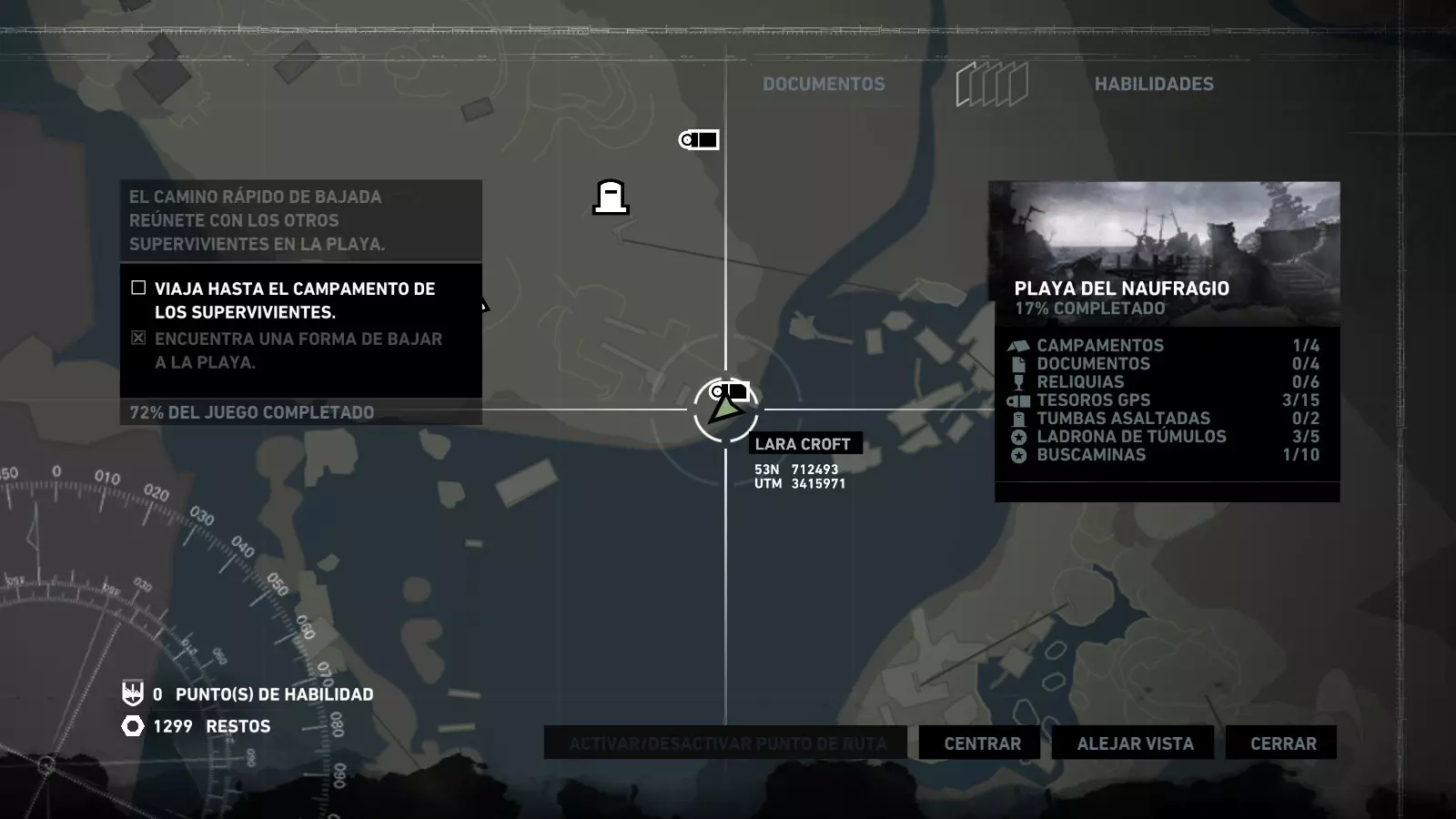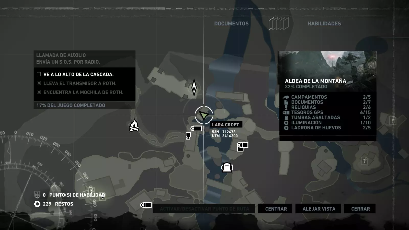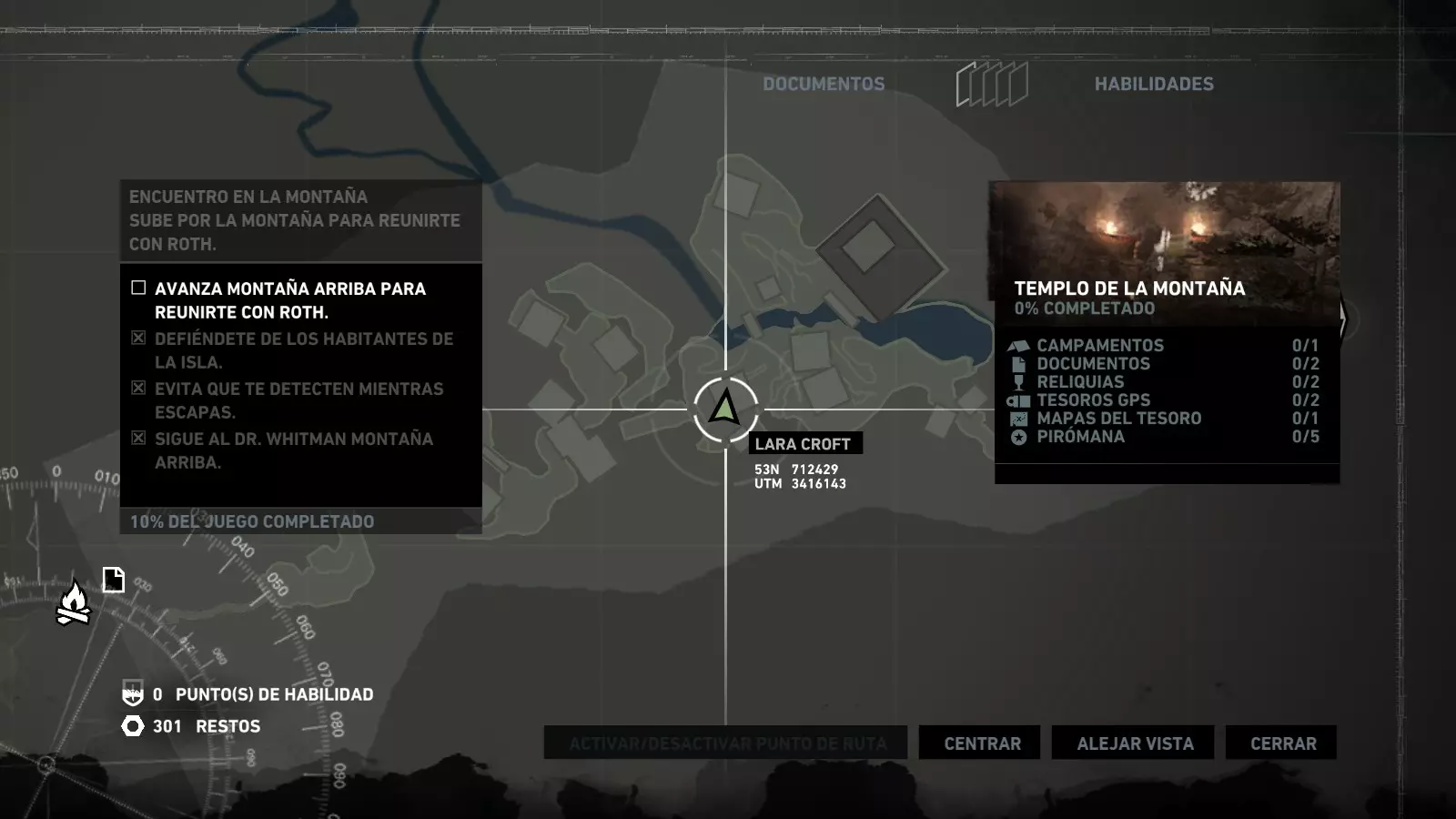 以下指南旨在帮助玩家轻松完成《古墓丽影》游戏中出现的各种挑战。每个挑战内容都配有地图图片以显示其位置,以及游戏内该位置的视角图,并附带文字说明如何到达该地点以及在游戏的哪个阶段进行。《古墓丽影》允许玩家随时返回之前的地点完成挑战,但本指南旨在让玩家在推进游戏进程的同时完成这些挑战。 简介 欢迎阅读我的《古墓丽影》挑战指南!本指南将指导你完成游戏中的各种挑战,帮助你找到或摧毁完成挑战所需的所有物品。 游戏中共有13个不同的挑战需要完成,包括收集蘑菇或鸡蛋、点燃雕像、摧毁海报或恐怖装饰品等。尽管游戏允许你在正常流程中未完成挑战时返回继续,但本指南旨在让你在游戏进程中直接达成100%完成度。因此,本指南将为岛屿的每个区域单独设立一个章节,说明需要完成的挑战以及它们的获取顺序;最后一个章节将按“时间顺序”整理各个元素,因为在某些情况下,由于我们没有必要的武器或工具,若不先经过其他区域,就无法完成某个区域的所有挑战。 每个元素将至少配有两张图片:其中一张是地图图片,根据劳拉·克劳馥的位置大致显示该元素所在的地点。在某些情况下,当挑战是收集或点燃附近的某个物品时,雷达的位置将指示离该物品最近的地方。在其他需要摧毁玩家位置远处物体的情况下,地图会通过绿色箭头显示劳拉的位置,而物体的位置则会用白色定位十字标记。 第二张图片会展示游戏中挑战所在位置的视角。需要说明的是,这两张图片是相关联的,也就是说,游戏内的视角与地图图片中显示的方向相对应。在某些情况下,如果相关物体难以看清,会有第三张图片,通过武器的缩放来更清晰地显示其位置。除了图片外,每个元素还会配有一段简短但清晰的说明,用于解释如何到达地图上指示的位置。 海岸森林 - 幽灵猎人 刚逃离食腐者巢穴,劳拉受伤又饥饿,她在森林中寻找避难所,同时继续追踪“坚忍号”同伴的踪迹。 在游戏的第一个区域,你的目标是找到并摧毁10个悬挂的图腾,这些图腾的中心有一个骷髅头。由于我们处于森林区域,且行动发生在暴风雨中或夜晚,有些图腾乍一看可能很难找到。 幽灵猎人1