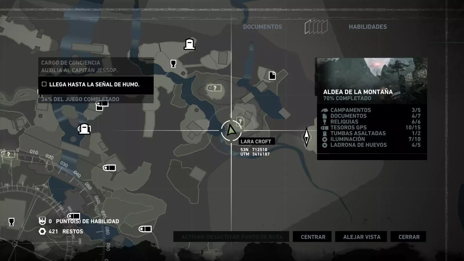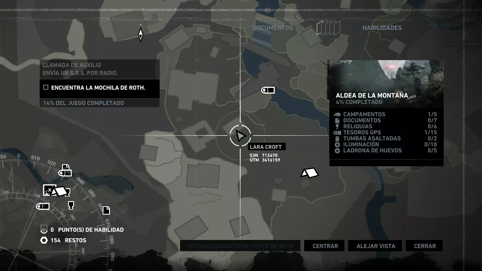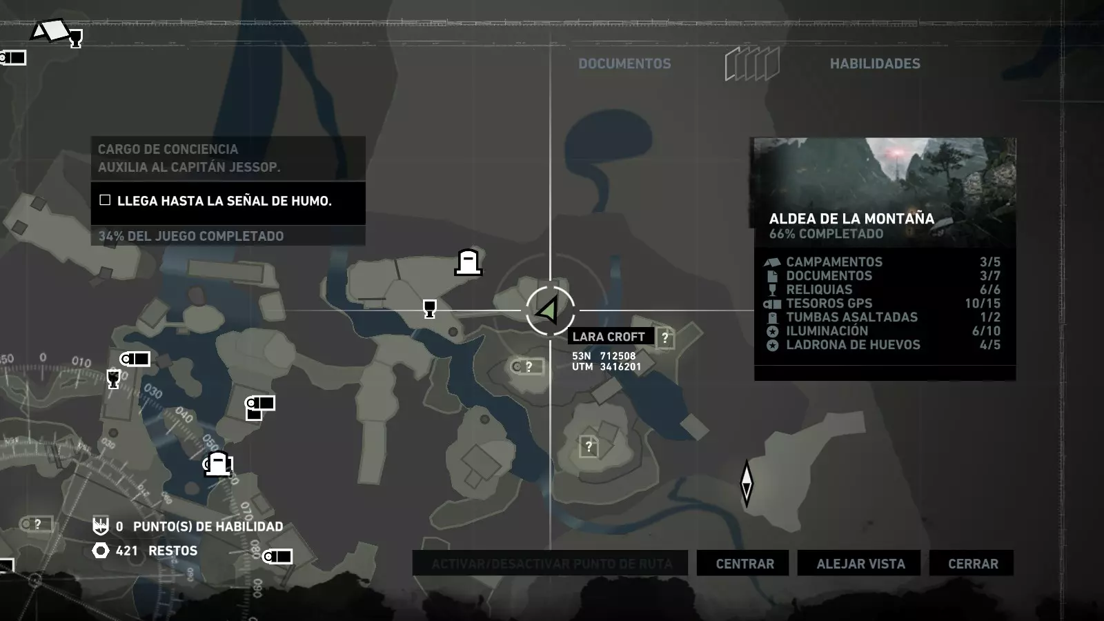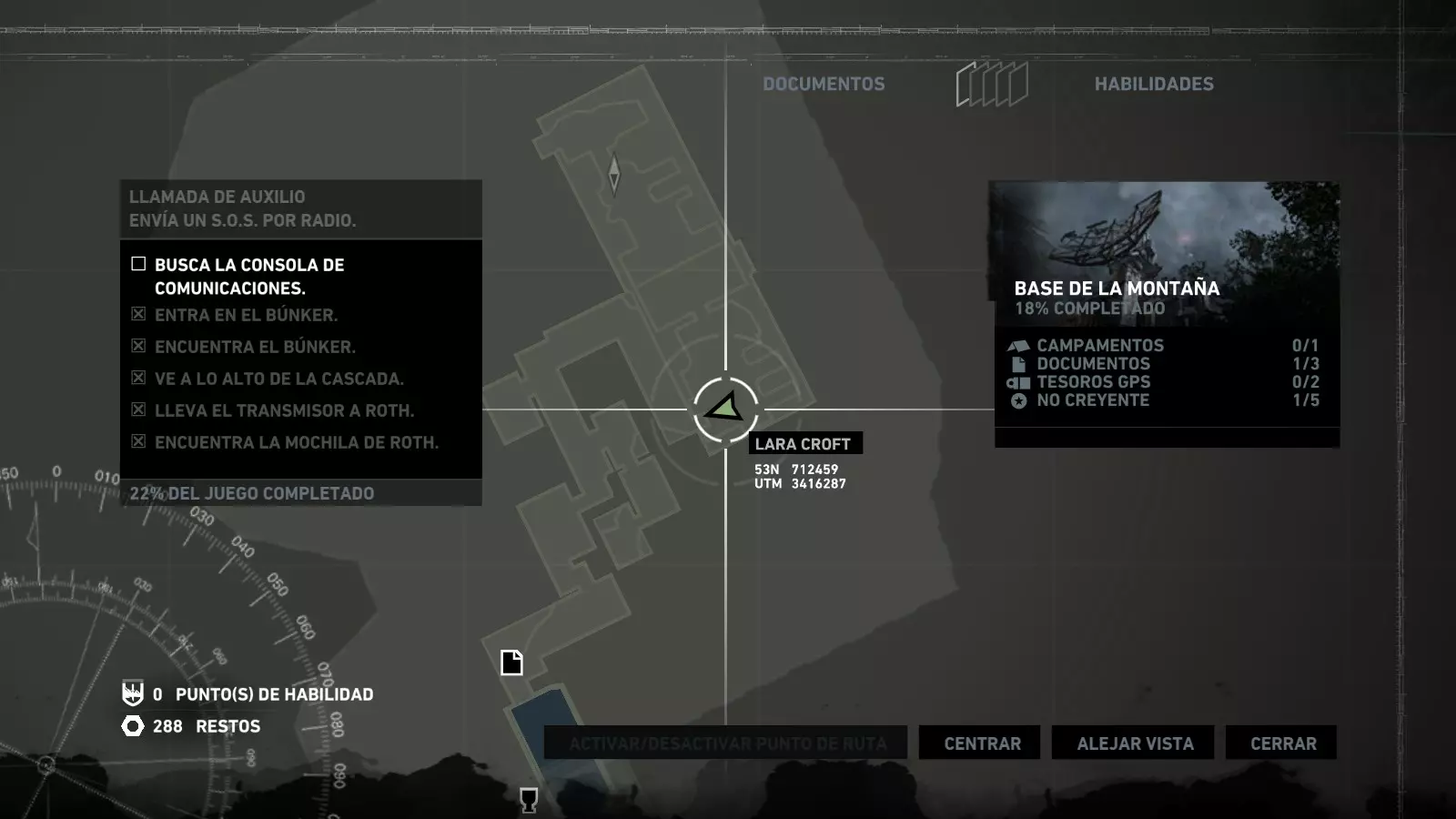 以下指南旨在帮助玩家轻松完成《古墓丽影》游戏中出现的各种挑战。每个挑战内容都配有地图图片以显示其位置,以及游戏内该位置的视角图,并附带文字说明如何到达该地点以及在游戏的哪个阶段进行。《古墓丽影》允许玩家随时返回之前的地点完成挑战,但本指南旨在让玩家在推进游戏进程的同时完成这些挑战。 简介 欢迎阅读我的《古墓丽影》挑战指南!本指南将指导你完成游戏中的各种挑战,帮助你找到或摧毁完成挑战所需的所有物品。 游戏中共有13个不同的挑战需要完成,包括收集蘑菇或鸡蛋、点燃雕像、摧毁海报或恐怖装饰品等。尽管游戏允许你在正常流程中未完成挑战时返回继续,但本指南旨在让你在游戏进程中直接达成100%完成度。因此,本指南将为岛屿的每个区域单独设立一个章节,说明需要完成的挑战以及它们的获取顺序;最后一个章节将按“时间顺序”整理各个元素,因为在某些情况下,由于我们没有必要的武器或工具,若不先经过其他区域,就无法完成某个区域的所有挑战。 每个元素将至少配有两张图片:其中一张是地图图片,根据劳拉·克劳馥的位置大致显示该元素所在的地点。在某些情况下,当挑战是收集或点燃附近的某个物品时,雷达的位置将指示离该物品最近的地方。在其他需要摧毁玩家位置远处物体的情况下,地图会通过绿色箭头显示劳拉的位置,而物体的位置则会用白色定位十字标记。 第二张图片会展示游戏中挑战所在位置的视角。需要说明的是,这两张图片是相关联的,也就是说,游戏内的视角与地图图片中显示的方向相对应。在某些情况下,如果相关物体难以看清,会有第三张图片,通过武器的缩放来更清晰地显示其位置。除了图片外,每个元素还会配有一段简短但清晰的说明,用于解释如何到达地图上指示的位置。 海岸森林 - 幽灵猎人 刚逃离食腐者巢穴,劳拉受伤又饥饿,她在森林中寻找避难所,同时继续追踪“坚忍号”同伴的踪迹。 在游戏的第一个区域,你的目标是找到并摧毁10个悬挂的图腾,这些图腾的中心有一个骷髅头。由于我们处于森林区域,且行动发生在暴风雨中或夜晚,有些图腾乍一看可能很难找到。 幽灵猎人1