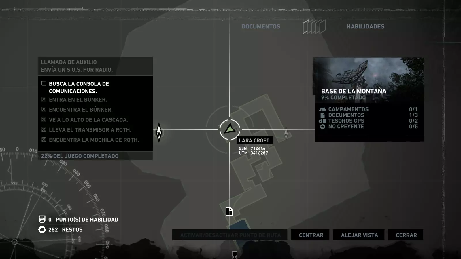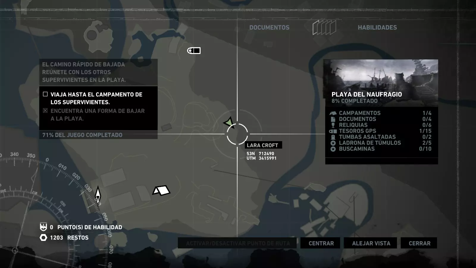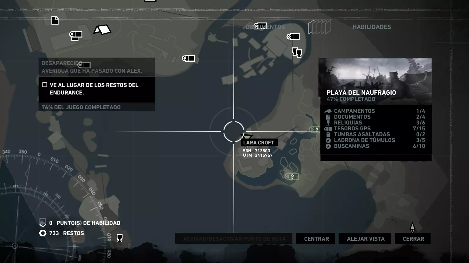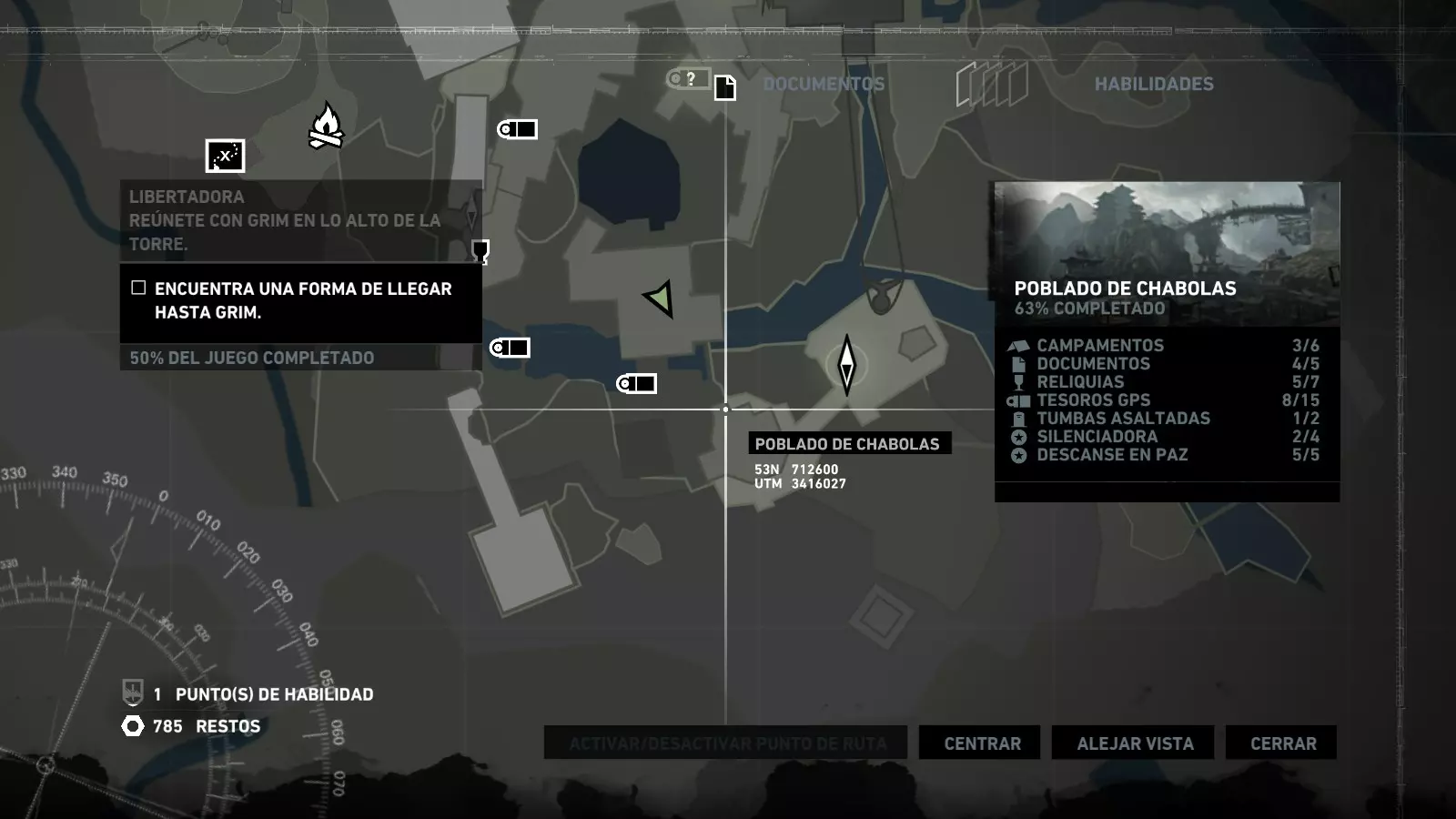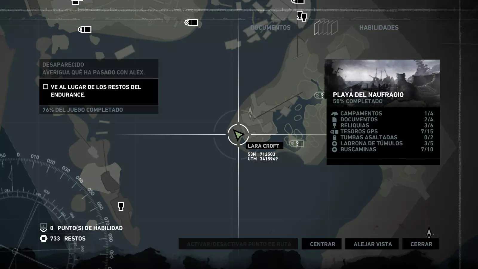 以下指南旨在帮助玩家轻松完成《古墓丽影》游戏中出现的各种挑战。每个挑战内容都配有地图图片以显示其位置,以及游戏内该位置的视角图,并附带文字说明如何到达该地点以及在游戏的哪个阶段进行。《古墓丽影》允许玩家随时返回之前的地点完成挑战,但本指南旨在让玩家在推进游戏进程的同时完成这些挑战。 简介 欢迎阅读我的《古墓丽影》挑战指南!本指南将指导你完成游戏中的各种挑战,帮助你找到或摧毁完成挑战所需的所有物品。 游戏中共有13个不同的挑战需要完成,包括收集蘑菇或鸡蛋、点燃雕像、摧毁海报或恐怖装饰品等。尽管游戏允许你在正常流程中未完成挑战时返回继续,但本指南旨在让你在游戏进程中直接达成100%完成度。因此,本指南将为岛屿的每个区域单独设立一个章节,说明需要完成的挑战以及它们的获取顺序;最后一个章节将按“时间顺序”整理各个元素,因为在某些情况下,由于我们没有必要的武器或工具,若不先经过其他区域,就无法完成某个区域的所有挑战。 每个元素将至少配有两张图片:其中一张是地图图片,根据劳拉·克劳馥的位置大致显示该元素所在的地点。在某些情况下,当挑战是收集或点燃附近的某个物品时,雷达的位置将指示离该物品最近的地方。在其他需要摧毁玩家位置远处物体的情况下,地图会通过绿色箭头显示劳拉的位置,而物体的位置则会用白色定位十字标记。 第二张图片会展示游戏中挑战所在位置的视角。需要说明的是,这两张图片是相关联的,也就是说,游戏内的视角与地图图片中显示的方向相对应。在某些情况下,如果相关物体难以看清,会有第三张图片,通过武器的缩放来更清晰地显示其位置。除了图片外,每个元素还会配有一段简短但清晰的说明,用于解释如何到达地图上指示的位置。 海岸森林 - 幽灵猎人 刚逃离食腐者巢穴,劳拉受伤又饥饿,她在森林中寻找避难所,同时继续追踪“坚忍号”同伴的踪迹。 在游戏的第一个区域,你的目标是找到并摧毁10个悬挂的图腾,这些图腾的中心有一个骷髅头。由于我们处于森林区域,且行动发生在暴风雨中或夜晚,有些图腾乍一看可能很难找到。 幽灵猎人1