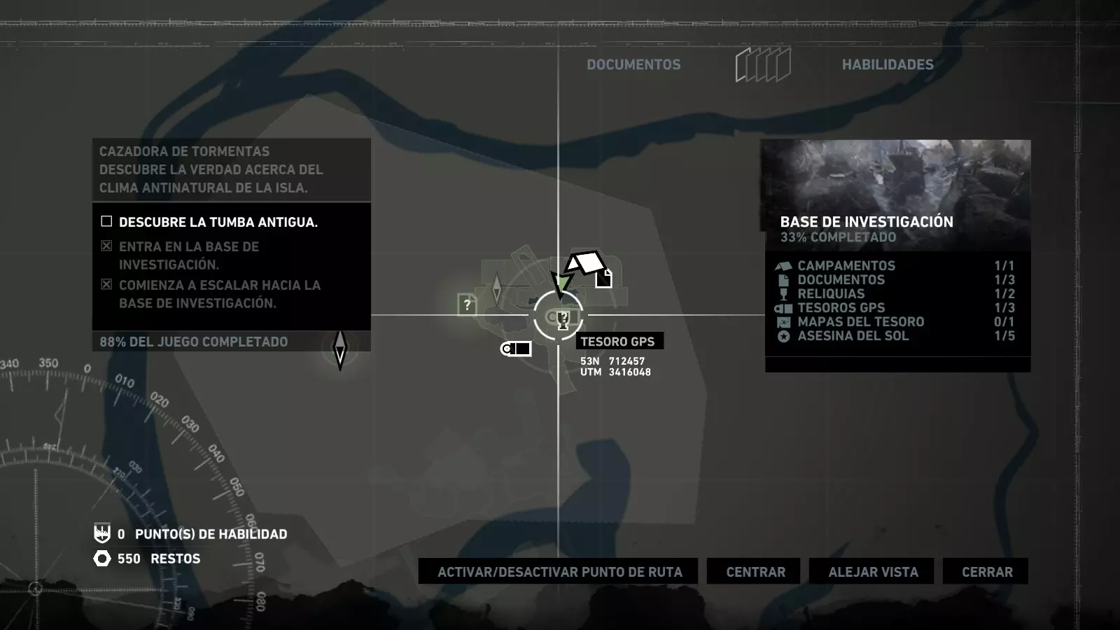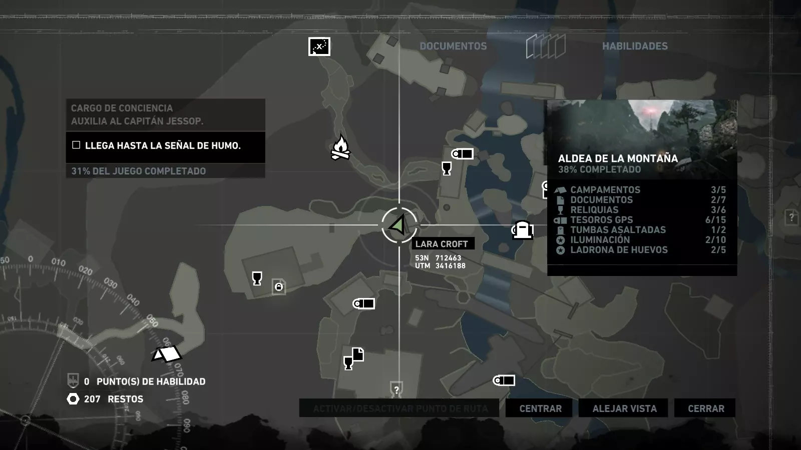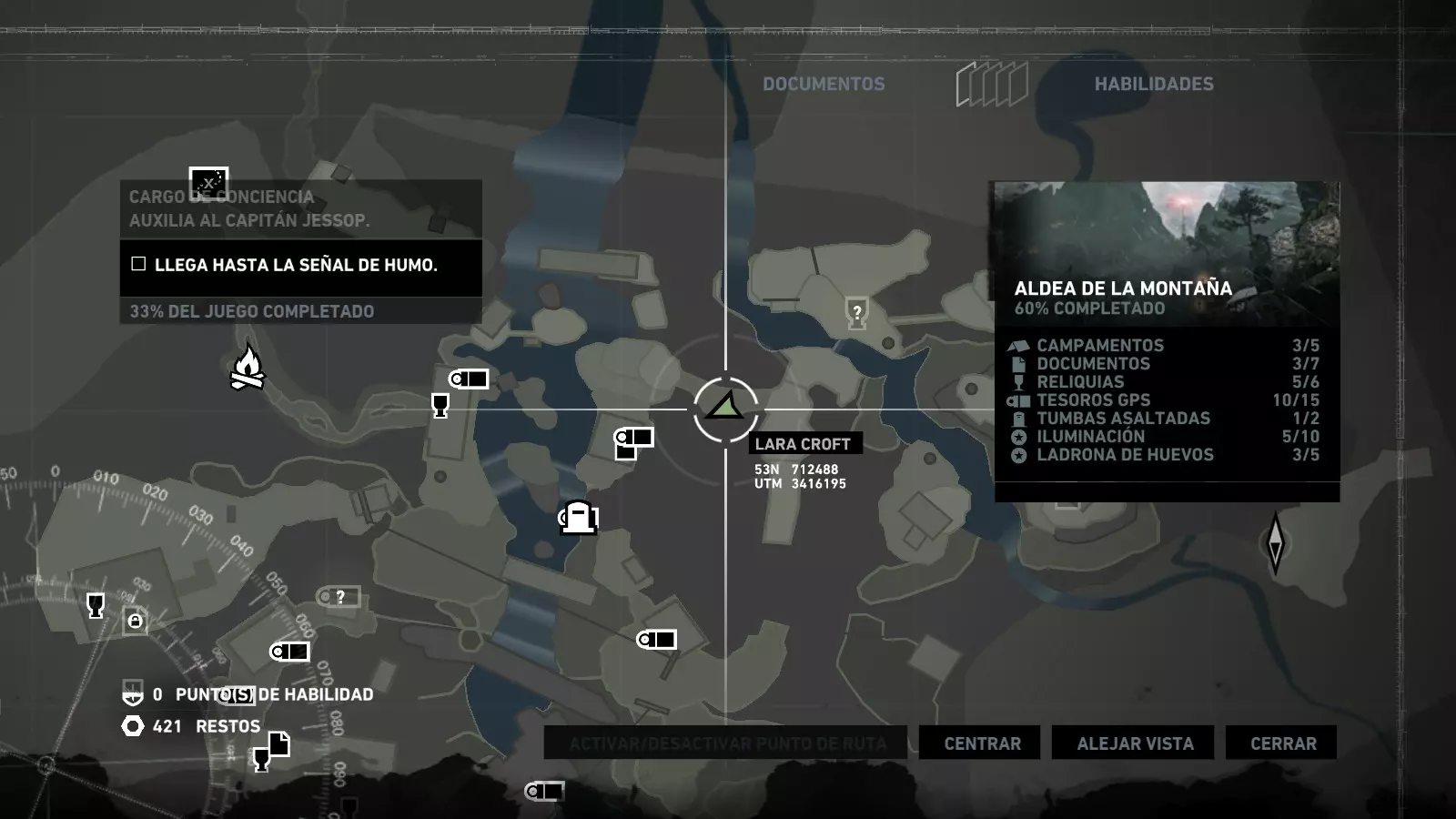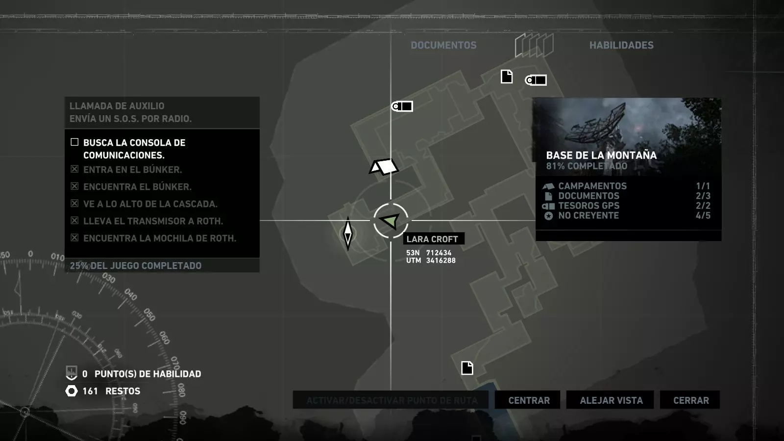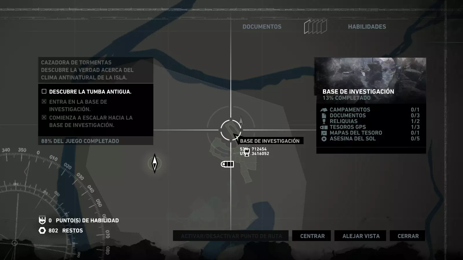 以下指南旨在帮助玩家轻松完成《古墓丽影》游戏中出现的各种挑战。每个挑战内容都配有地图图片以显示其位置,以及游戏内该位置的视角图,并附带文字说明如何到达该地点以及在游戏的哪个阶段进行。《古墓丽影》允许玩家随时返回之前的地点完成挑战,但本指南旨在让玩家在推进游戏进程的同时完成这些挑战。 简介 欢迎阅读我的《古墓丽影》挑战指南!本指南将指导你完成游戏中的各种挑战,帮助你找到或摧毁完成挑战所需的所有物品。 游戏中共有13个不同的挑战需要完成,包括收集蘑菇或鸡蛋、点燃雕像、摧毁海报或恐怖装饰品等。尽管游戏允许你在正常流程中未完成挑战时返回继续,但本指南旨在让你在游戏进程中直接达成100%完成度。因此,本指南将为岛屿的每个区域单独设立一个章节,说明需要完成的挑战以及它们的获取顺序;最后一个章节将按“时间顺序”整理各个元素,因为在某些情况下,由于我们没有必要的武器或工具,若不先经过其他区域,就无法完成某个区域的所有挑战。 每个元素将至少配有两张图片:其中一张是地图图片,根据劳拉·克劳馥的位置大致显示该元素所在的地点。在某些情况下,当挑战是收集或点燃附近的某个物品时,雷达的位置将指示离该物品最近的地方。在其他需要摧毁玩家位置远处物体的情况下,地图会通过绿色箭头显示劳拉的位置,而物体的位置则会用白色定位十字标记。 第二张图片会展示游戏中挑战所在位置的视角。需要说明的是,这两张图片是相关联的,也就是说,游戏内的视角与地图图片中显示的方向相对应。在某些情况下,如果相关物体难以看清,会有第三张图片,通过武器的缩放来更清晰地显示其位置。除了图片外,每个元素还会配有一段简短但清晰的说明,用于解释如何到达地图上指示的位置。 海岸森林 - 幽灵猎人 刚逃离食腐者巢穴,劳拉受伤又饥饿,她在森林中寻找避难所,同时继续追踪“坚忍号”同伴的踪迹。 在游戏的第一个区域,你的目标是找到并摧毁10个悬挂的图腾,这些图腾的中心有一个骷髅头。由于我们处于森林区域,且行动发生在暴风雨中或夜晚,有些图腾乍一看可能很难找到。 幽灵猎人1