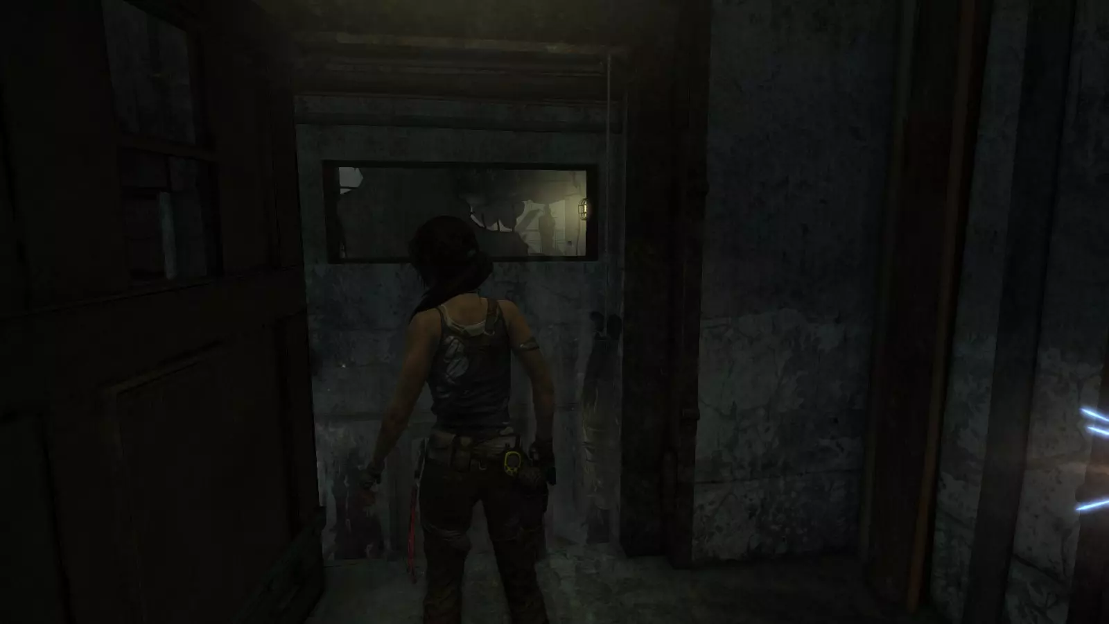 在“实验室”营地区域附近有两扇门,一扇开着,另一扇被堵住了。被堵住的门后面是一条半淹水的走廊,里面有两名太阳神殿守卫。解决他们之后,用冰镐撬开这扇紧闭的门。从这个位置你可以看到一个狭长的小窗户,通过它瞄准就能摧毁第二个图腾。