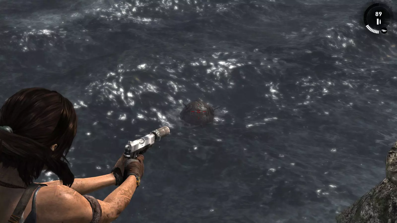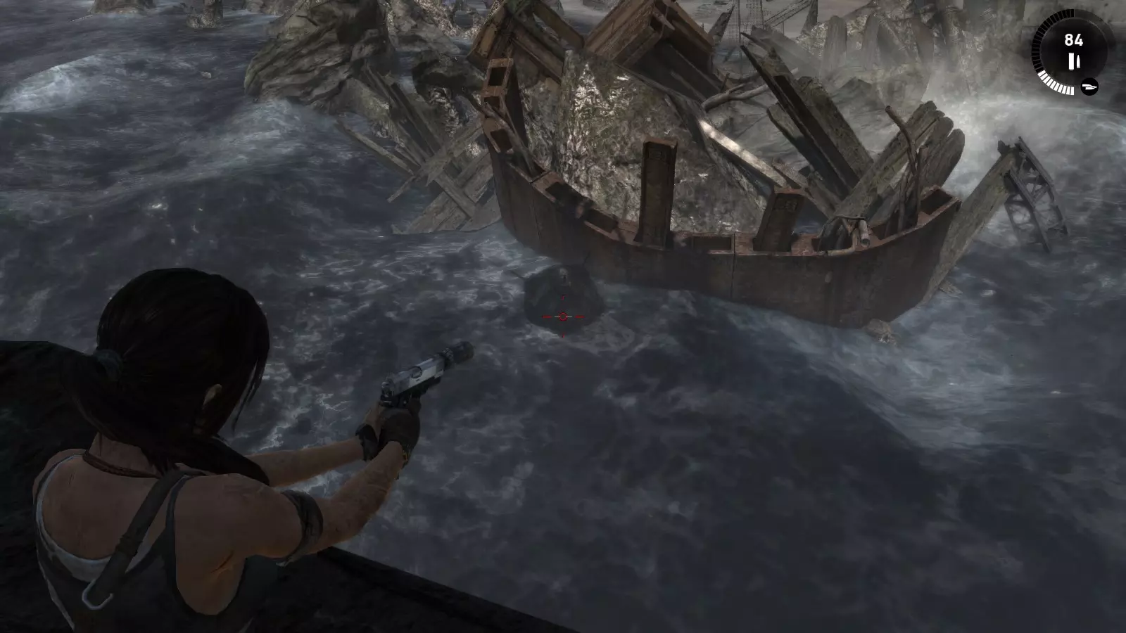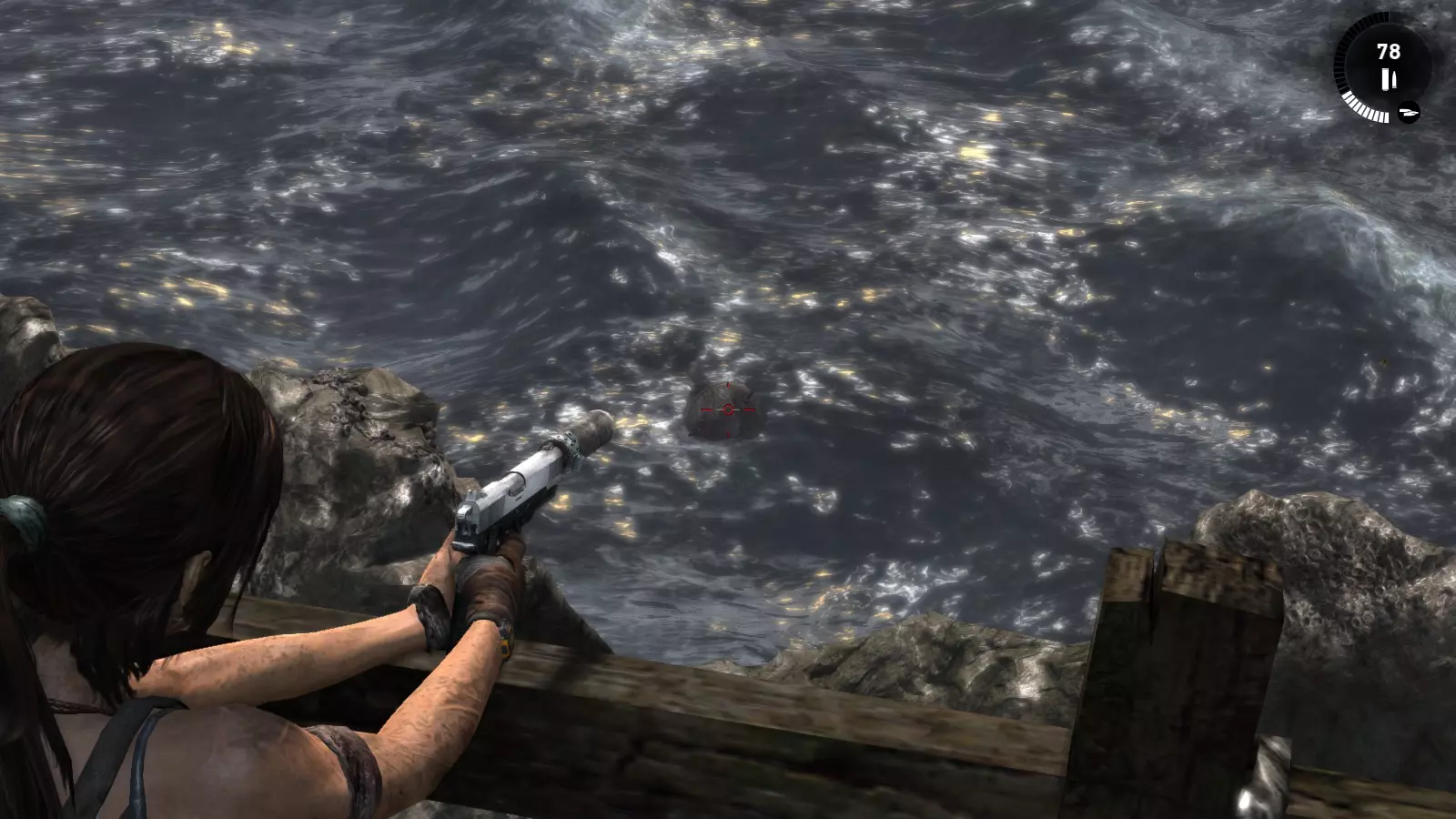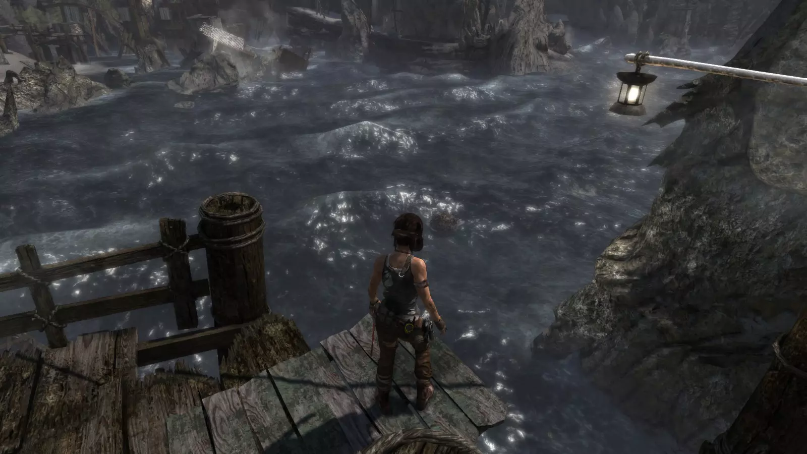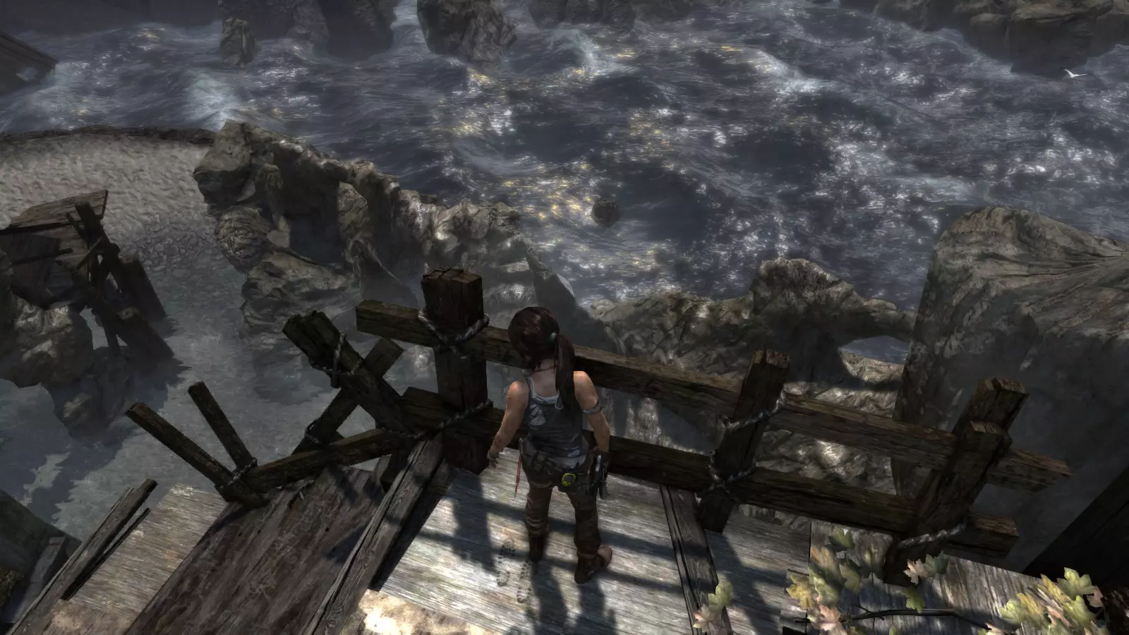 第一个古墓需要劳拉事先做一些准备工作。刚到海滩,你会看到河上有一座断桥。如果你跳下去,会发现尽头有一个红色浮标和一面可用霰弹枪摧毁的木墙。摧毁木墙,推动浮标使其落入下一个区域,然后走到后面。在那里,你需要放置两个浮标,这样你就可以从地面跳到一个浮标上,再从这个浮标跳到另一个浮标上,然后从那里跳到一面陡峭的墙上,攀爬上去就能到达古墓。