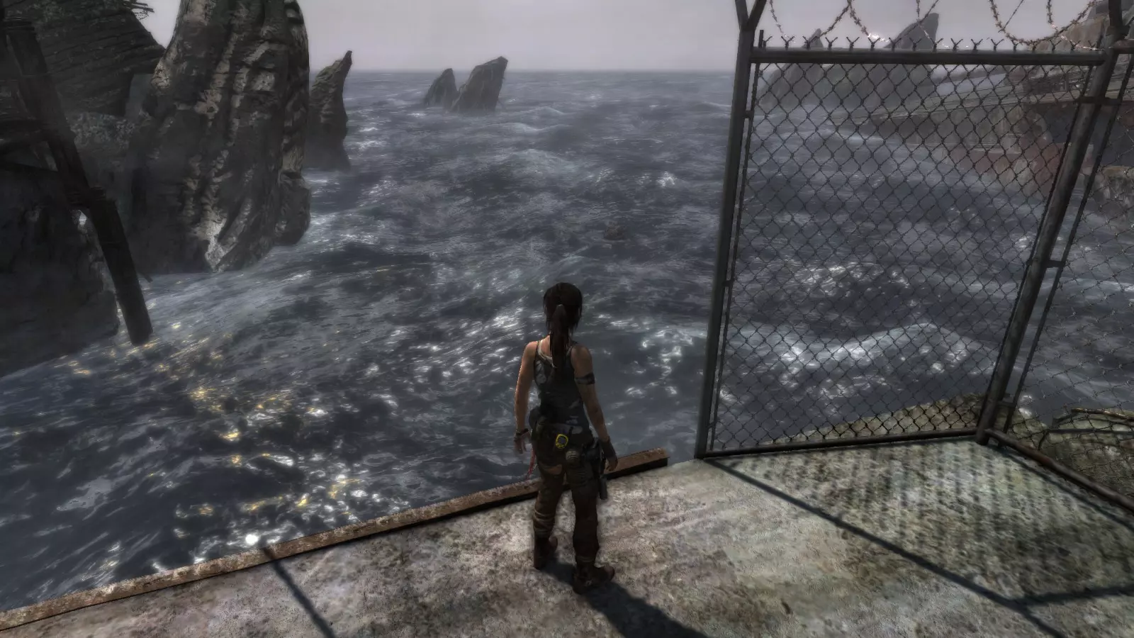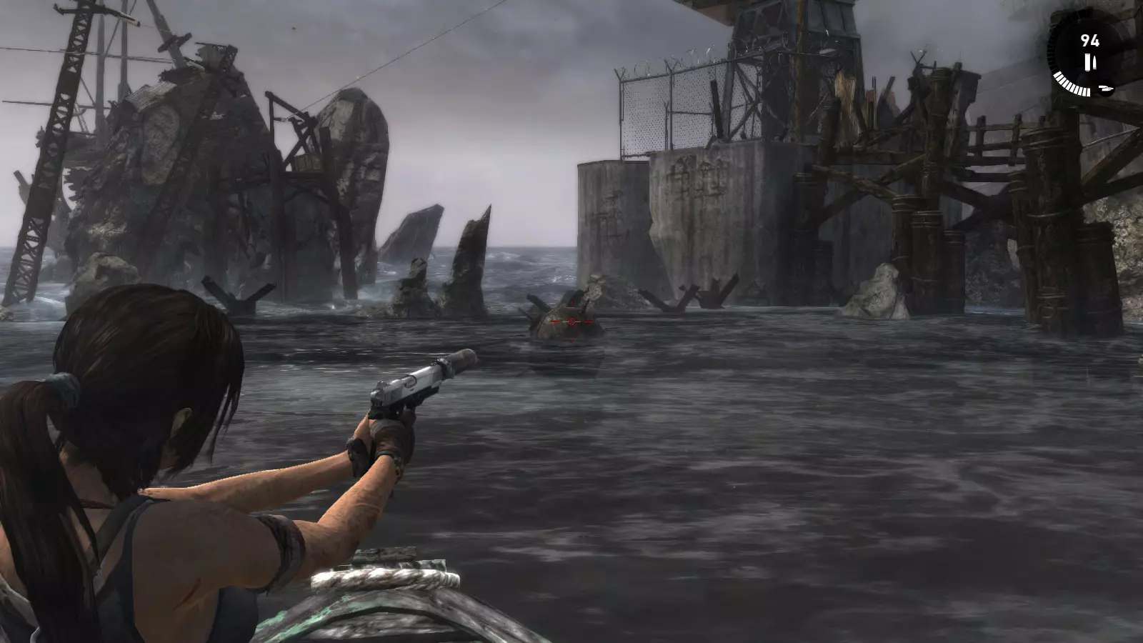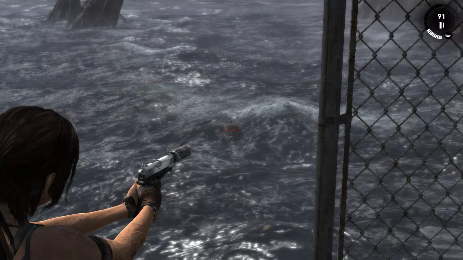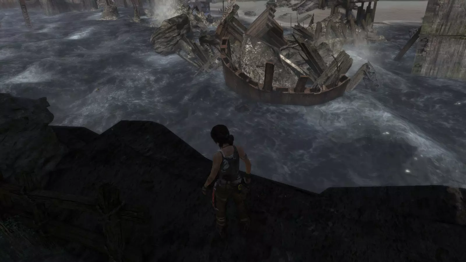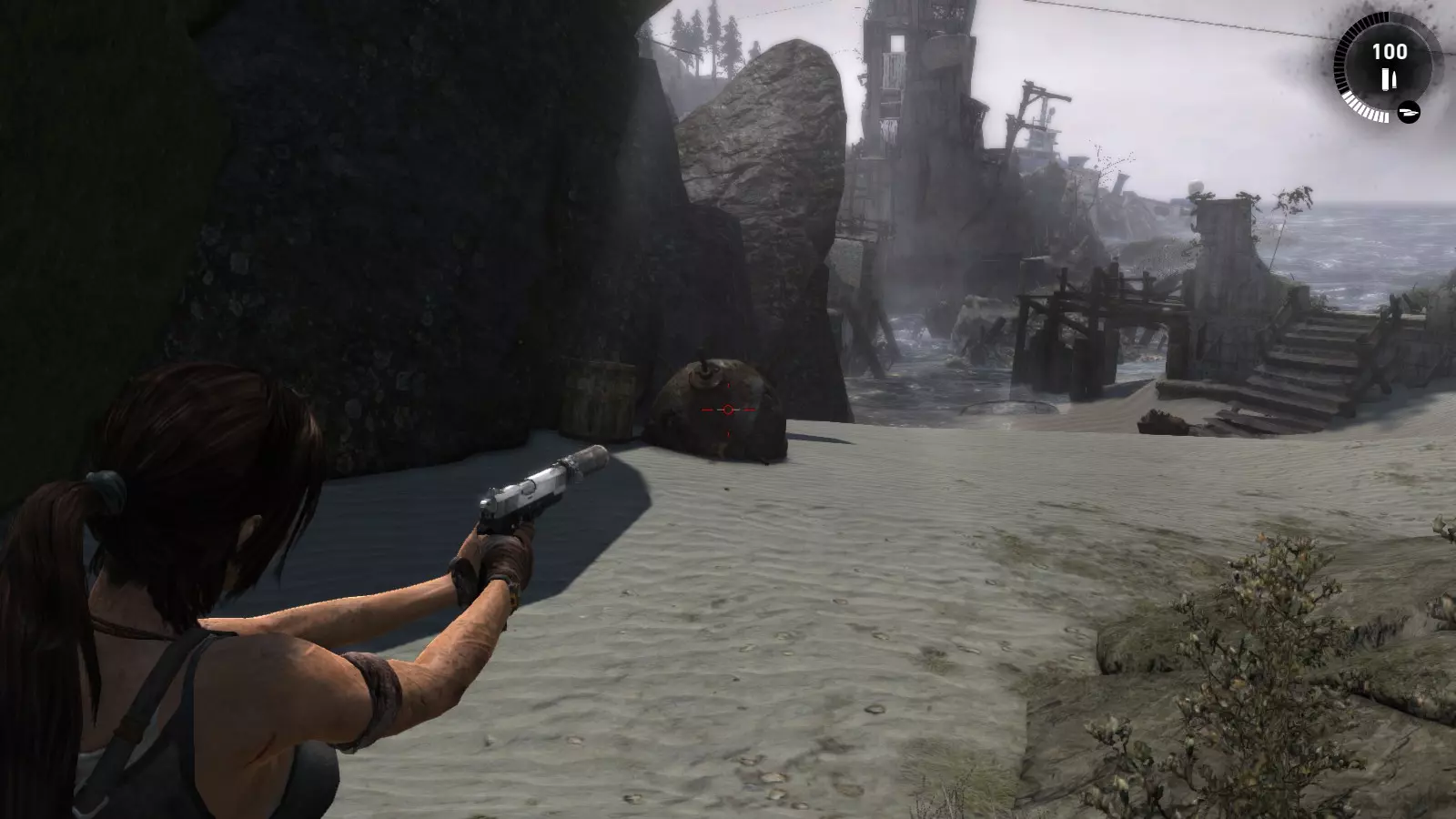 第一个古墓需要劳拉事先做一些准备工作。刚到海滩,你会看到河上有一座断桥。如果你跳下去,会发现尽头有一个红色浮标和一面可用霰弹枪摧毁的木墙。摧毁木墙,推动浮标使其落入下一个区域,然后走到后面。在那里,你需要放置两个浮标,这样你就可以从地面跳到一个浮标上,再从这个浮标跳到另一个浮标上,然后从那里跳到一面陡峭的墙上,攀爬上去就能到达古墓。