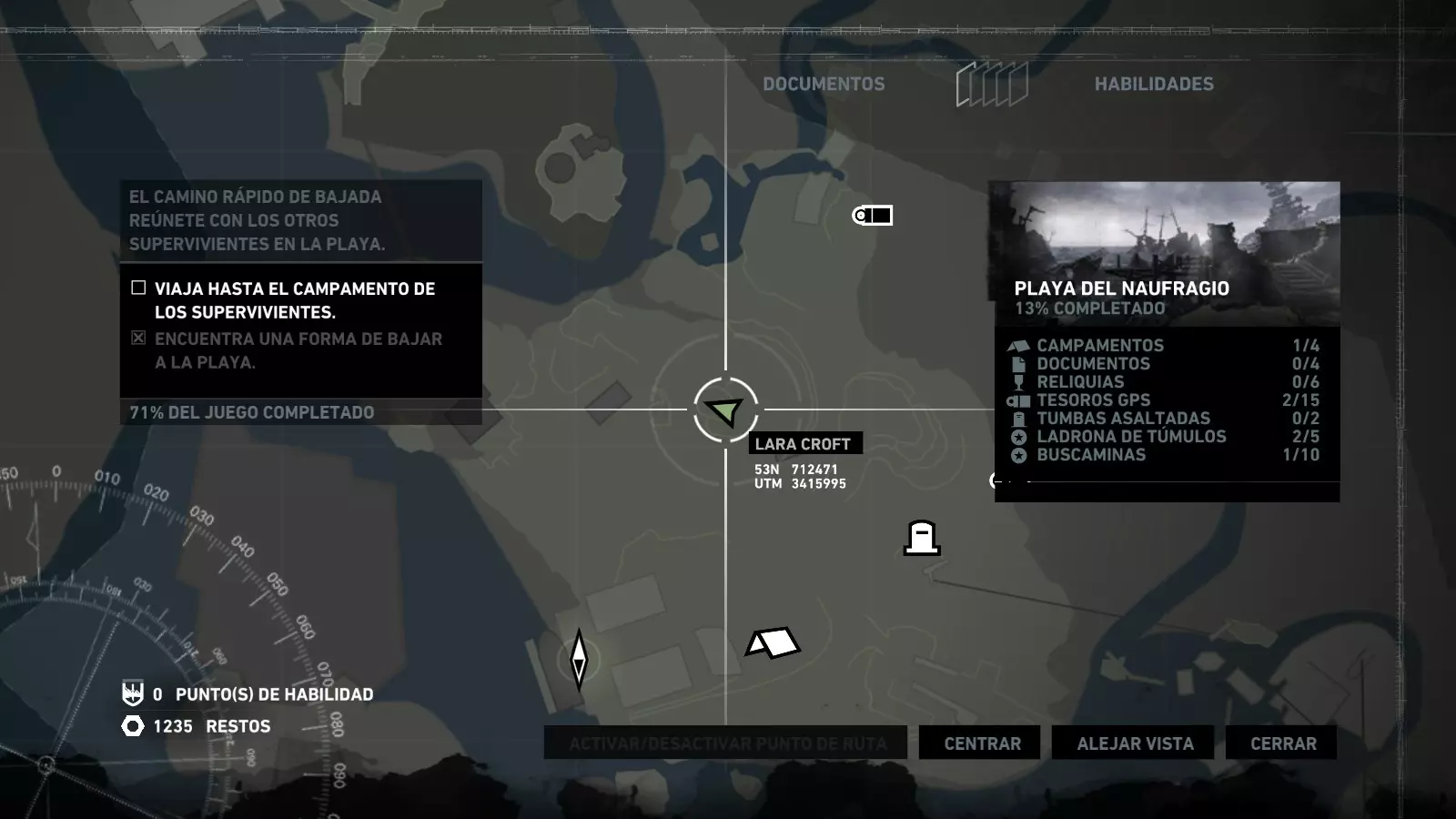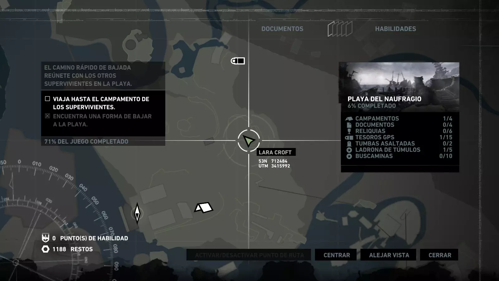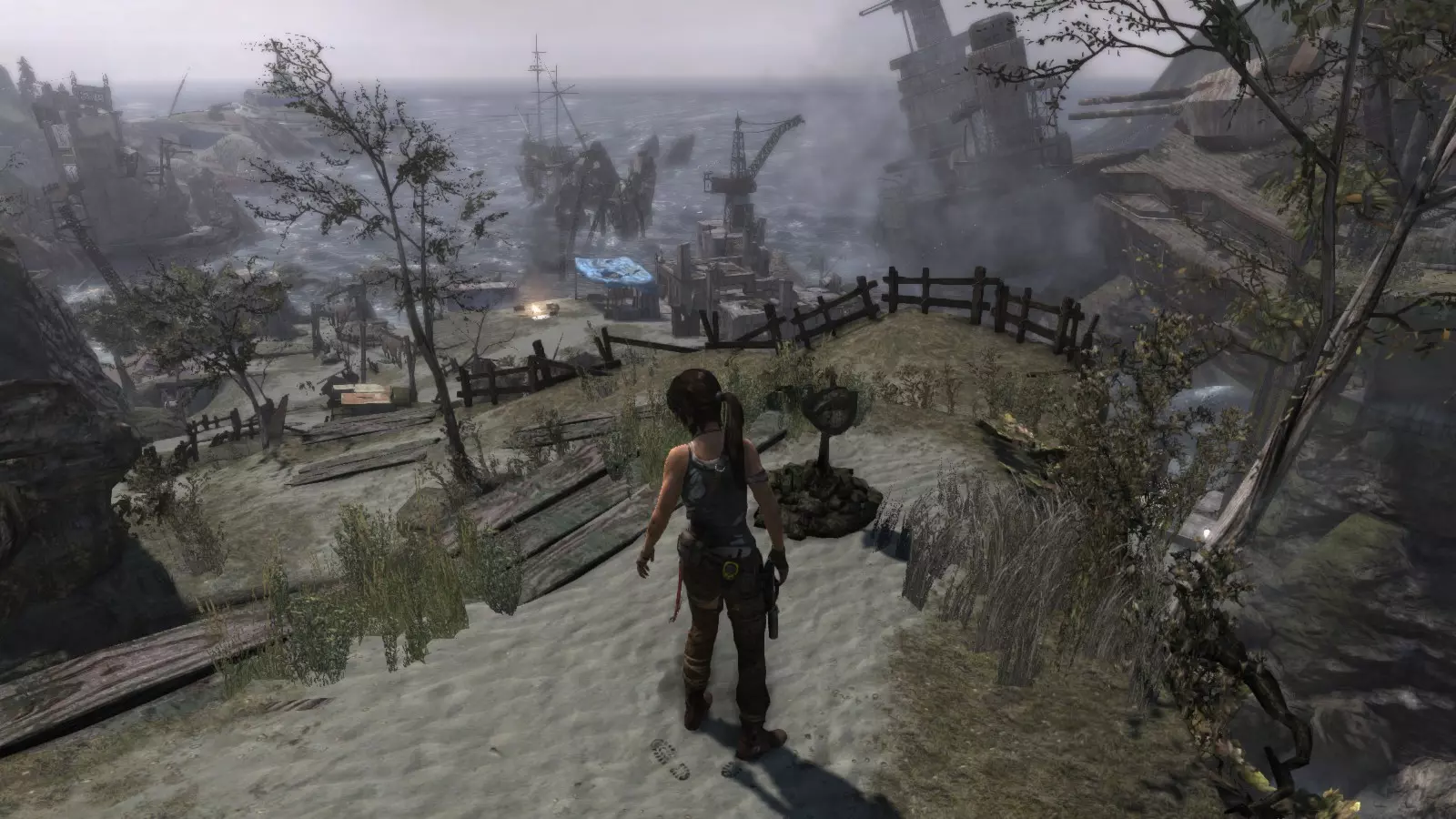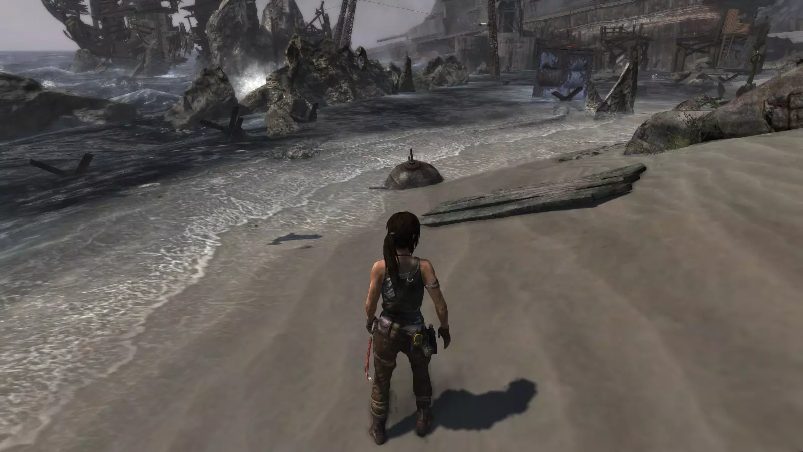 失事海滩 - 盗墓者 在惊险的缆车下行之后,劳拉抵达了海滩,她的同伴山姆、乔纳、亚历克斯和雷耶斯正在那里等她,他们正试图修理汽艇以便逃离这座岛屿。几个世纪以来,这个地方见证了数百起海难,许多失事船只的痕迹至今仍随处可见。 本次挑战的目标是找到散布在海滩上的5个失事船员坟墓。这些坟墓是小型土堆,上面插着一根木桩,木桩上放置着一顶旧头盔。由于该区域相当广阔,你需要在海滩上多探索一番,找到复合弓。没有复合弓的话,你无法进入东边更陡峭的区域去寻找亚历克斯,他正在“坚忍号”上寻找雷耶斯的工具。 古墓丽影1