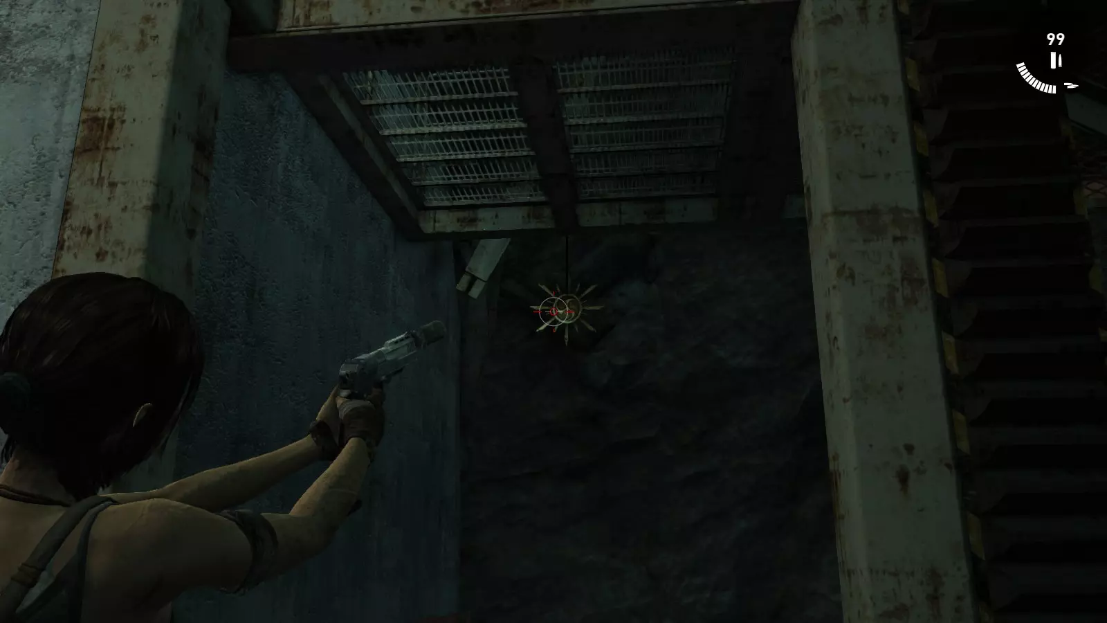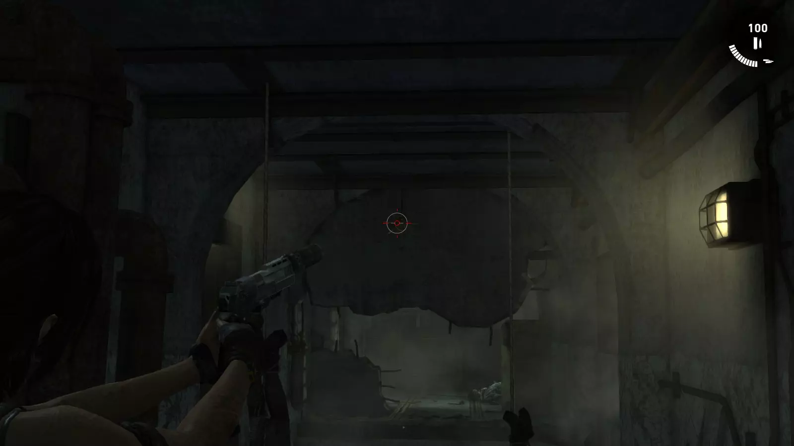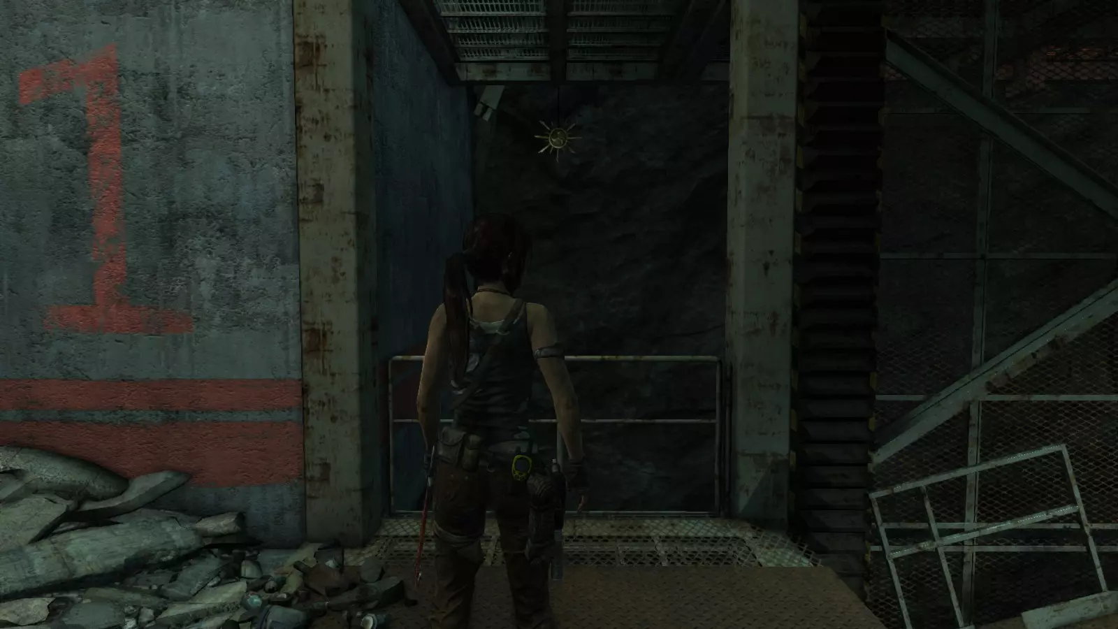 进入基地并翻越几堵墙后,你会来到一个区域,需要向下跳几层才能到达“实验室”营地。在此之前,看向你上方左侧的灯泡旁边。虽然有点难看清,但第一个图腾就在那里。如果你想更容易瞄准,总是可以先摧毁灯泡。