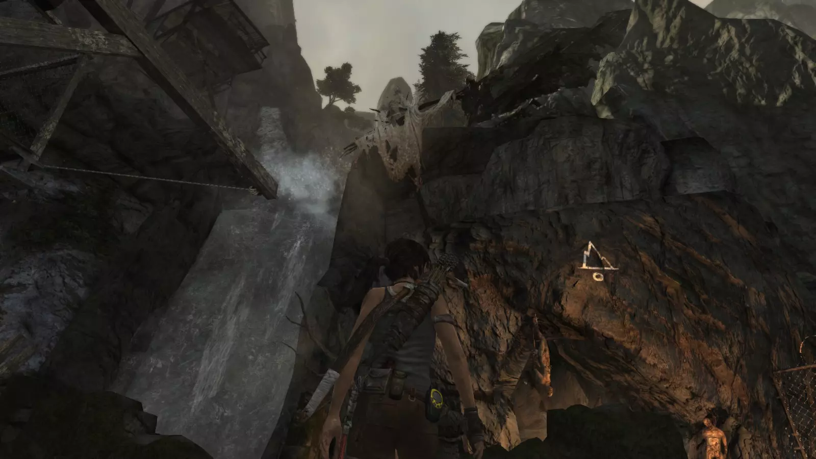 到达飞行员发出烟雾信号的附近区域后,我们发现这里是一个多悬崖的地带。要到达这座雕像有两条路:要么从附近可选坟墓旁的柱子上射出绳索(要到达那里,需先从瀑布的另一边射出另一条绳索),要么从断桥区域跳入河中,继续前行,利用树木作为桥梁穿过悬崖,然后爬上我们到达的陡峭岩壁。