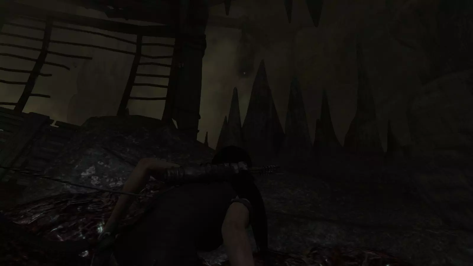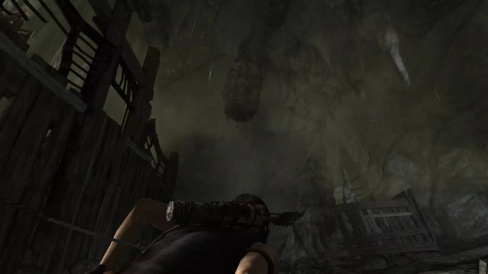 穿过洞穴的第一个营地“深渊”后,我们必须沿着狭窄的通道继续前进,途中会目睹一场恐怖的盛宴。当你沿着右侧环绕房间的通道前进时,会看到横梁上悬挂着第一个袋子。你可以放心摧毁它,不必担心惊动那些污秽之物:它们正忙着享用不幸的受害者。