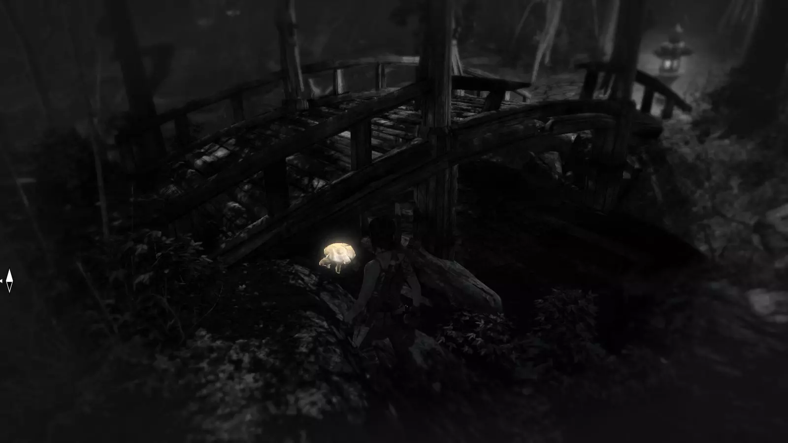 沿着穿过森林的河流西岸走,你会很容易在一片小空地上找到第六朵蘑菇,从那里你可以看到前面的木桥。