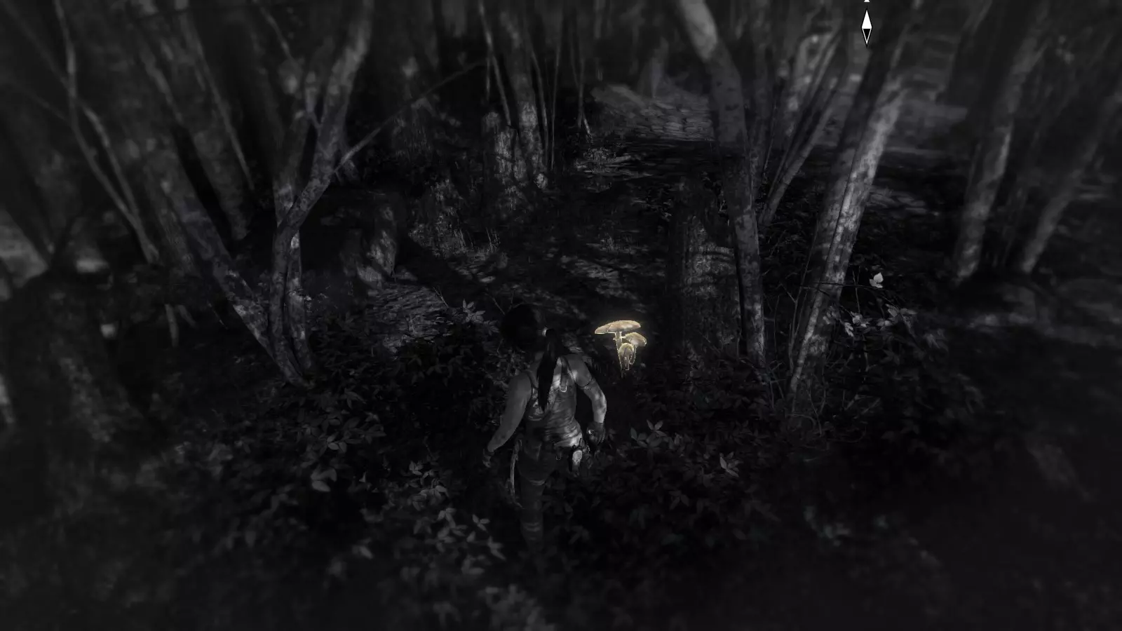 第一个蘑菇位于失事直升机附近的树林中。如果你站在直升机西侧一点的位置,就能找到它。