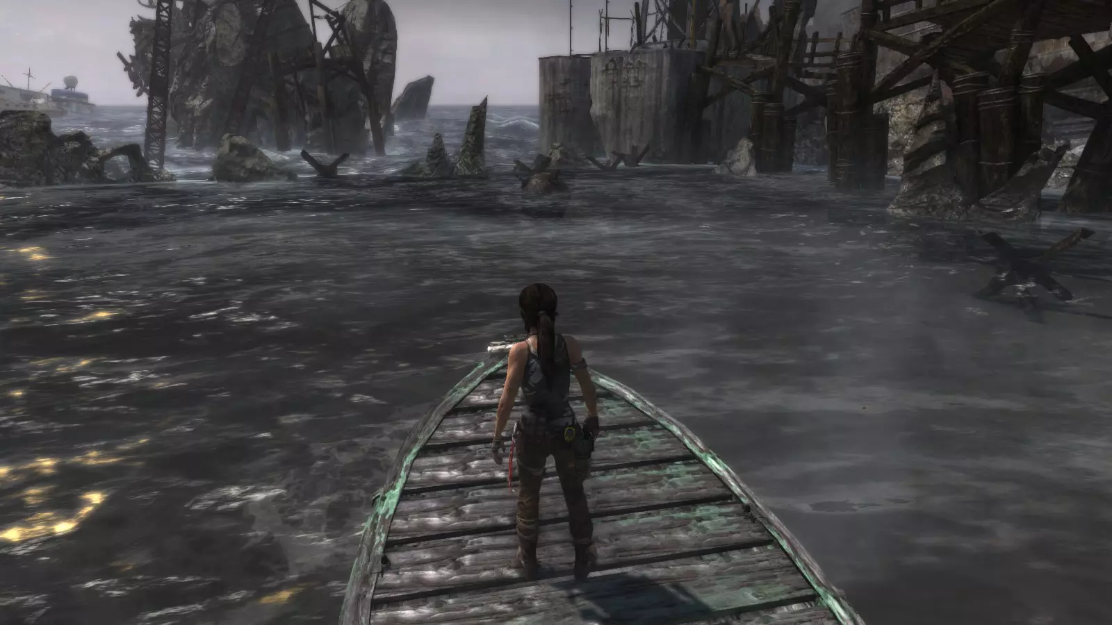 经过沉船残骸后,当你到达瞭望塔时,从它的右侧绕过去。在中途,你会在水中发现更多的沉船残骸。水雷就漂浮在它们旁边。