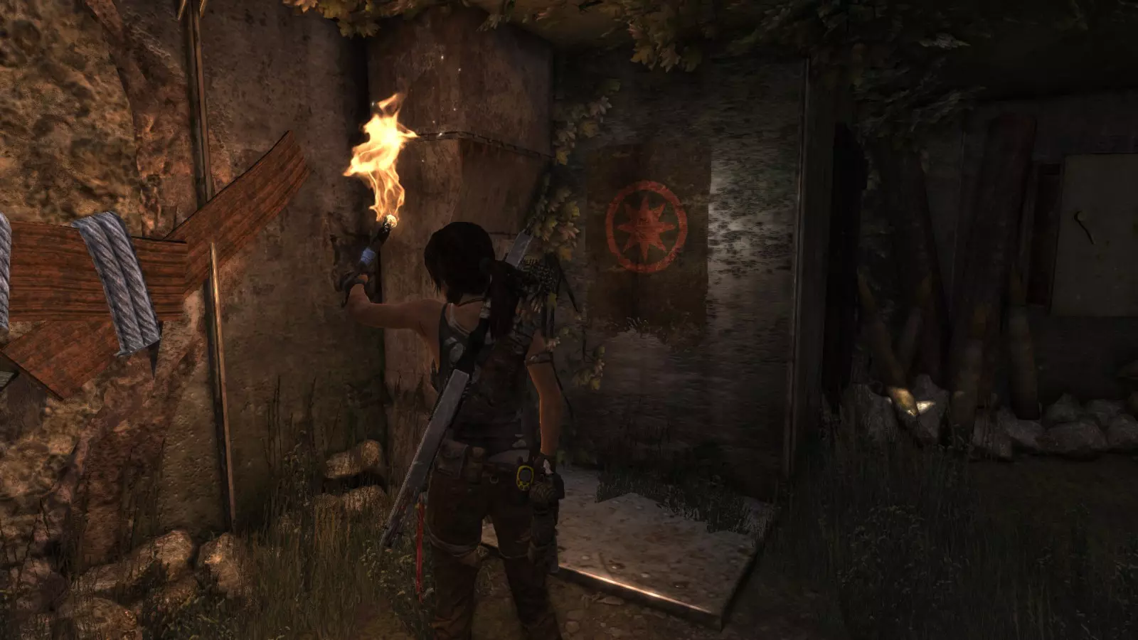 悬崖地堡 - 昔日居民 在耐力之路,离开海滩后,劳拉必须穿过一座古老的军事地堡,继续寻找亚历克斯。这座地堡建于二战时期,现已被太阳神庙成员占据,但仍留有昔日居住者的痕迹。 挑战目标是烧毁4面小型旗帜,这些旗帜上印有红色八芒星,周围环绕着红色圆圈。其中两面旗帜用火炬即可轻松点燃,另外两面则需要使用火箭点燃。而其中一面旗帜是整个游戏中隐藏最深的挑战元素之一。 昔日居民 1